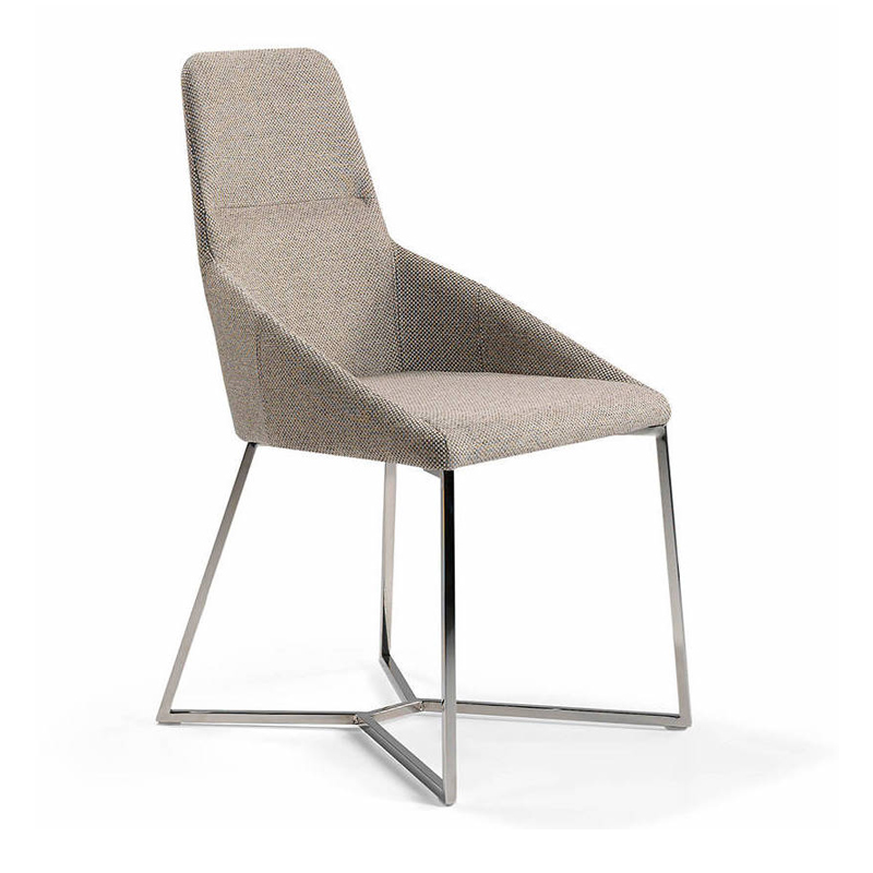 Стул с ножками из хромированной стали и сиденьем, обитым тканью.