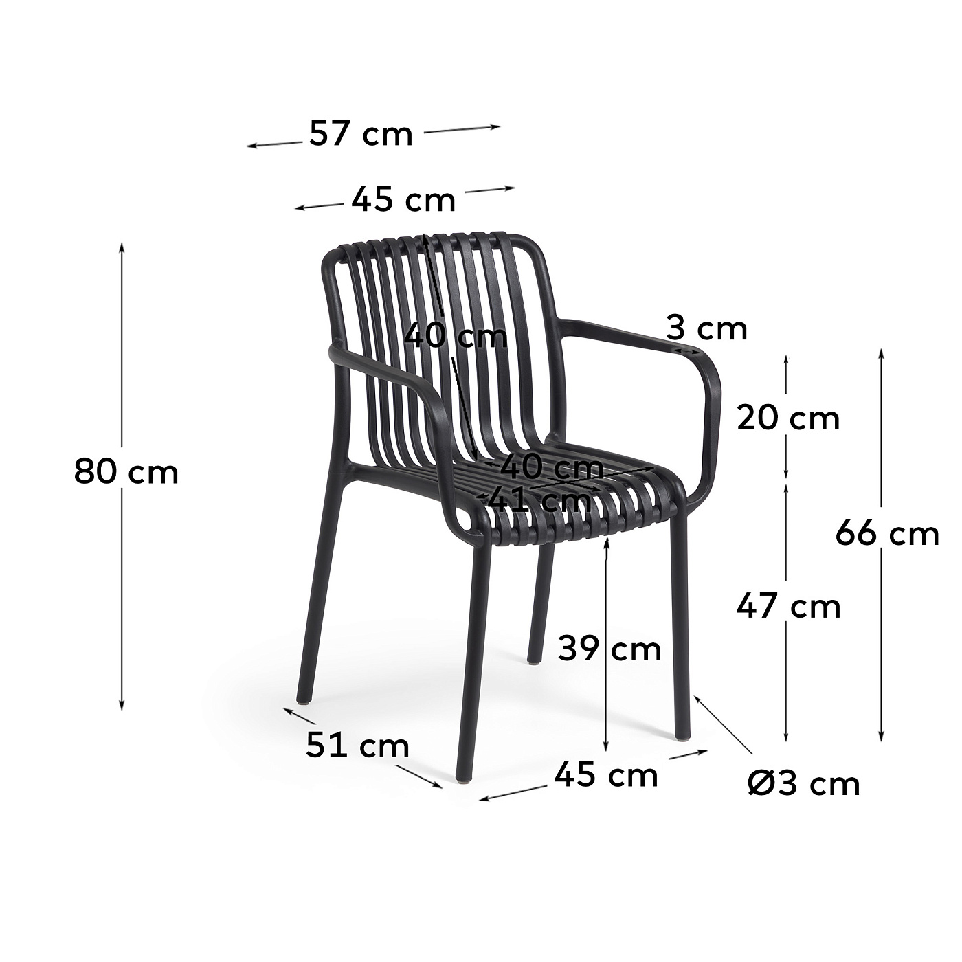 Запросить индивидуальное предложениеСадовый стул Isabellini от фабрики La Forma (ex Julia Grup) – модель, которая готова к длительной эксплуатации при любых условиях. Садовый стул Isabellin станет настоящим подарком для тех, кто ищет долговечную уличную мебель, ту, которую можно использовать при любой погоде. Здесь уникальный пластиковый состав выдерживает экстремальные температуры, влагу, не выгорает под прямыми лучами солнца. А штабелируемая конструкция позволит быстро освободить пространство. Isabellin – незаменимая вещь для вашего отдыха под открытым небом. Садовый стул Isabellin цельнолитой, выполнен из 100% переработанного пластика. В коллекции представлено четыре цвета: серый, желтый, черный, бежевый. Поэтому вы легко подберете модель, максимально подходящую конкретно под ваш уличный интерьер. Спинка и сиденье стула имеют реечную структуру, за счет чего влага не собирается на поверхности, а протекает через отверстия. Также существенно облегчается чистка изделия. Подлокотники обеспечивают дополнительный комфорт, имеют ширину 3 см. Ножки трубчатой формы, с диаметром 3 см. Их высота – 39 см. Максимальная нагрузка на стул не должна превышать 130 кг. Размеры: ширина – 57 см, высота – 80 см, глубина – 51 см, глубина сиденья – 40 см. Вес изделия – 5,05 кг. Сборка не требуется.