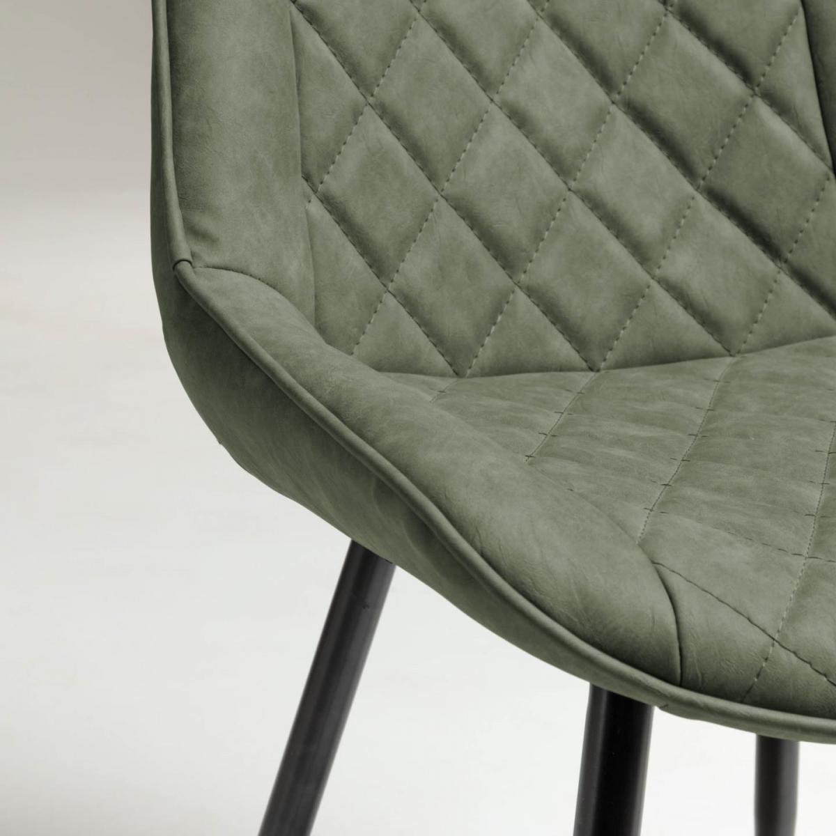 Стул конструктивно простой и понятный — это цельное сиденье и опора. Спинка имеет эргономичную форму — она слегка откинута назад и выгнута. По всей площади сиденья проложен мягкий синтетический наполнитель. Он обтянут ПУ тканью, имеющей декоративную ромбовую строчку. Обивка — современный, тактильно приятный материал, напоминающий кожу. Он требует деликатного ухода (чистка без отбеливания и использования абразивных веществ).