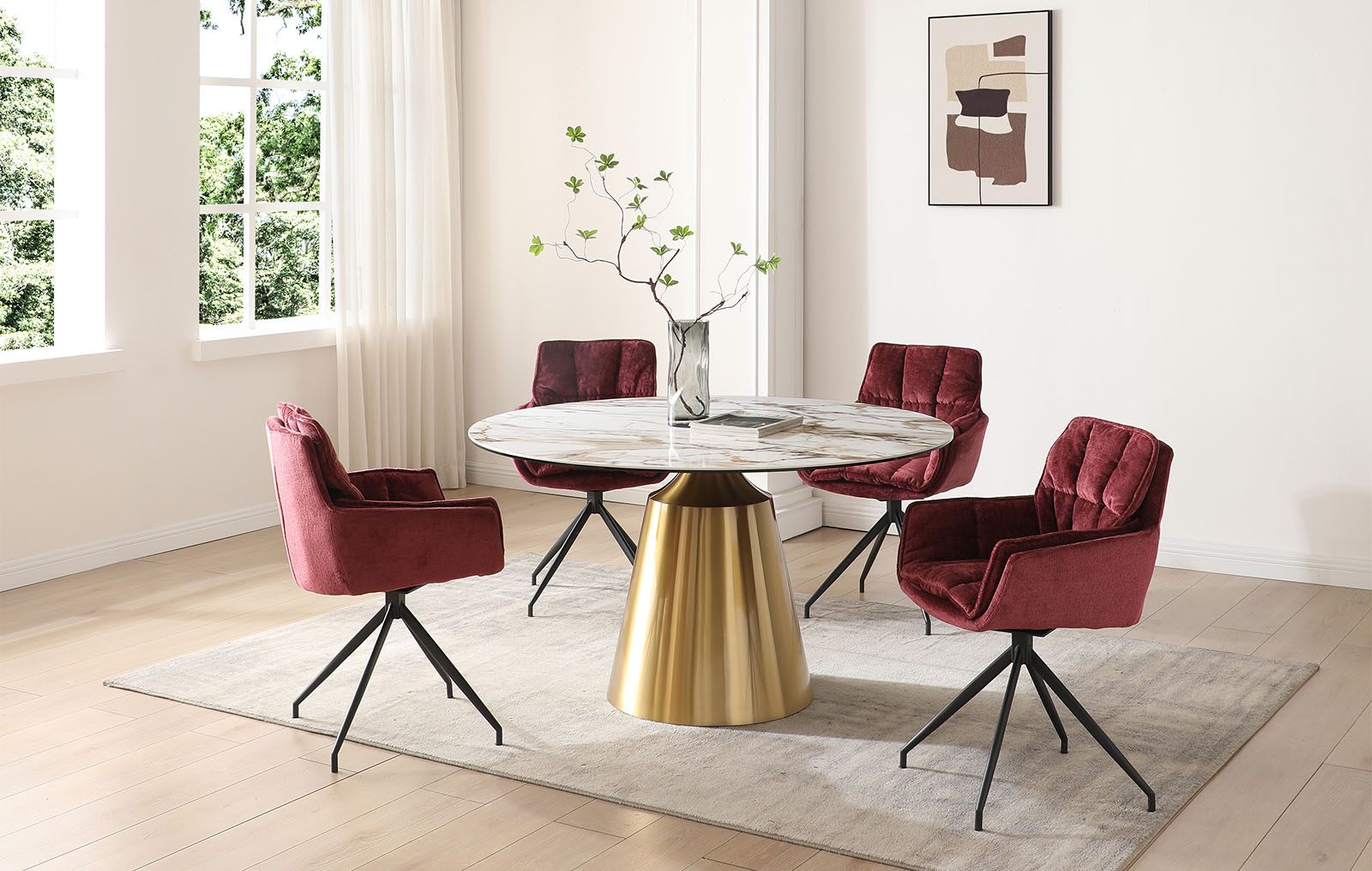 Его обивка насыщенного пурпурного оттенка станет интересным акцентом в интерьере гостиной или обеденной зоны.
