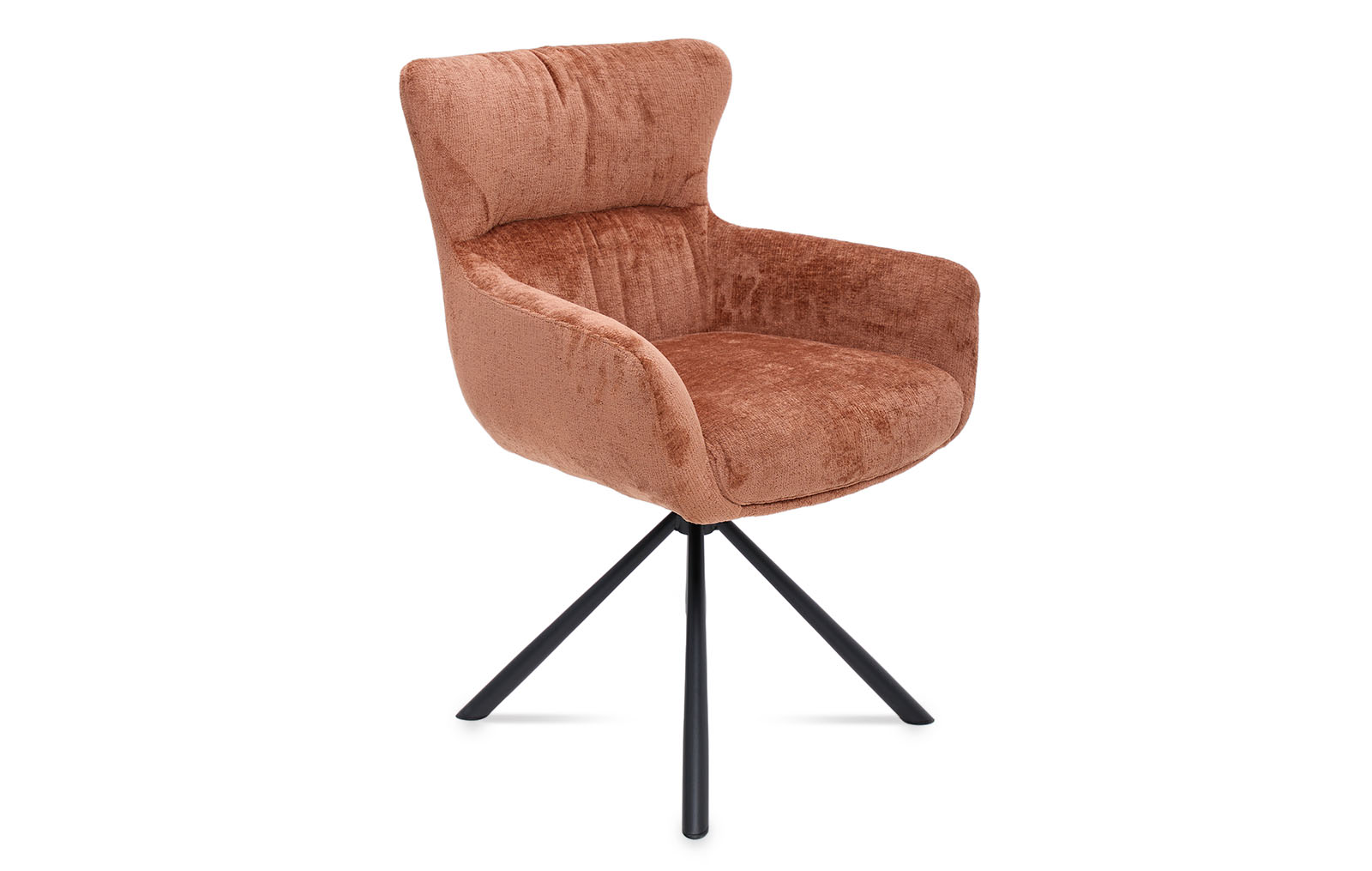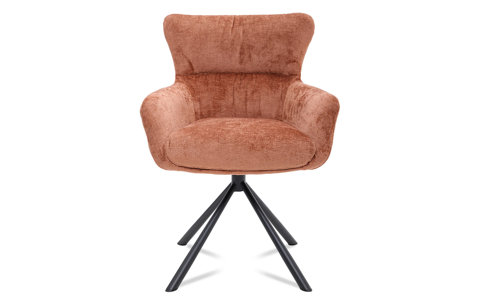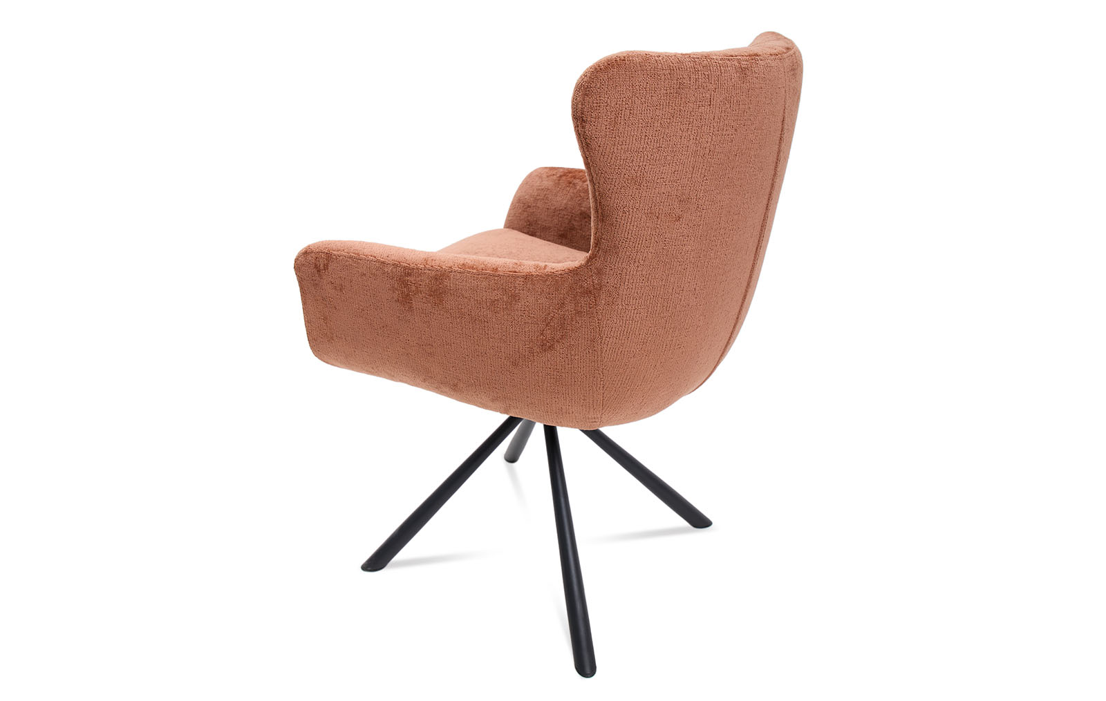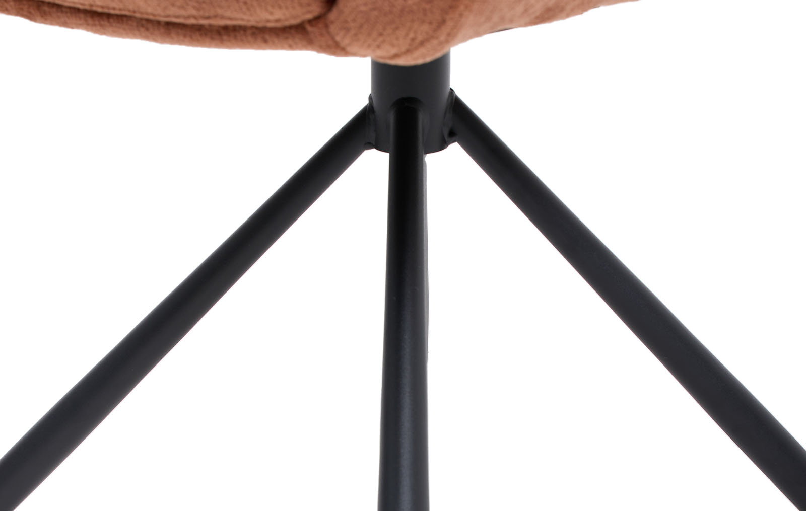 Приятная на ощупь акцентная обивка терракотового цвета привлекает внимание. Сиденье снабжено пружинами карманного типа. Ножки из металла с матовым черным напылением.
