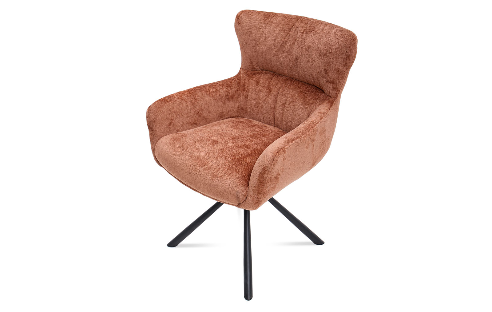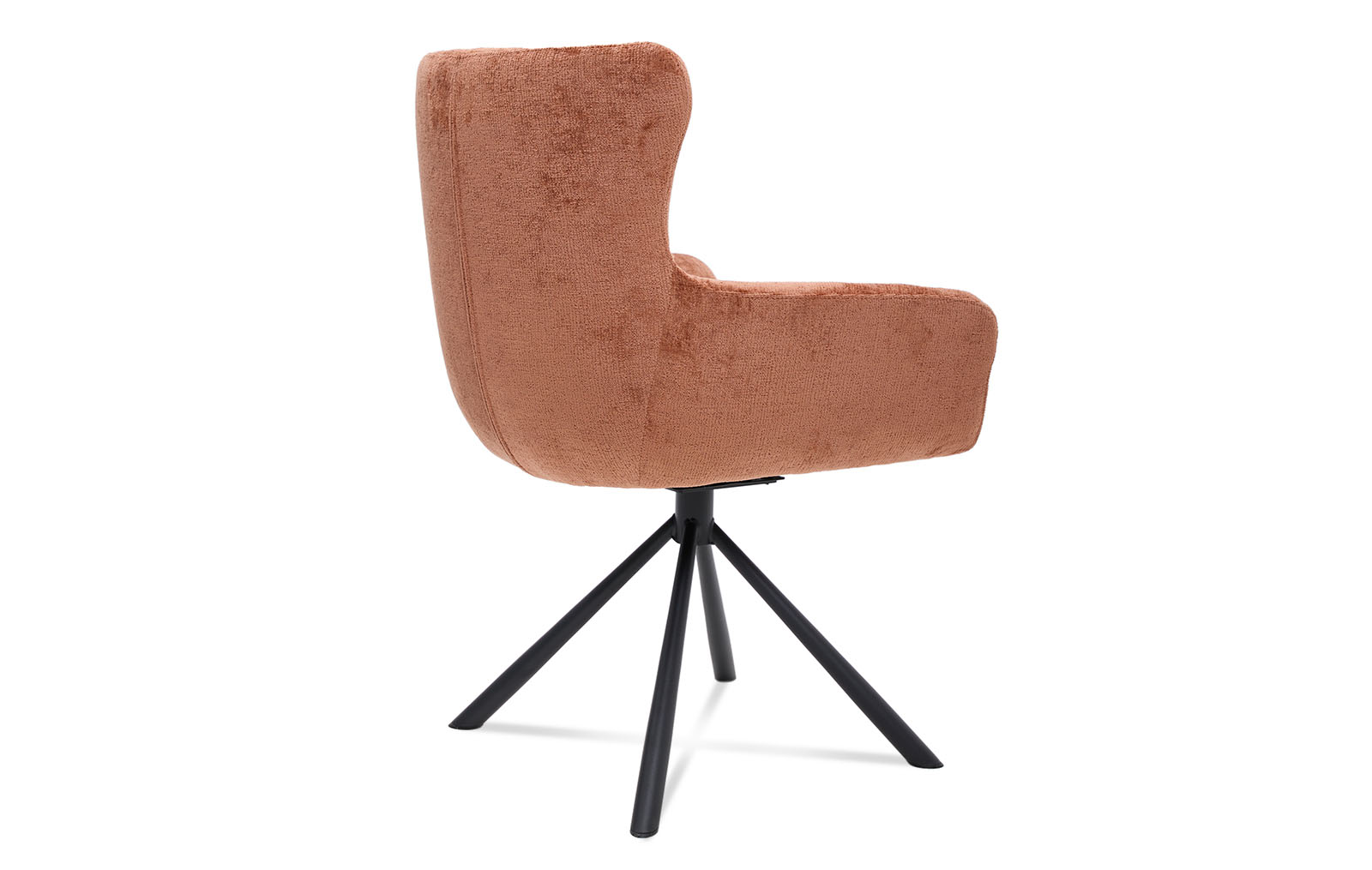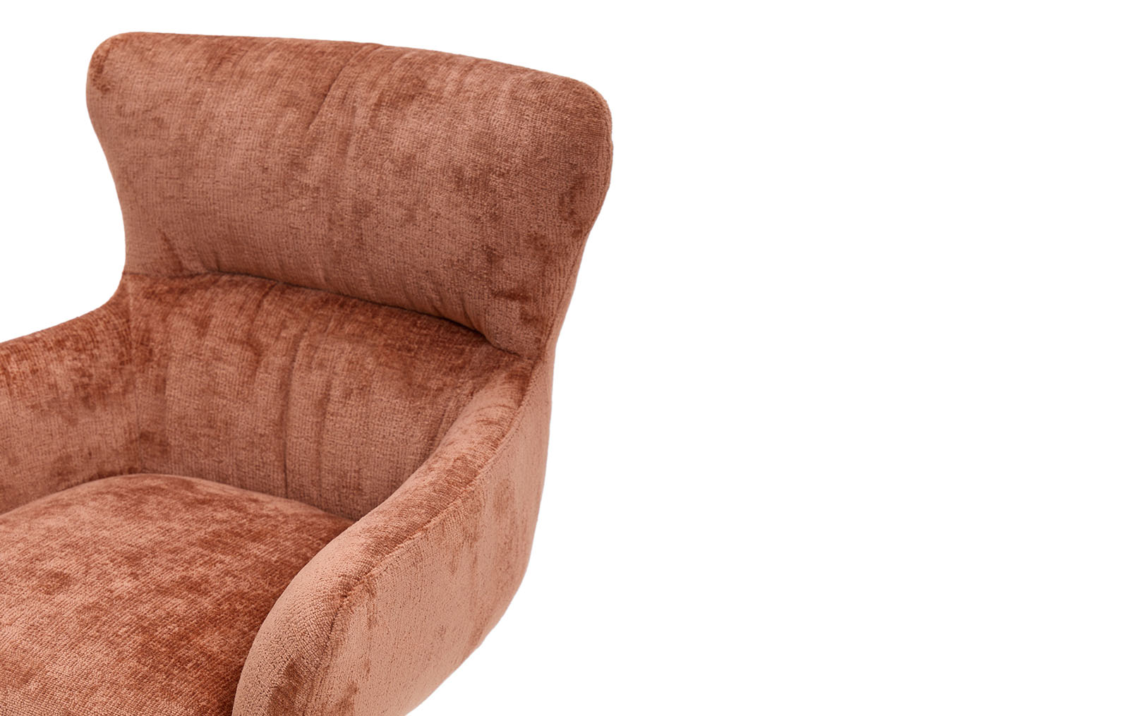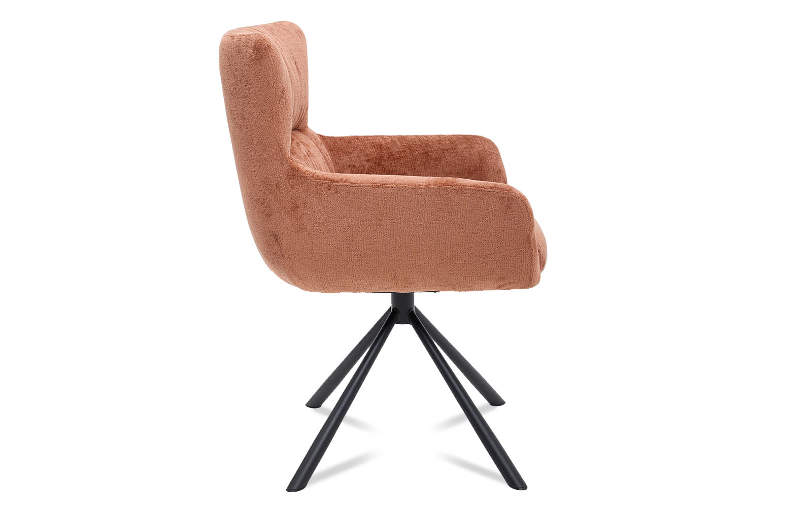 Приятная на ощупь акцентная обивка терракотового цвета привлекает внимание. Сиденье снабжено пружинами карманного типа. Ножки из металла с матовым черным напылением.