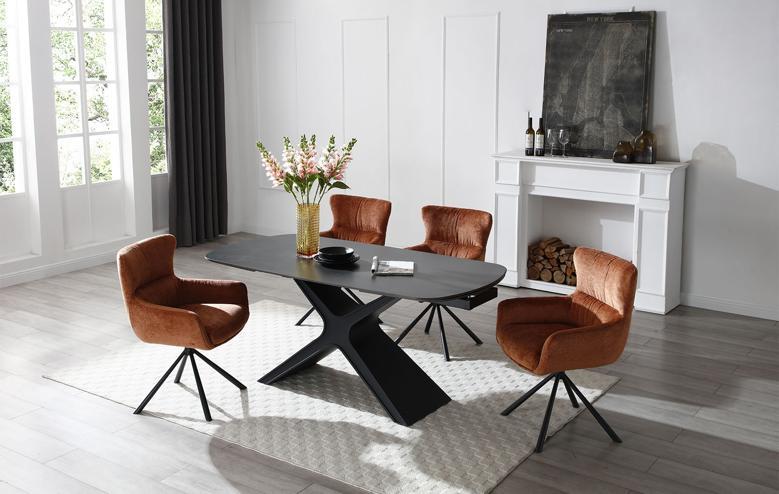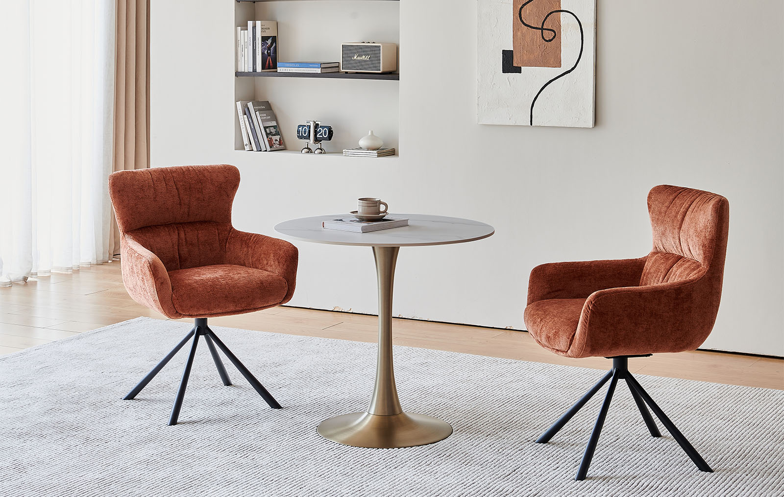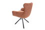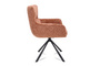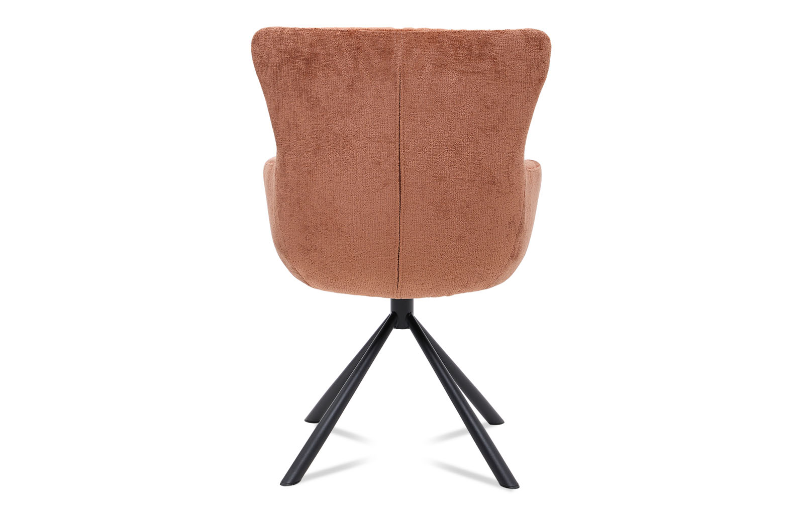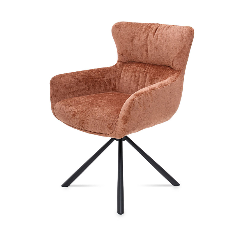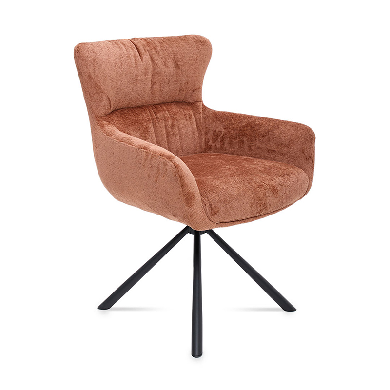 Приятная на ощупь акцентная обивка терракотового цвета привлекает внимание. Сиденье снабжено пружинами карманного типа. Ножки из металла с матовым черным напылением.