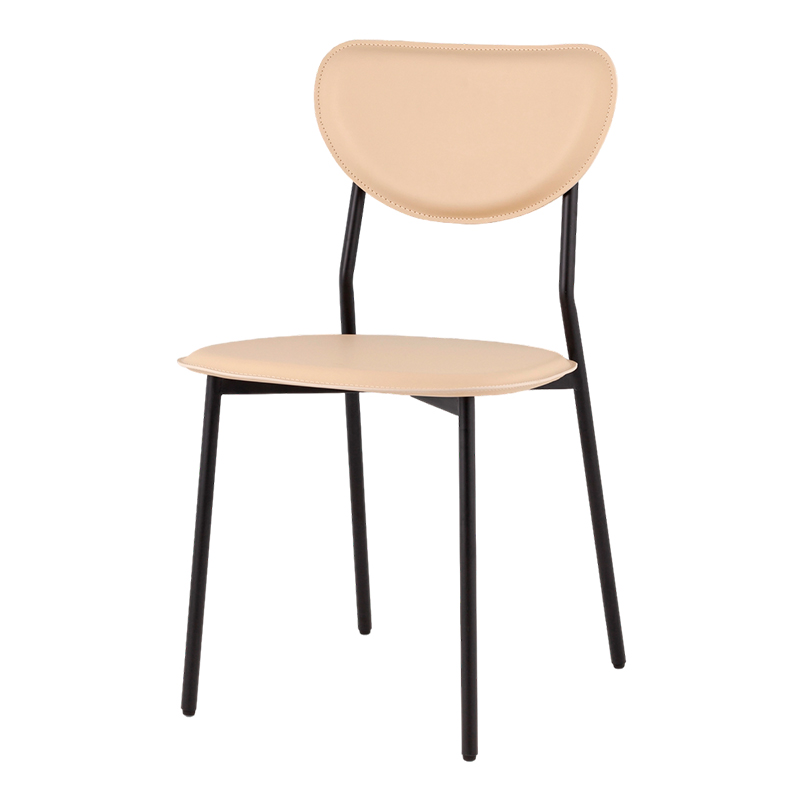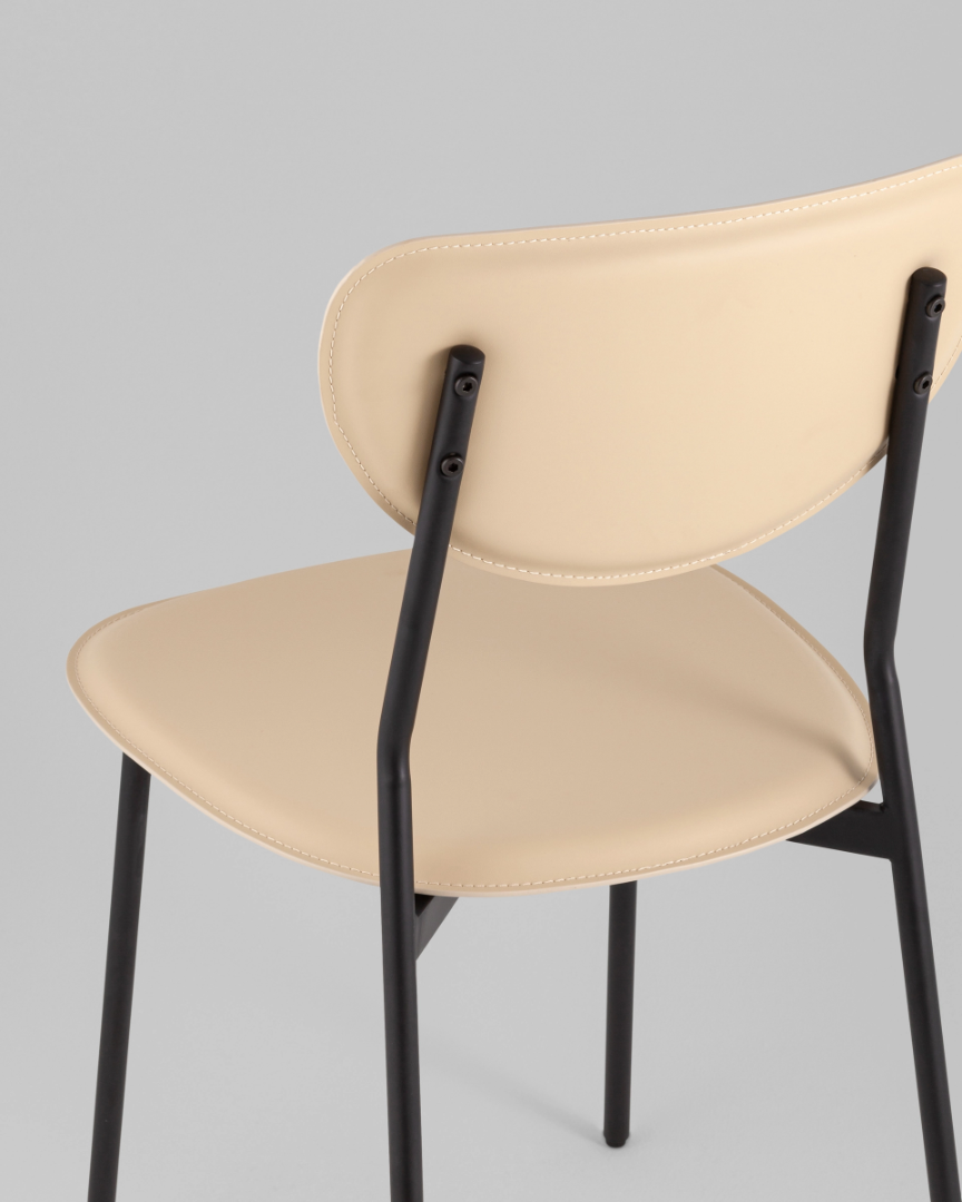 Материалы и цвета. Сиденье и спинка выполнены из прочной экокожи в изящном бежевом оттенке, который придаёт модели элегантный вид. Черный металлический каркас обеспечивает прочность и устойчивость.