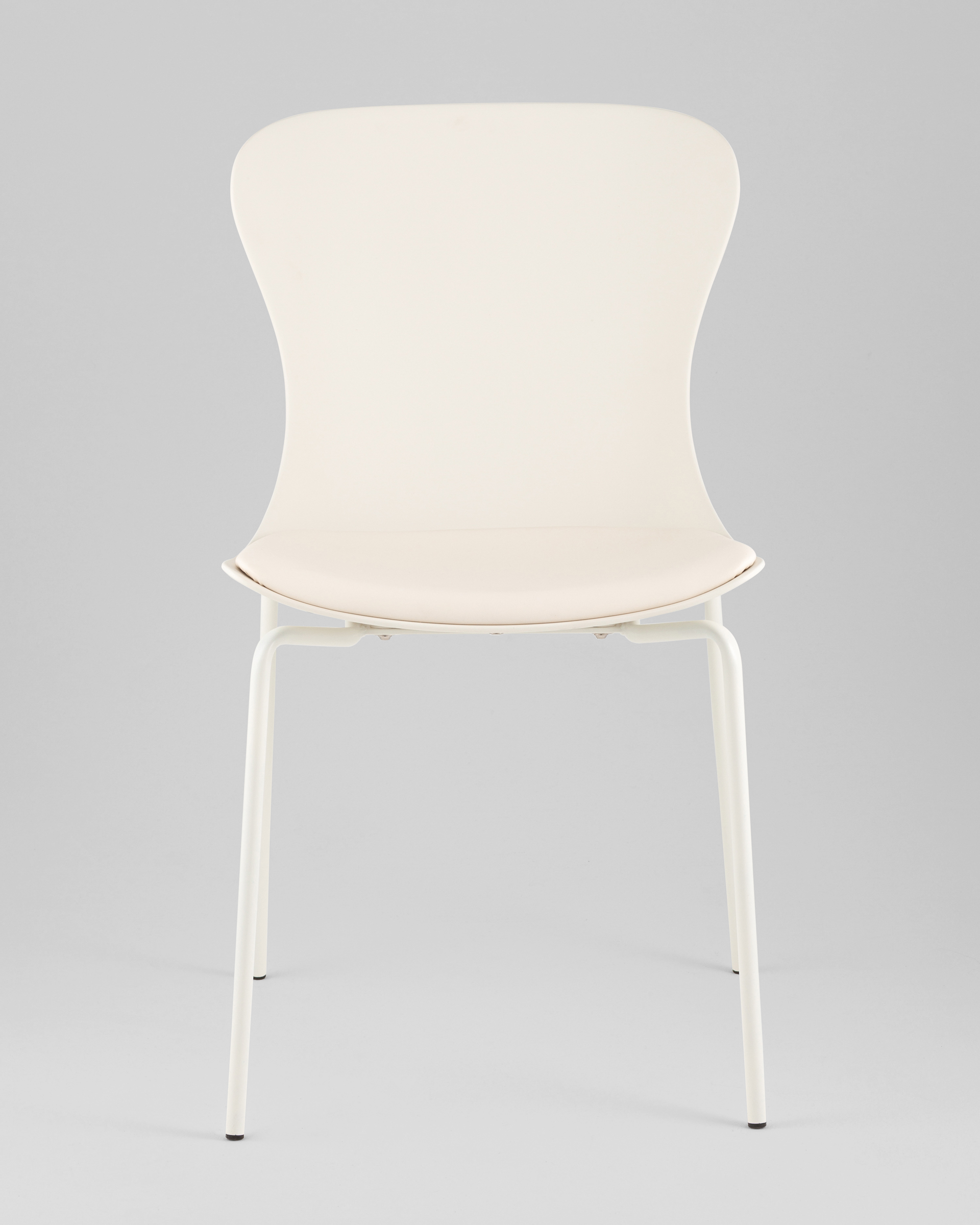 Материалы и конструкция. Спинка и сиденье стула выполнены в молочном цвете из прочного пластика - износостойкого материала, который неприхотлив в уходе. Мягкое сиденье изготовлено из экокожи. Ножки металлические, покрыты бежевой порошковой краской и имеют защитные подпятники, чтобы не оставлять различные следы и потертости на напольном покрытии. Максимальная нагрузка – до 150 кг.