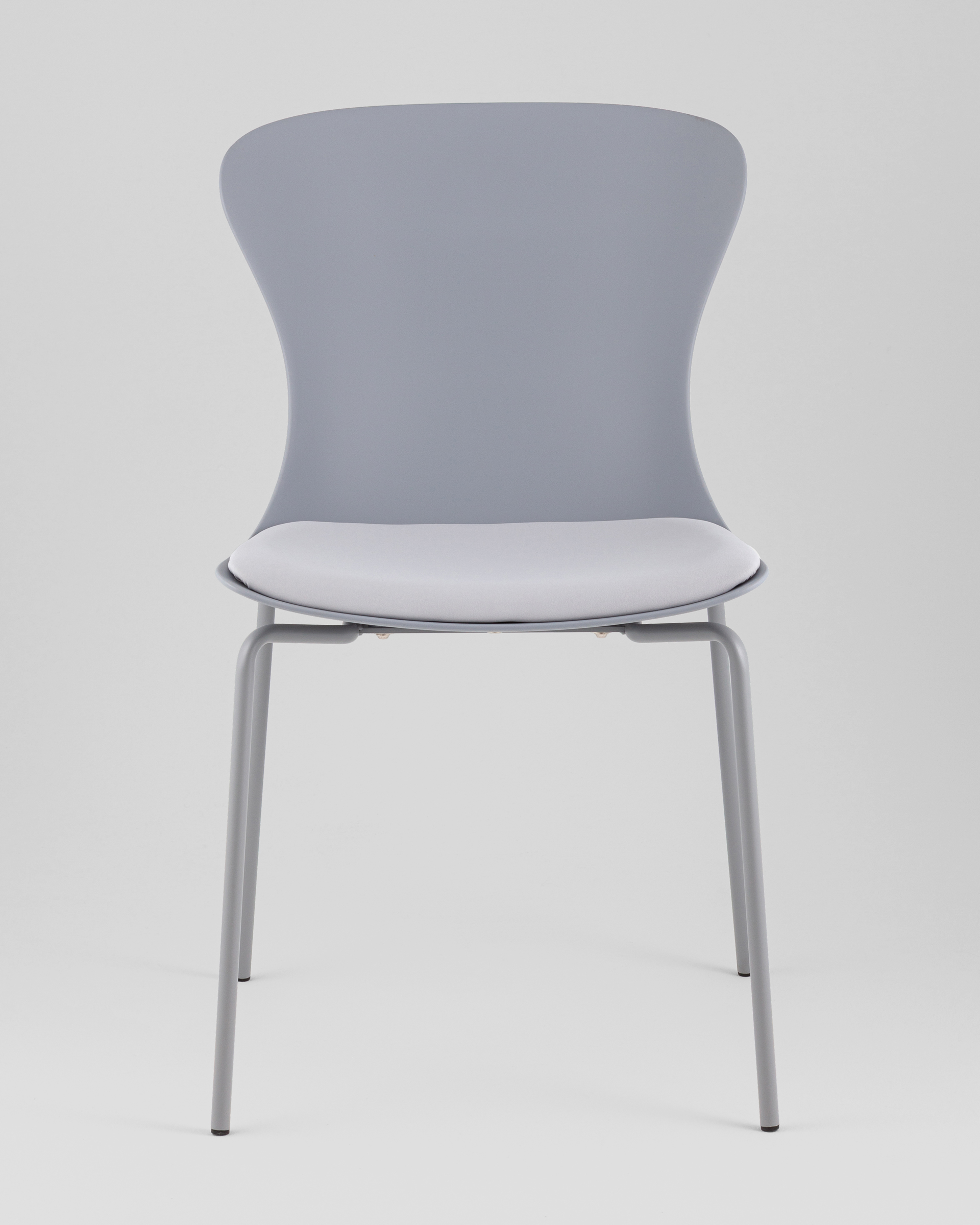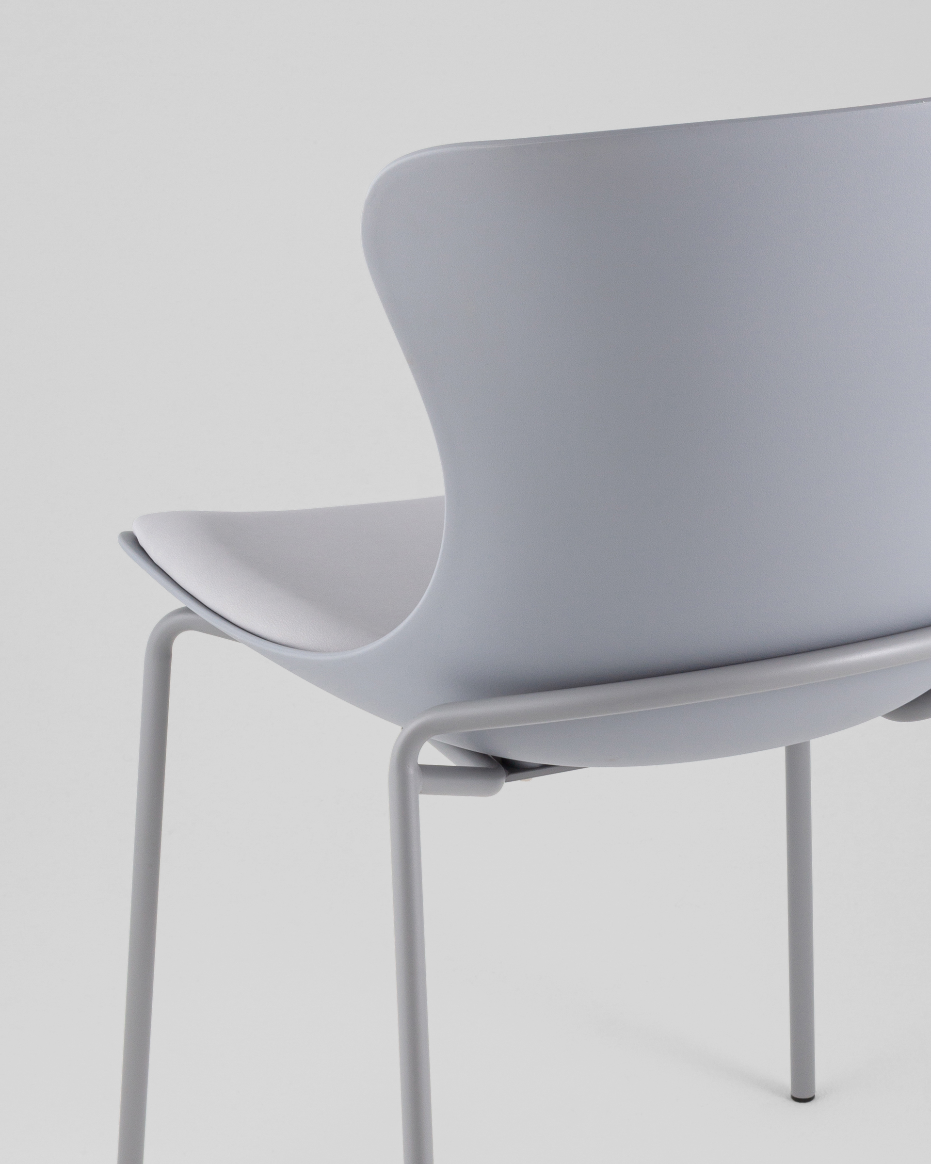 Дизайн и комфорт. Сиденье и спинка выполнены в форме плавных, органичных изгибов, что придает мебели элегантный и гармоничный вид. Конструкция сиденья предполагает легкий изгиб в области спины, обеспечивая удобство при сидении. Стул установлен на тонкие, но устойчивые ножки, которые придают ему легкость и современность. Выполнен в одном цвете — сером, что делает его универсальным элементом для различных пространств.