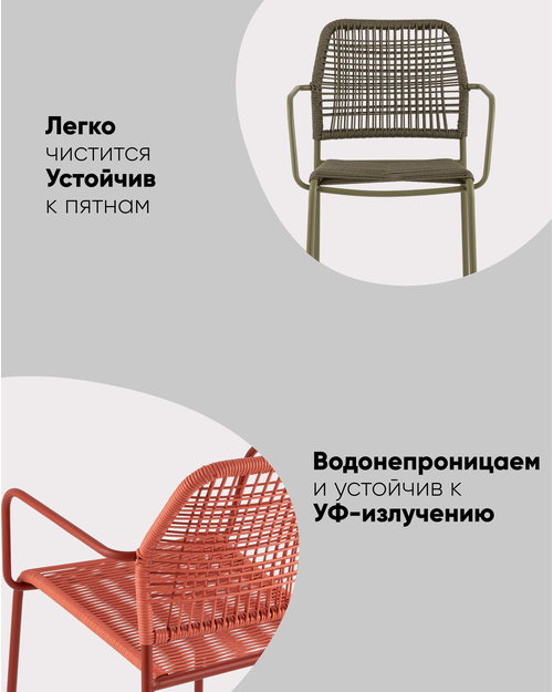 Стул Solaia выполнен из прочного металлического каркаса и обтянут PE twist rattan — искусственным ротангом на основе полиэтиленового сырья. Такой материал имитирует плетение из веревки, но при этом обладает значительно более высокими эксплуатационными свойствами. Он полностью водонепроницаем, устойчив к ультрафиолету (до 2000 часов воздействия без выцветания), легко очищается водой. Это делает стул идеальным выбором для использования на открытом воздухе — он не боится влаги, жары и солнца.