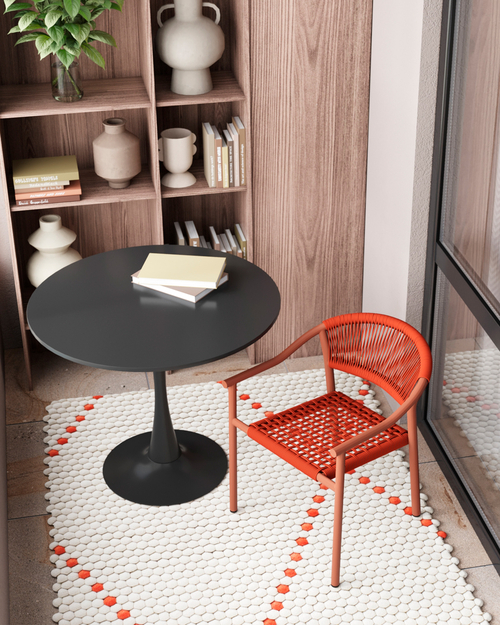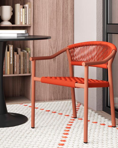 Эргономичная изогнутая спинка и подлокотники обеспечивают комфортную посадку. Верёвочное плетение добавляет текстурный акцент, а минималистичная форма делает стул универсальным решением для разных экстерьеров. Каркас элегантно сочетается с тоном верёвки.