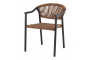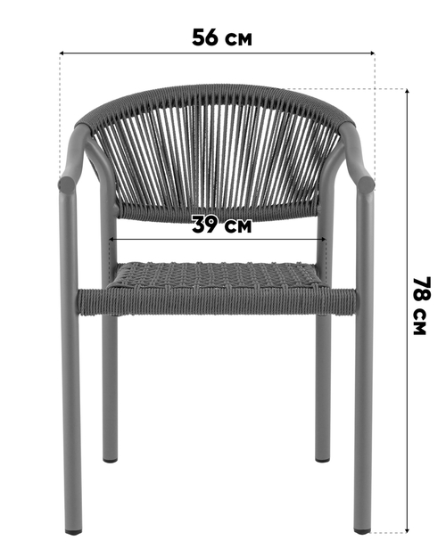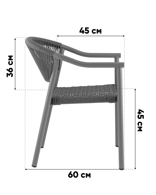 Эргономичная изогнутая спинка и подлокотники обеспечивают комфортную посадку. Верёвочное плетение добавляет текстурный акцент, а минималистичная форма делает стул универсальным решением для разных экстерьеров. Серый каркас элегантно контрастирует с тёплым оттенком верёвки.