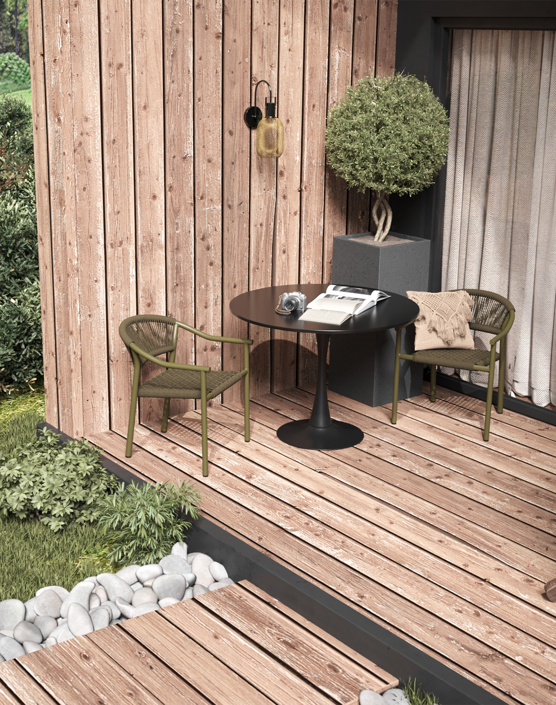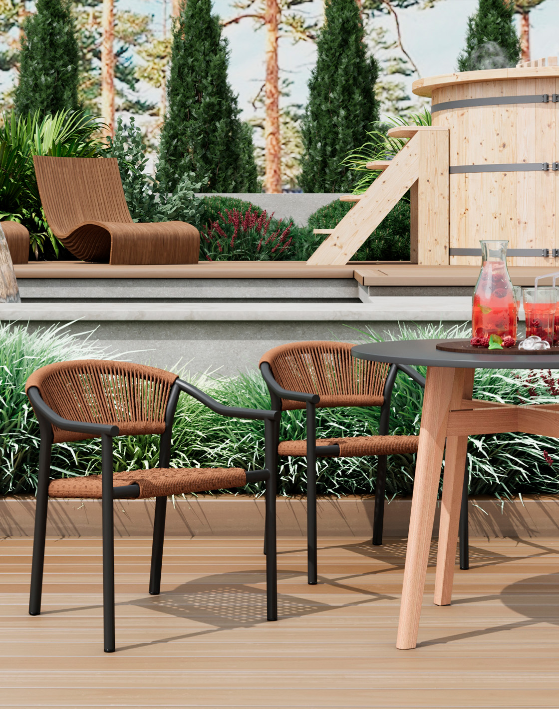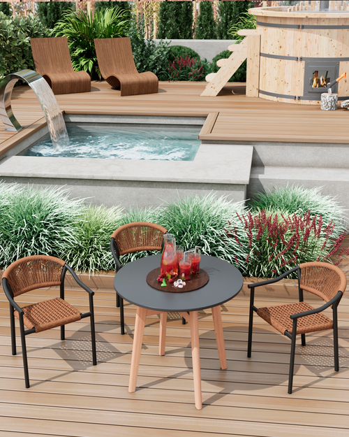 Сиденье и спинка изготовлены из PE twist rattan — искусственного ротанга, созданного на основе полиэтиленового сырья. Его плетение имитирует текстуру веревки, придавая мебели выразительный и натуральный внешний вид.