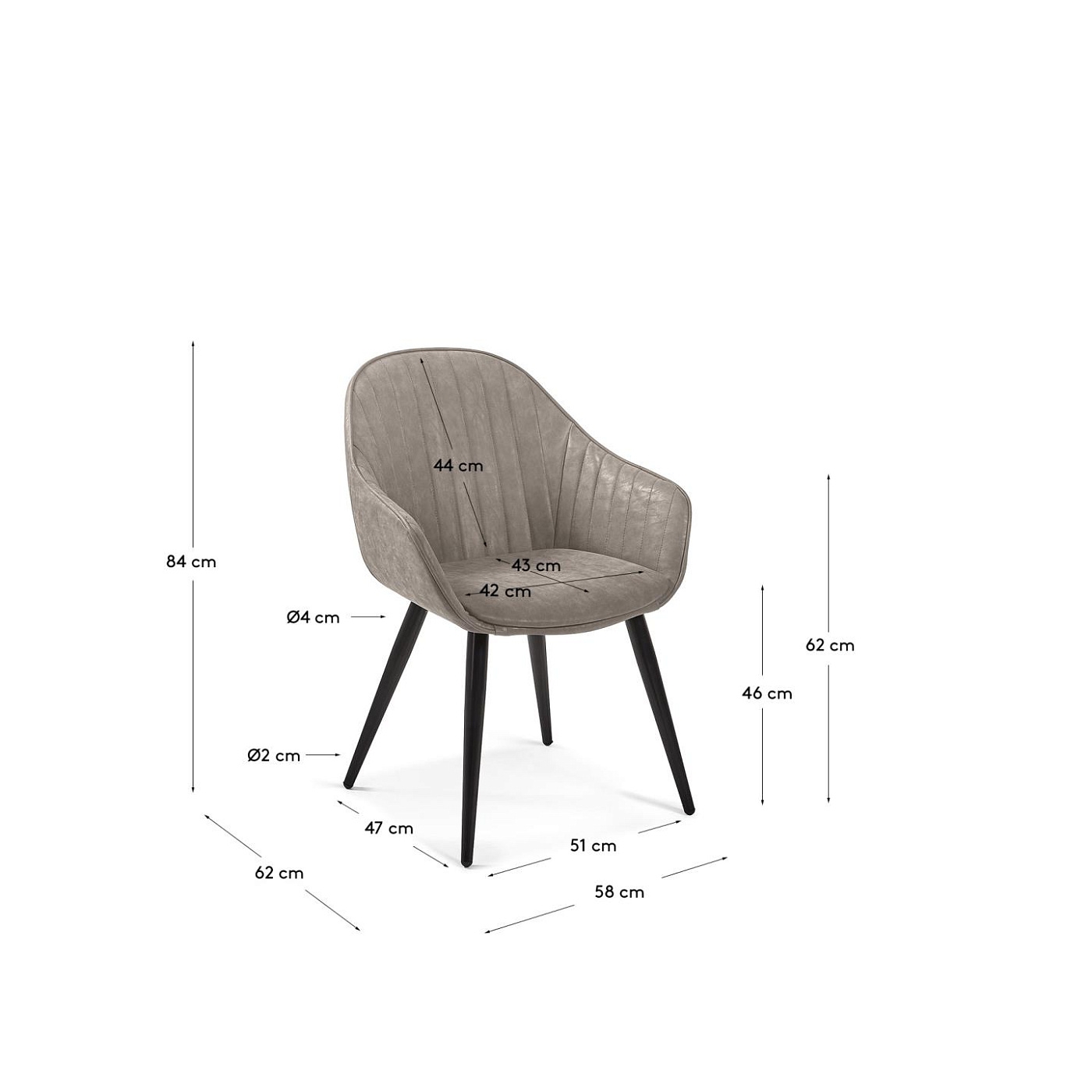 Размеры: ширина – 58 см, высота – 84 см, глубина – 62 см, глубина сиденья – 43 см.