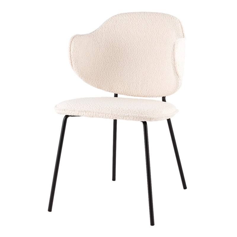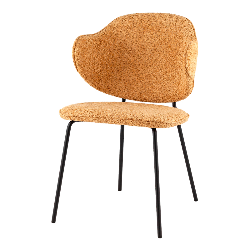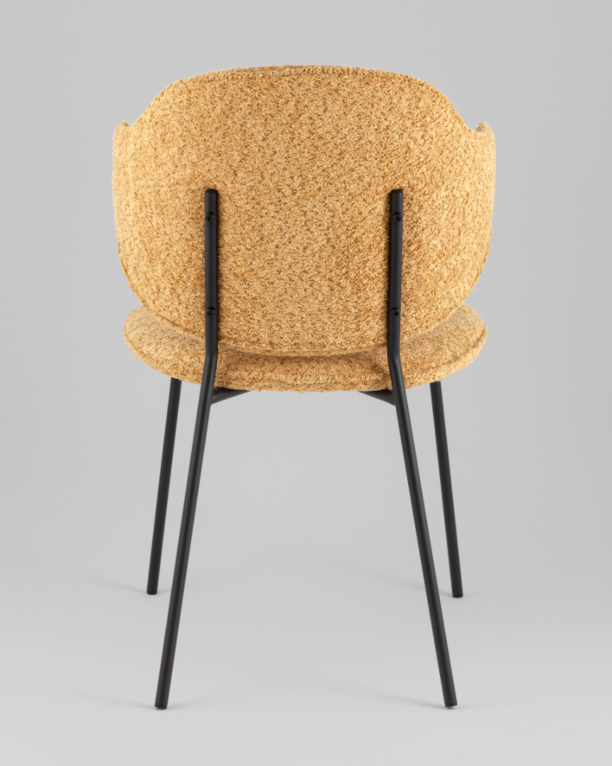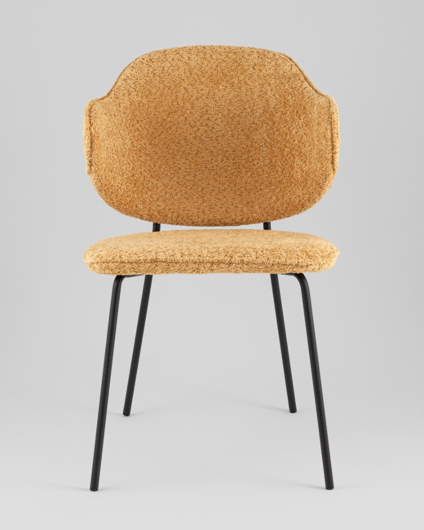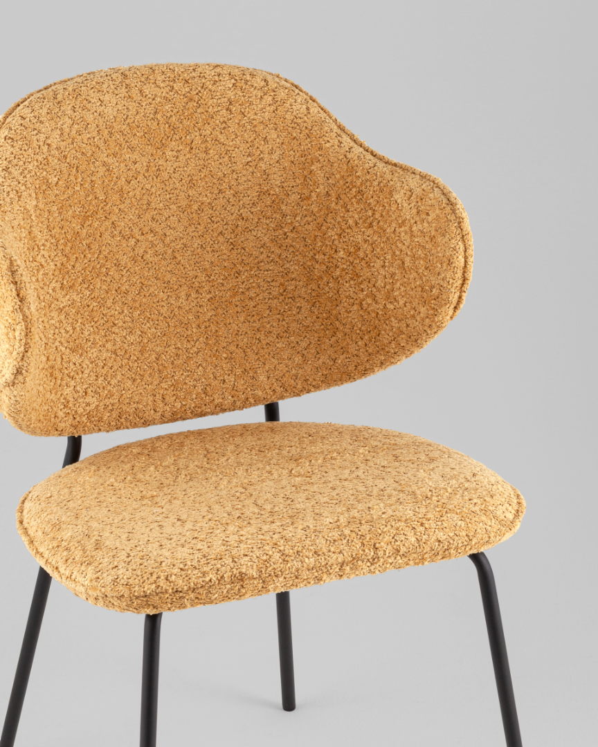 Материалы и цвета. Сиденье и спинка покрыты мягким тканевым материалом букле кофейного оттенка, который имеет оригинальную фактуру и приятен на ощупь. Ножки выполнены из металла и выкрашены в черный цвет.