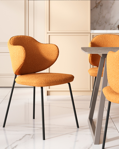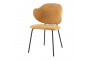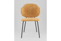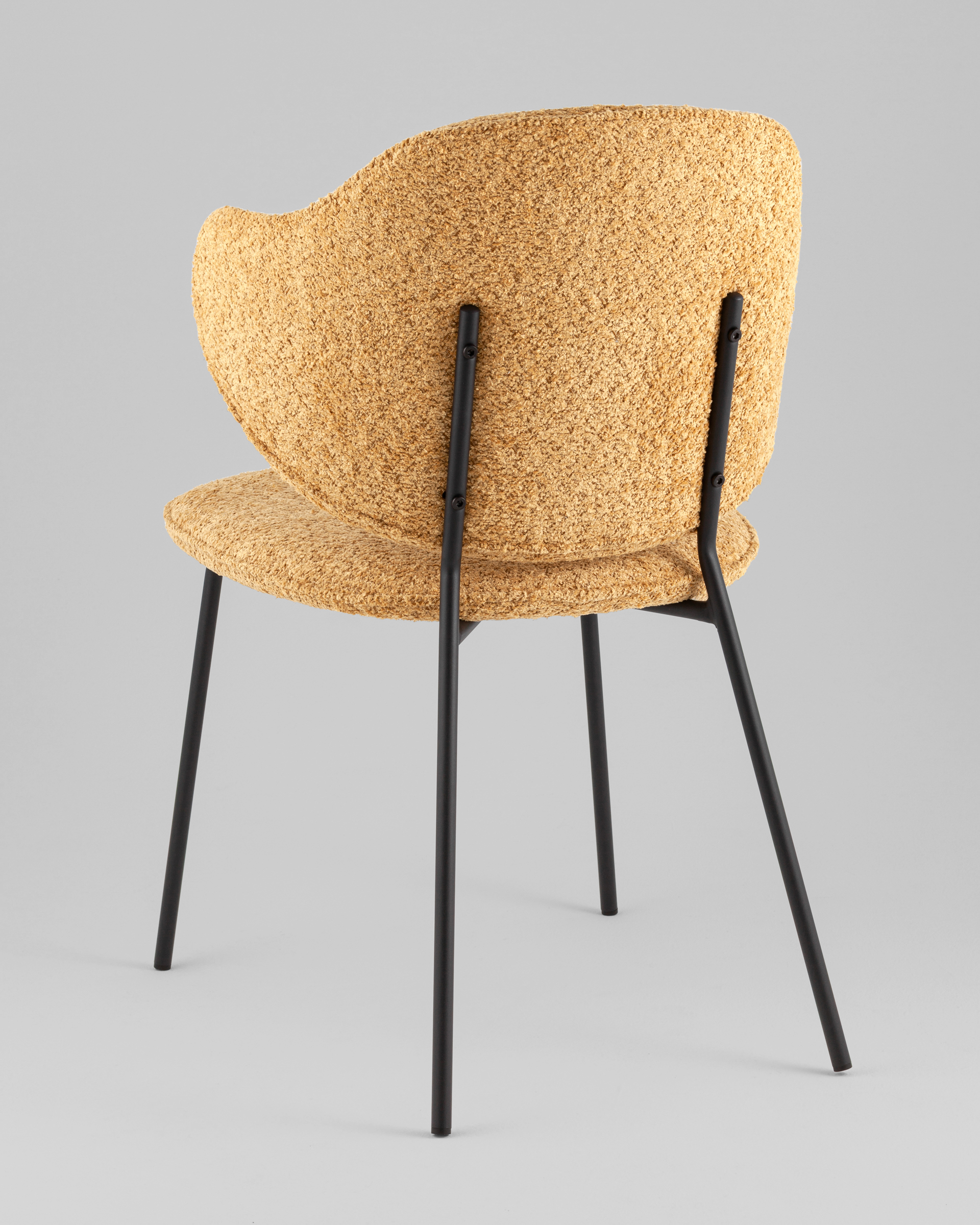Материалы и цвета. Сиденье и спинка покрыты мягким тканевым материалом букле цвета охра, который имеет оригинальную фактуру и приятен на ощупь. Ножки выполнены из металла и выкрашены в черный цвет.