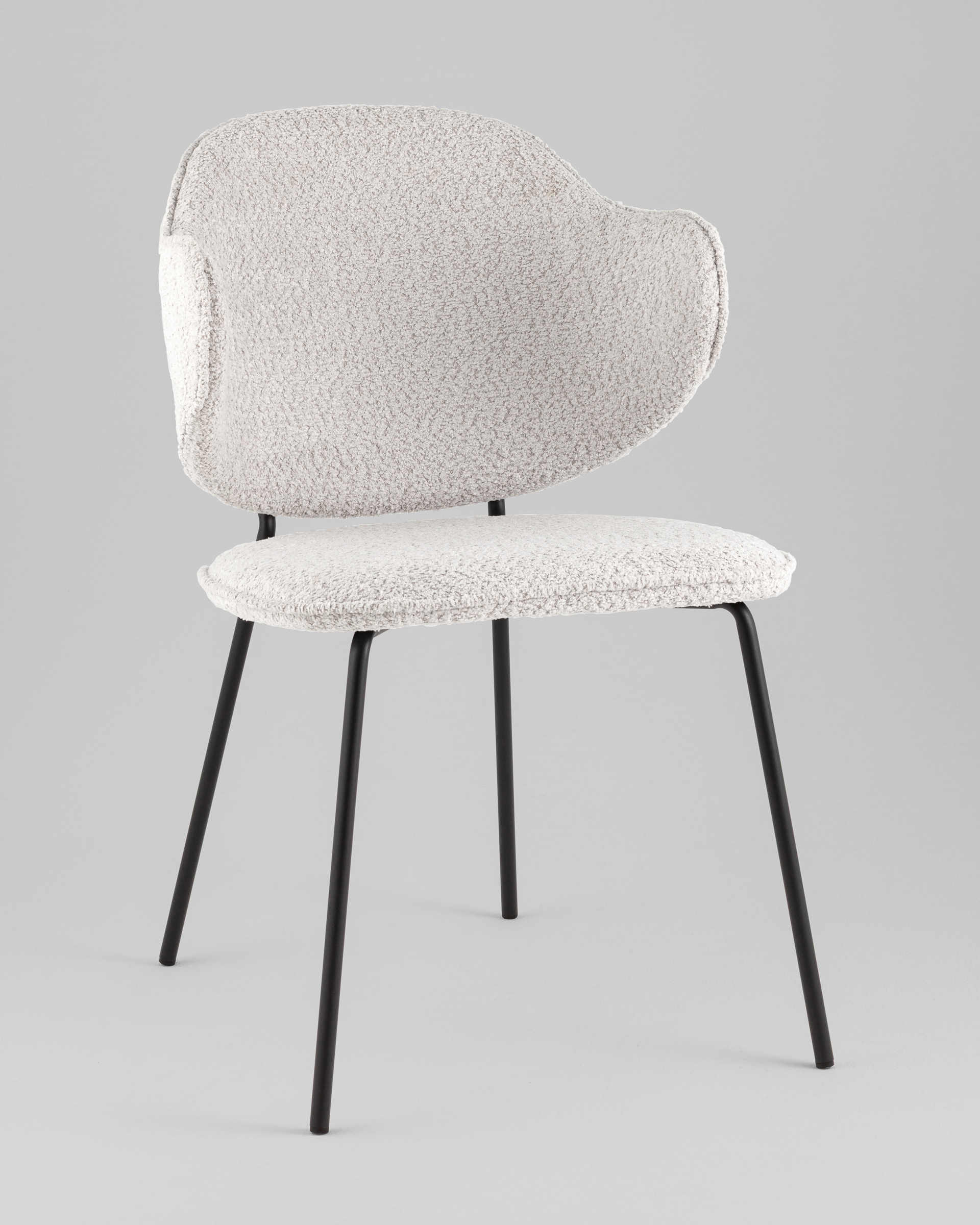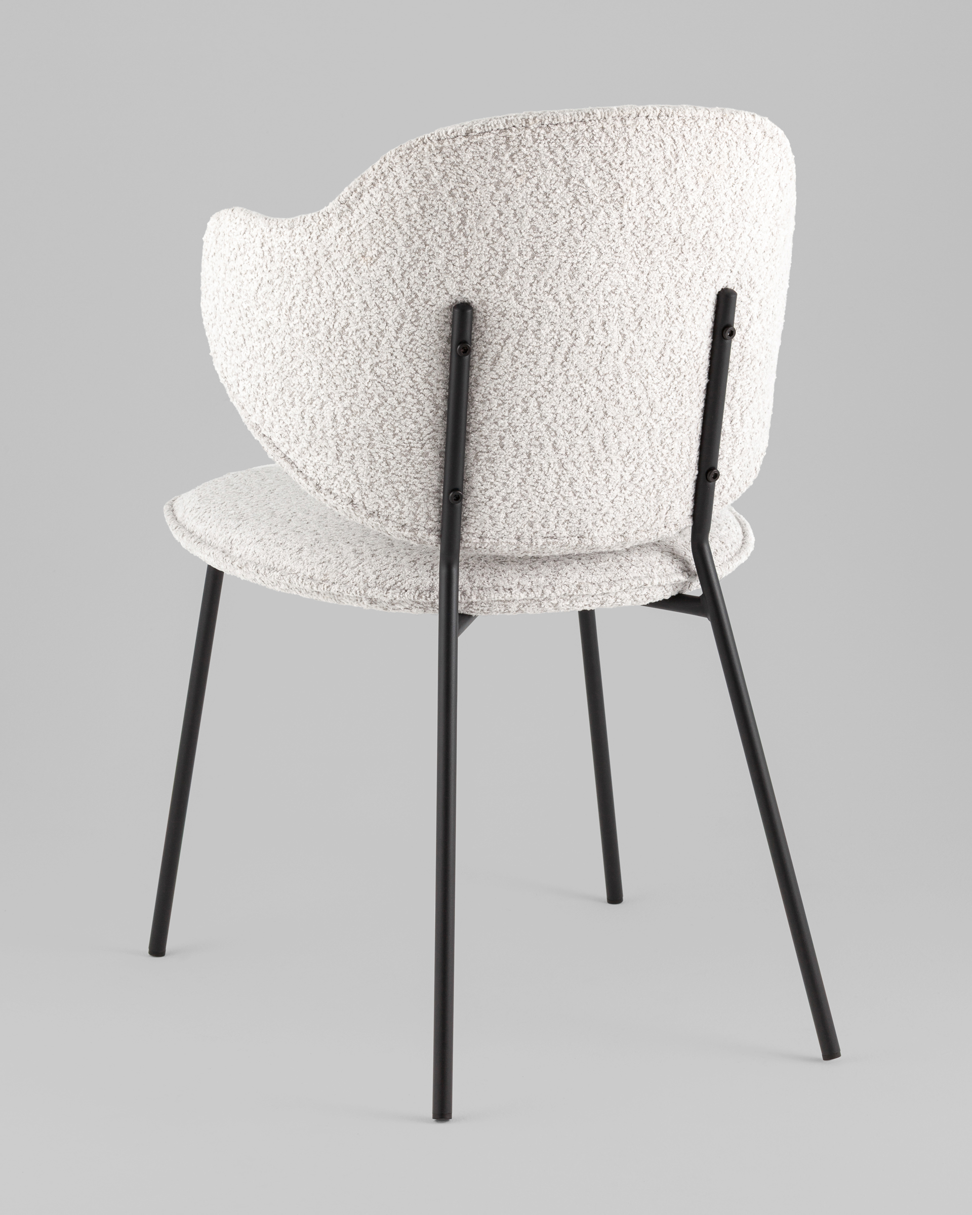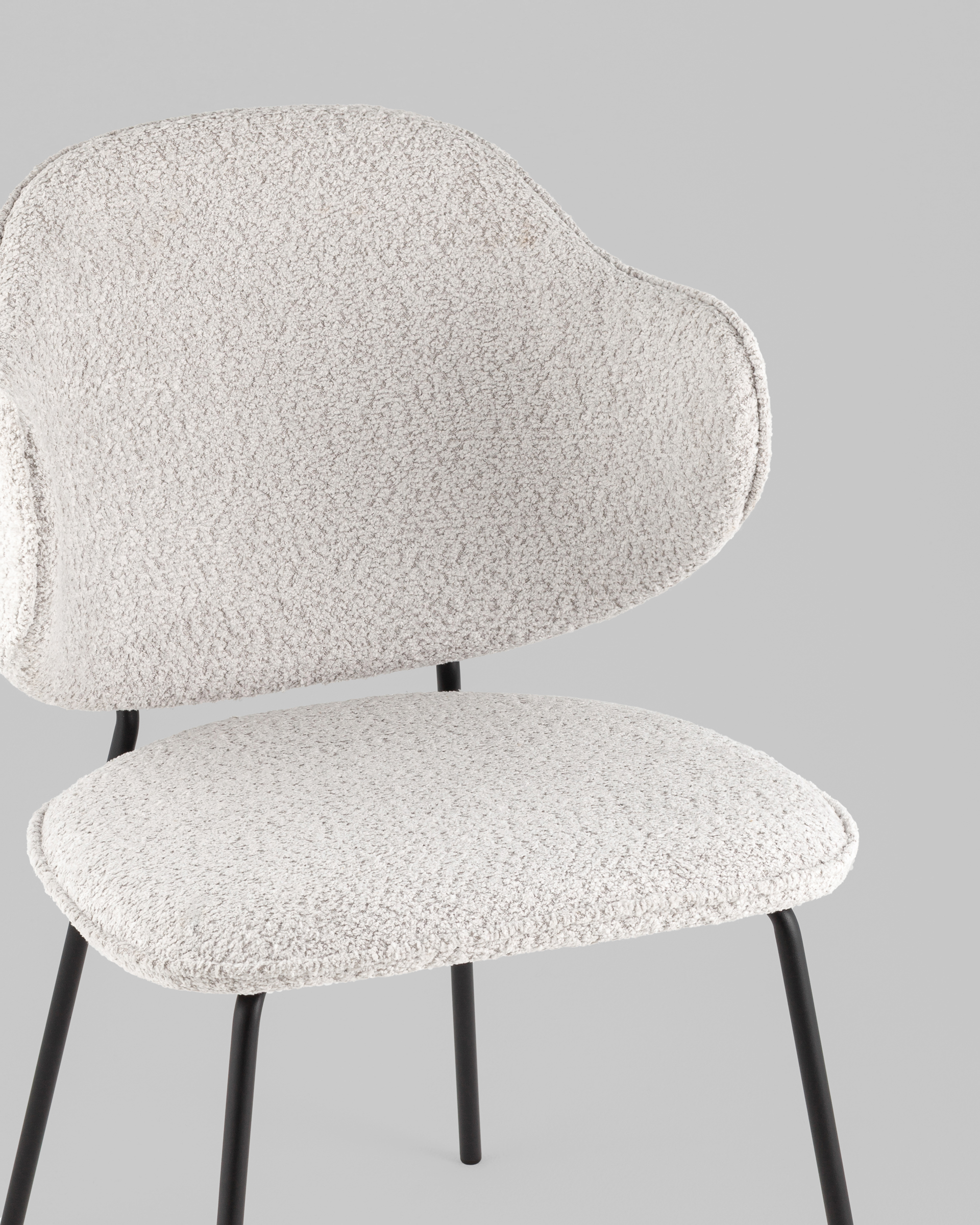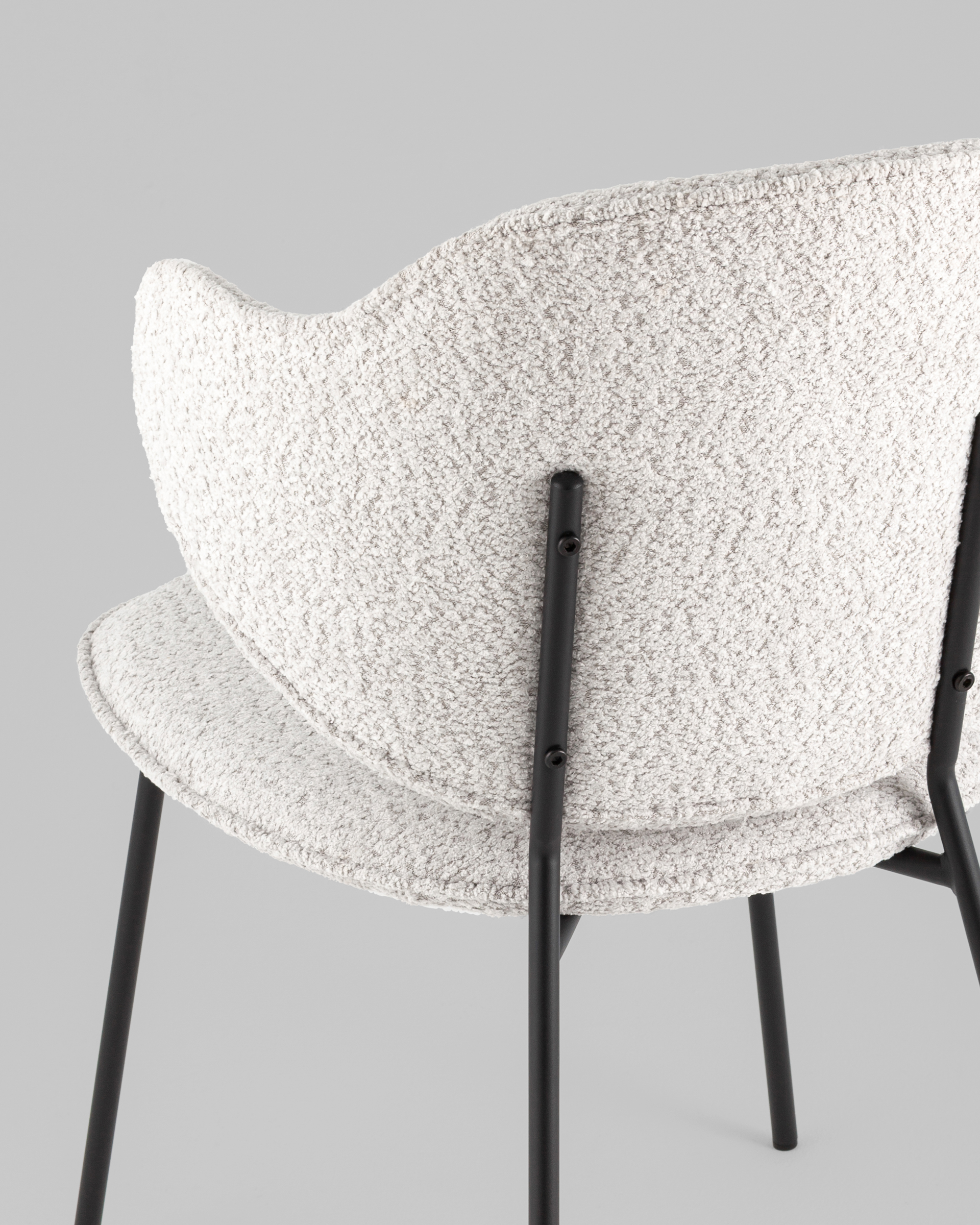 Материалы и цвета. Сиденье и спинка покрыты мягким тканевым материалом букле светло-серого оттенка, который имеет оригинальную фактуру и приятен на ощупь. Ножки выполнены из металла и выкрашены в черный цвет.