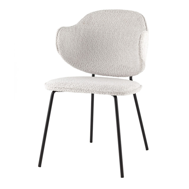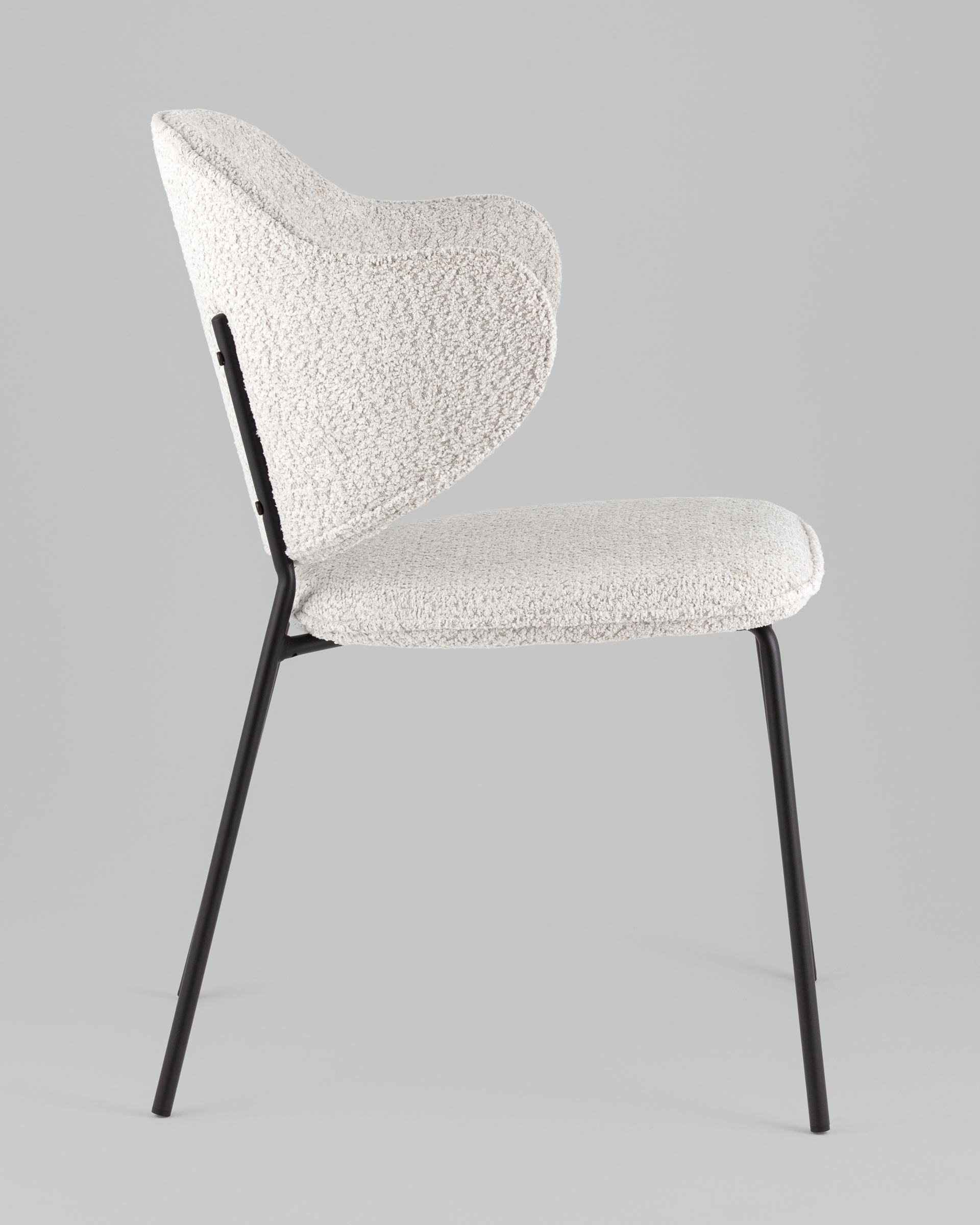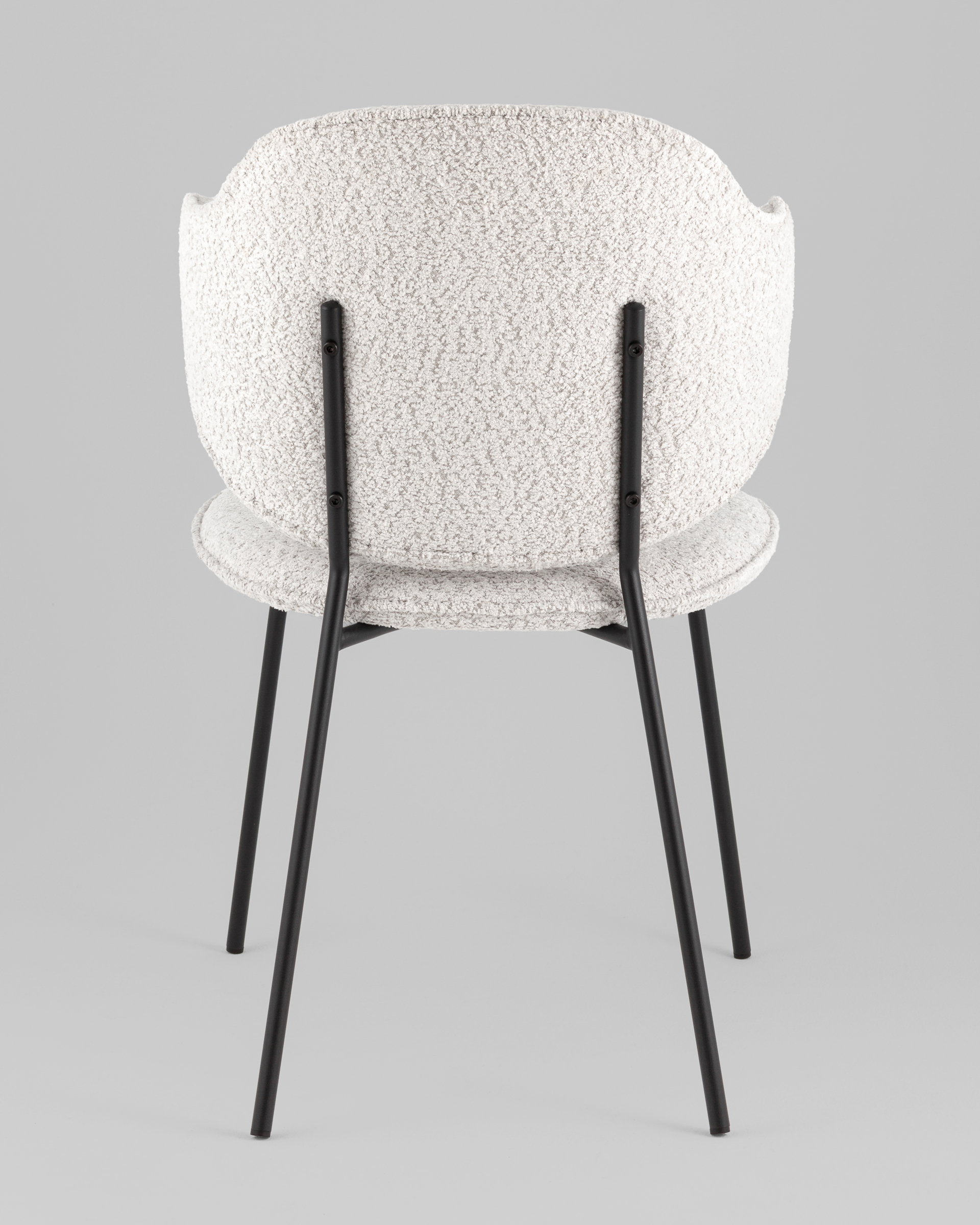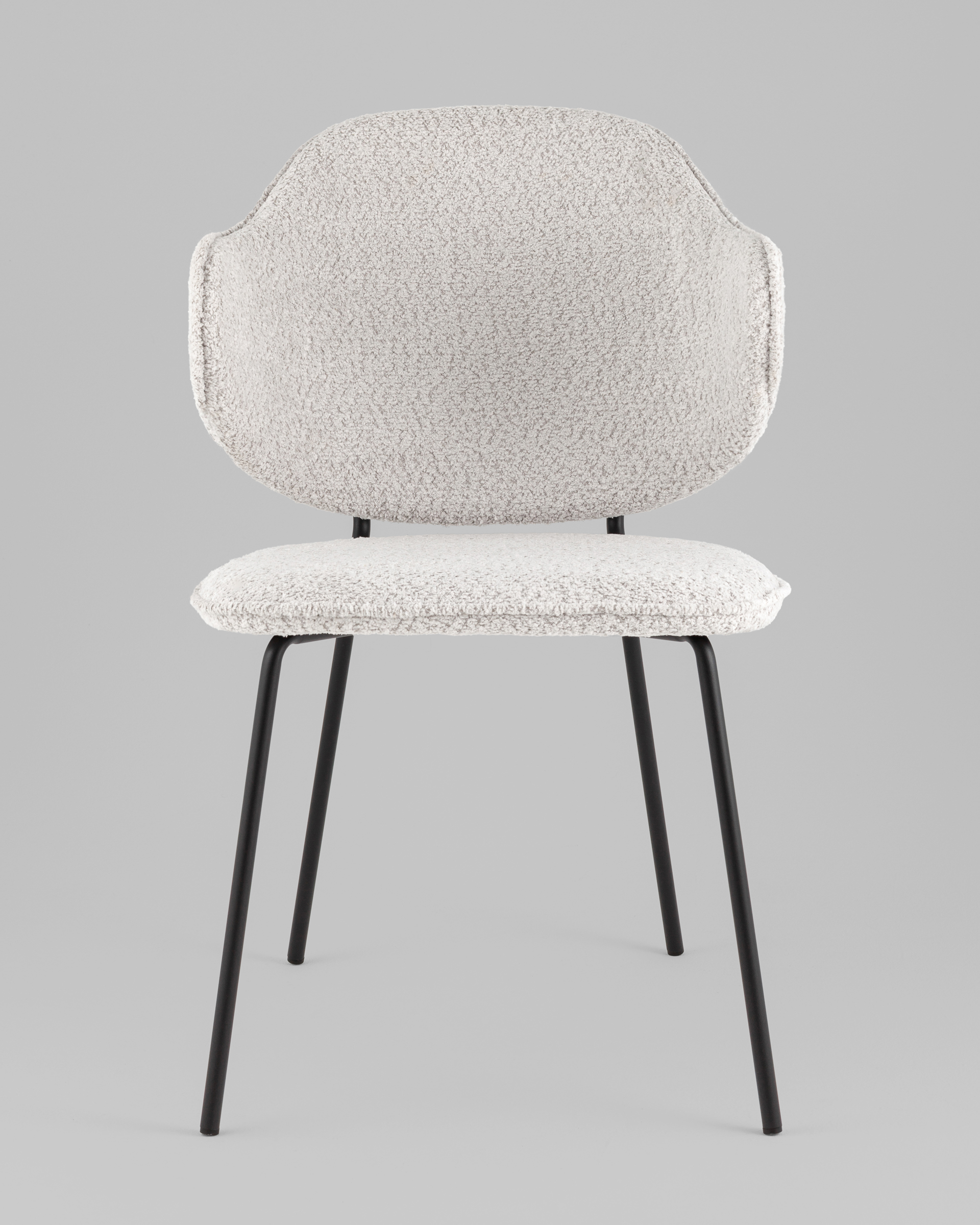 Материалы и цвета. Сиденье и спинка покрыты мягким тканевым материалом букле светло-серого оттенка, который имеет оригинальную фактуру и приятен на ощупь. Ножки выполнены из металла и выкрашены в черный цвет.
