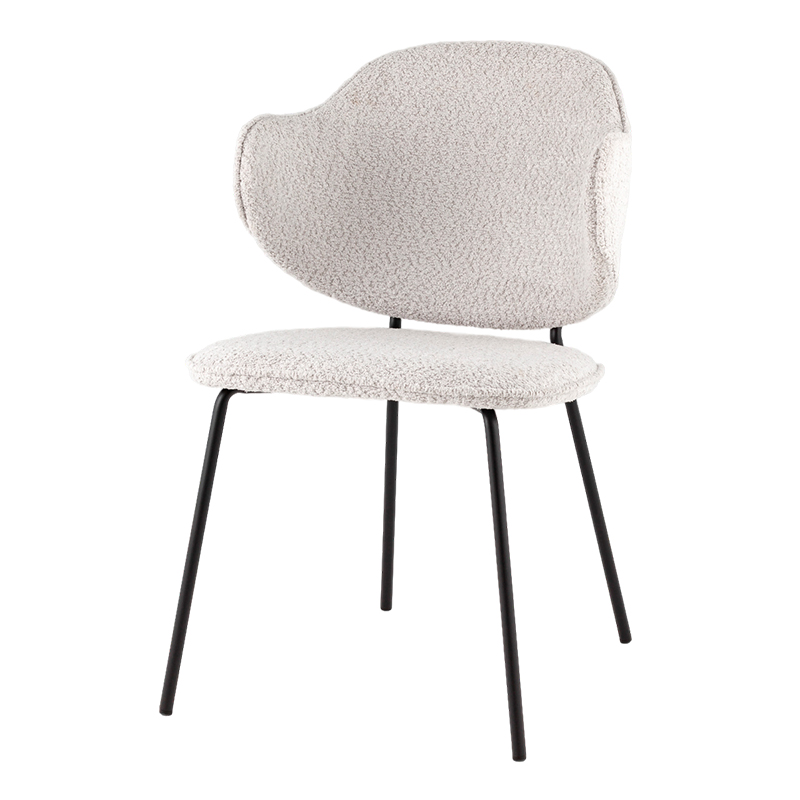 Материалы и цвета. Сиденье и спинка покрыты мягким тканевым материалом букле кофейного оттенка, который имеет оригинальную фактуру и приятен на ощупь. Ножки выполнены из металла и выкрашены в черный цвет.