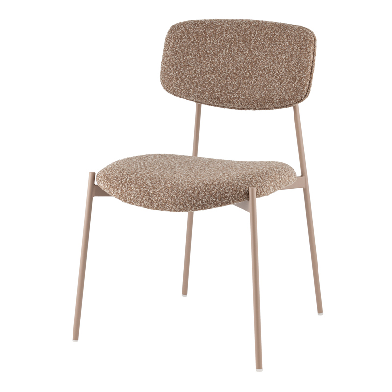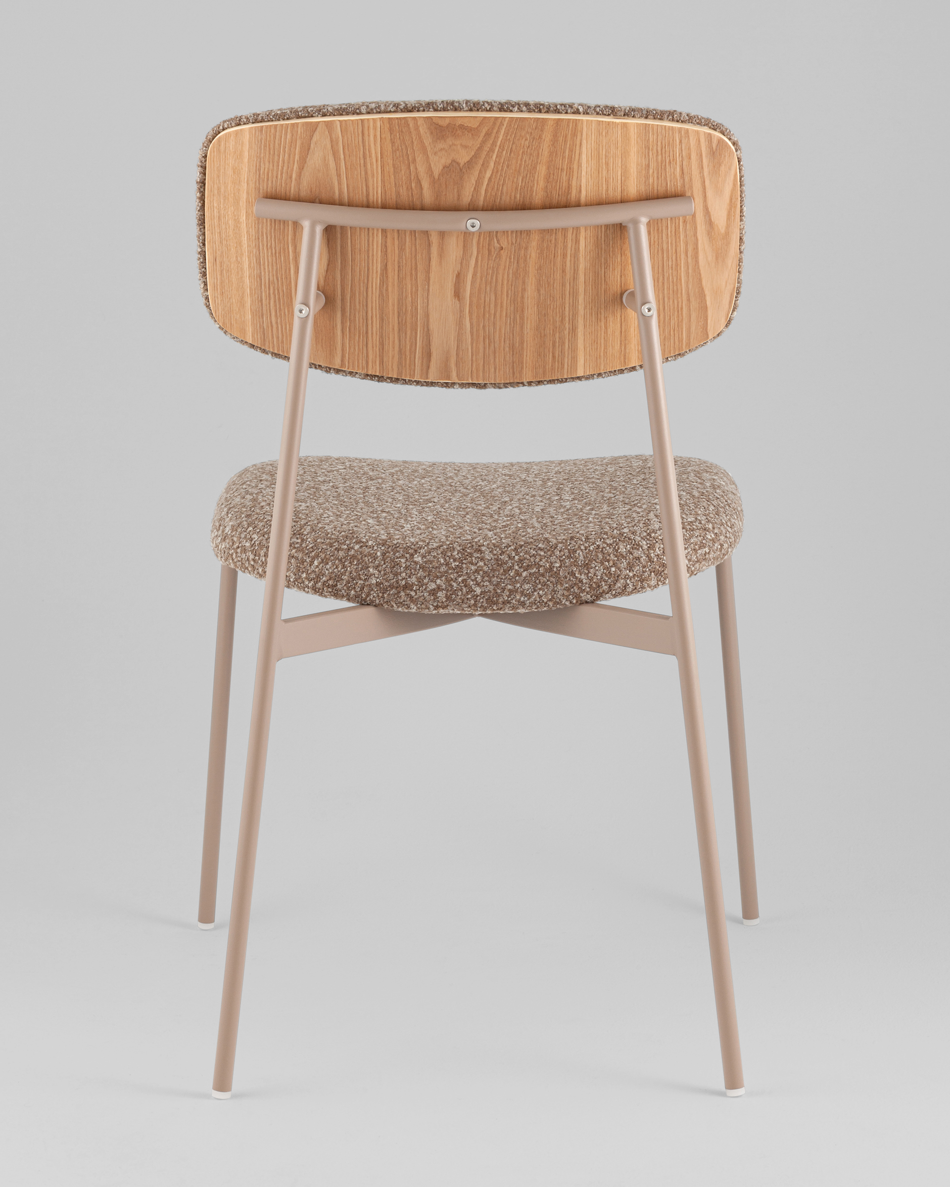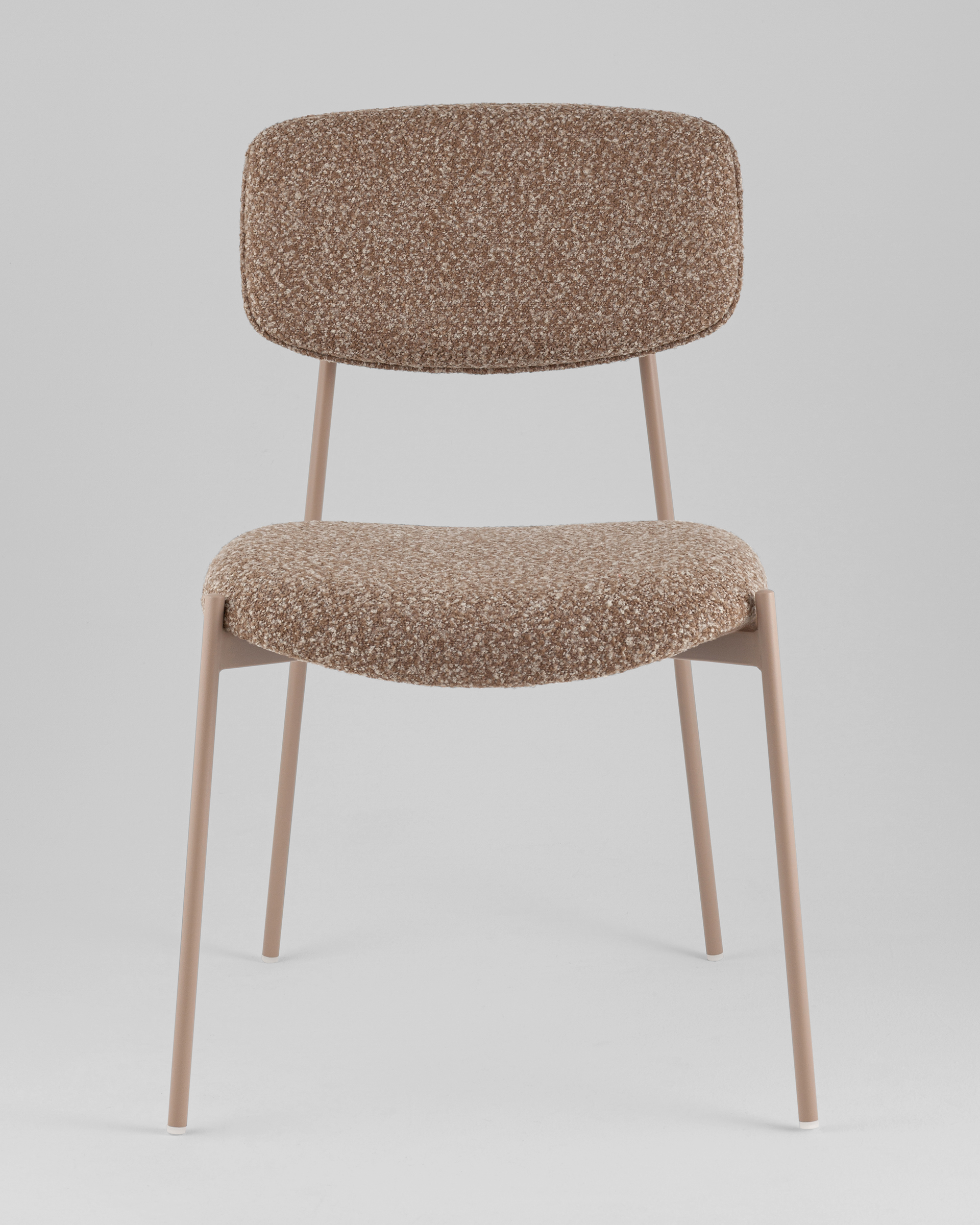 Материалы и цвета. Сиденье и спинка стула выполнены из высококачественного букле в коричневом цвете, который сочетает в себе уют и элегантность. Ножки стула из металла окрашены в нежный бежевый оттенок, создавая гармоничный контраст с обивкой.
