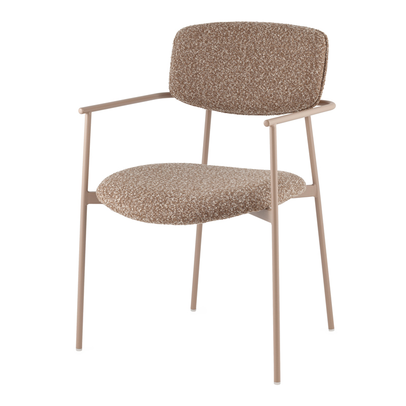 Материалы и цвета. Сиденье и спинка стула выполнены из высококачественного букле в коричневом цвете, который сочетает в себе уют и элегантность. Ножки стула из металла окрашены в нежный бежевый оттенок, создавая гармоничный контраст с обивкой.