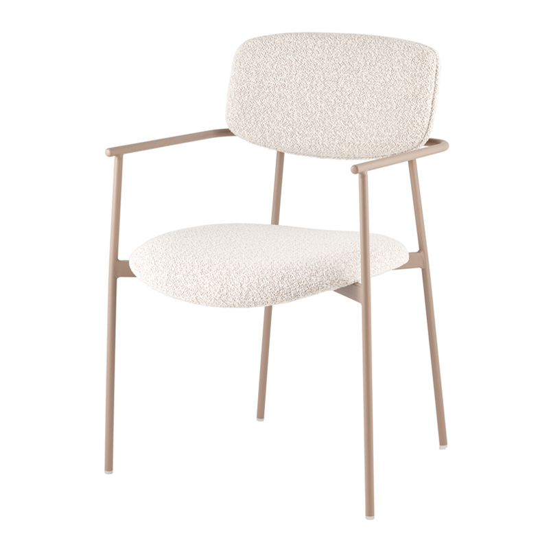 Материалы и цвета. Сиденье и спинка стула выполнены из высококачественного букле в светло-бежевом цвете, который сочетает в себе уют и элегантность. Ножки стула из металла окрашены в нежный бежевый оттенок, создавая гармоничный контраст с обивкой.
