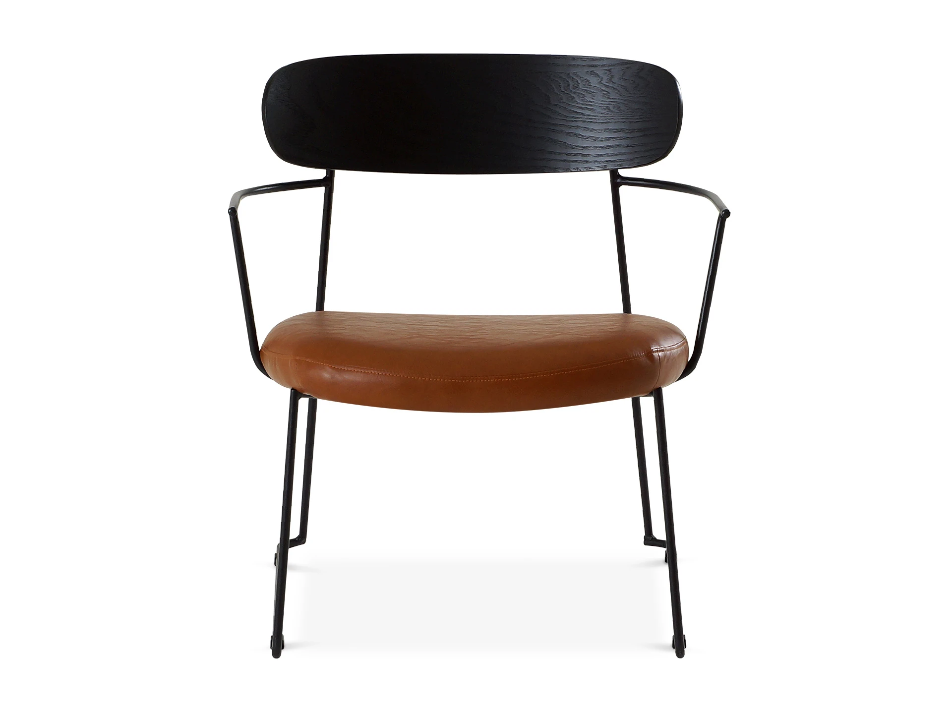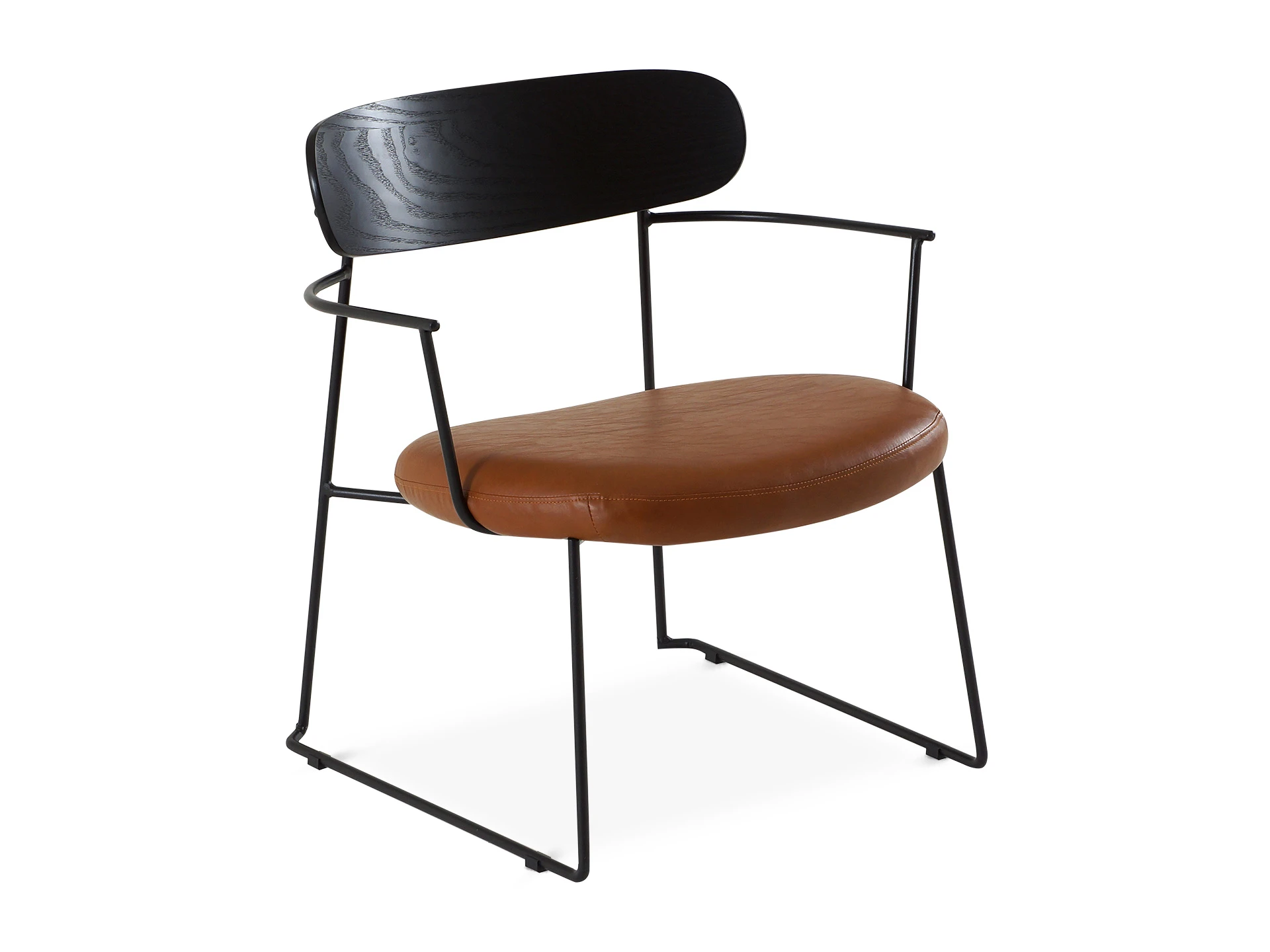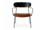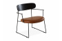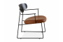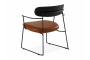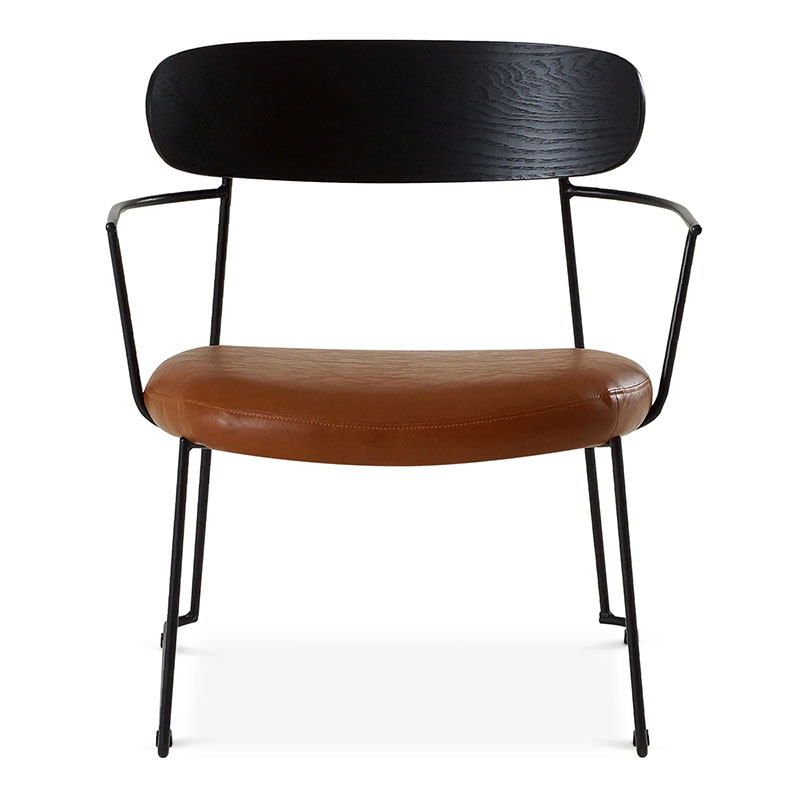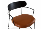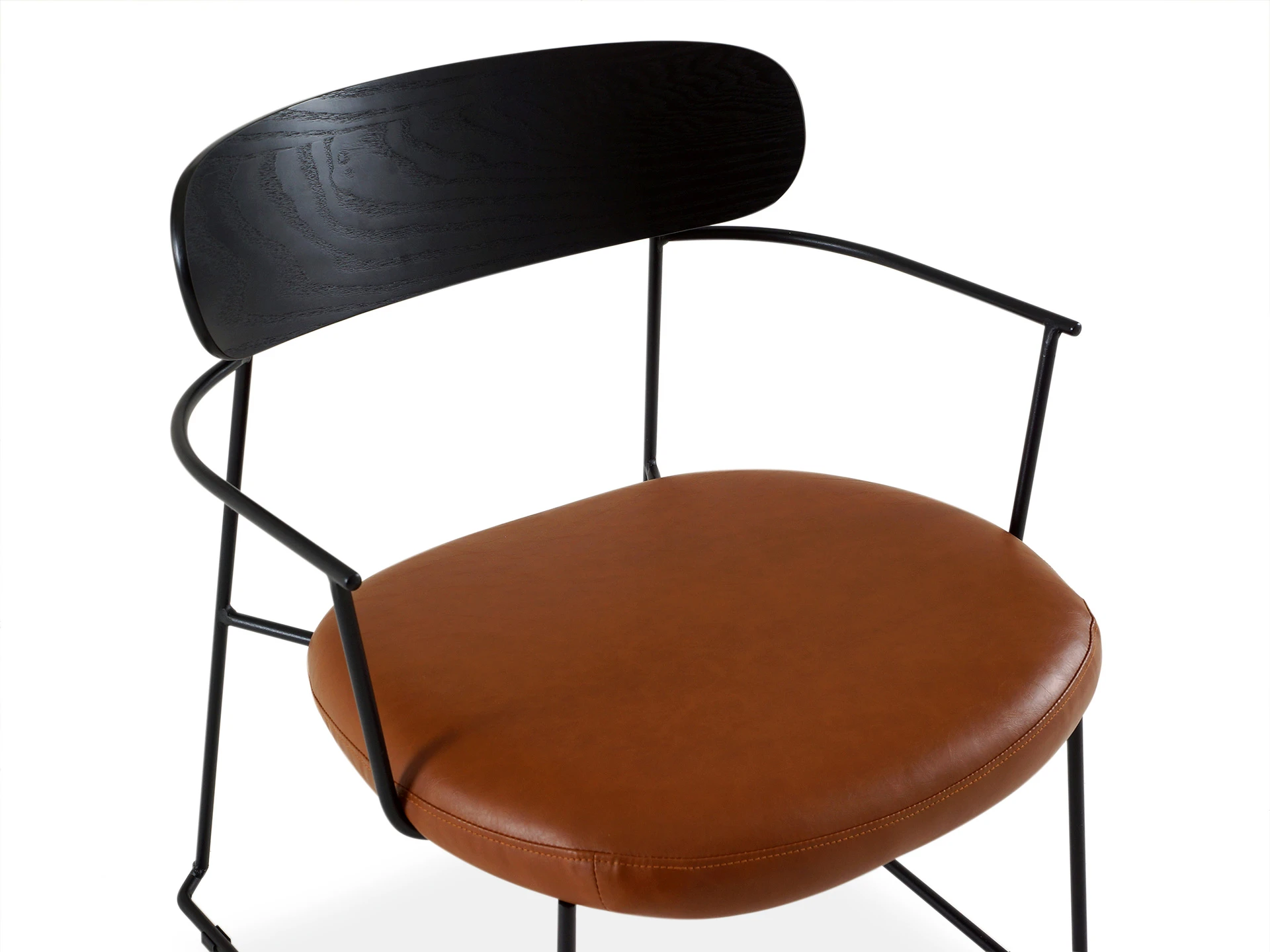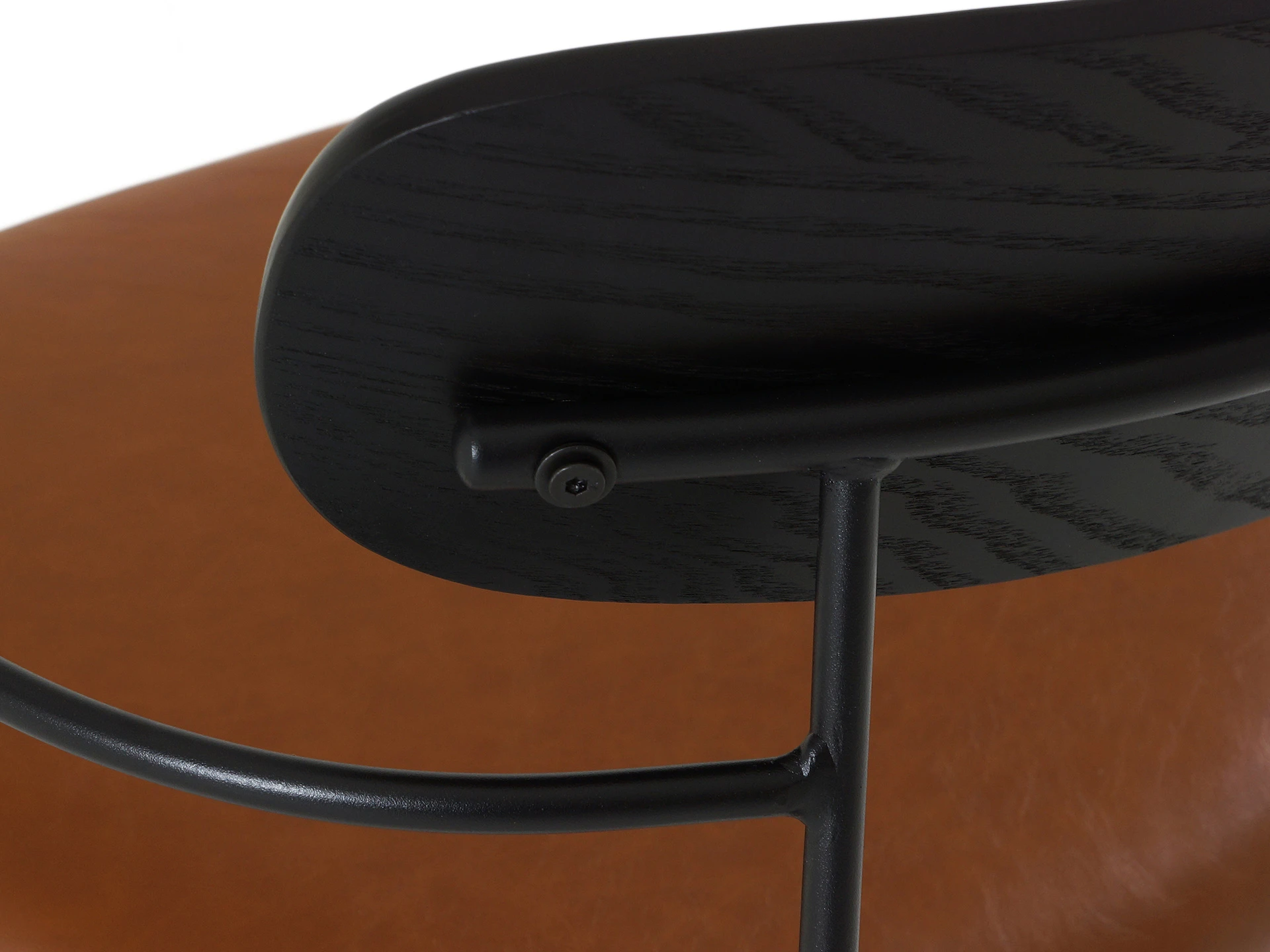 Материал обивки - экокожа коричневого цвета, материал ножек и каркаса - сталь с порошковым покрытием черного цвета. Материал спинки - массив дерева в шпоне дуба черного цвета. На ножках предусмотрены специальные подпятники, которые предотвращают скольжение и повреждения напольного покрытия.