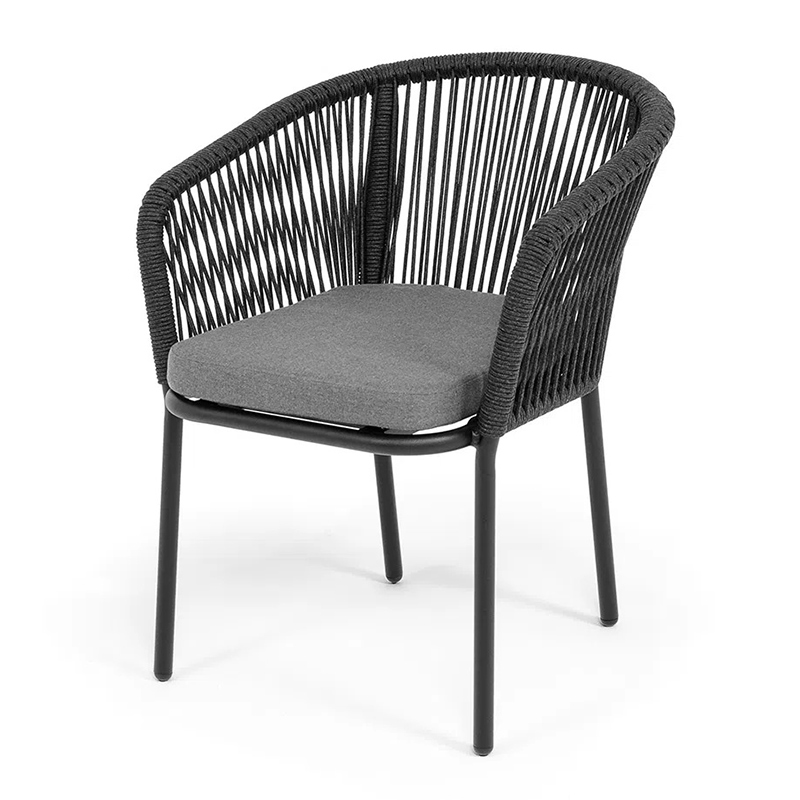 "Марсель" стул плетеный из роупа, каркас алюминий черный муар, роуп темно-серый круглый, ткань темно-серая 027