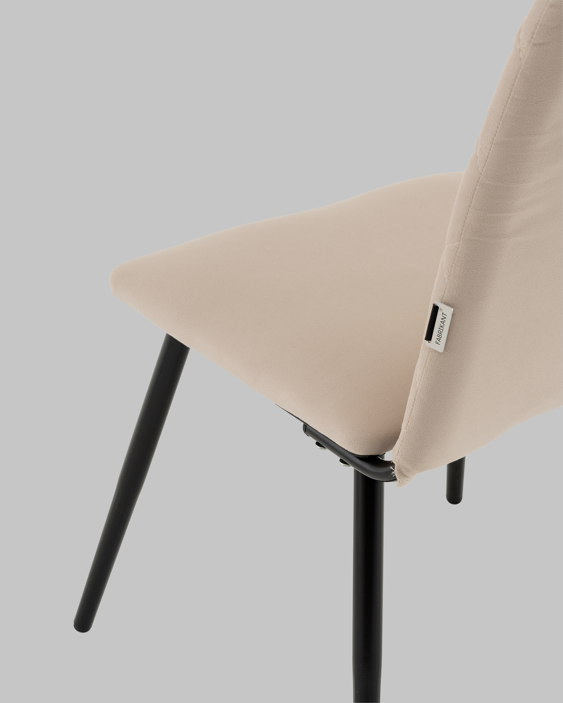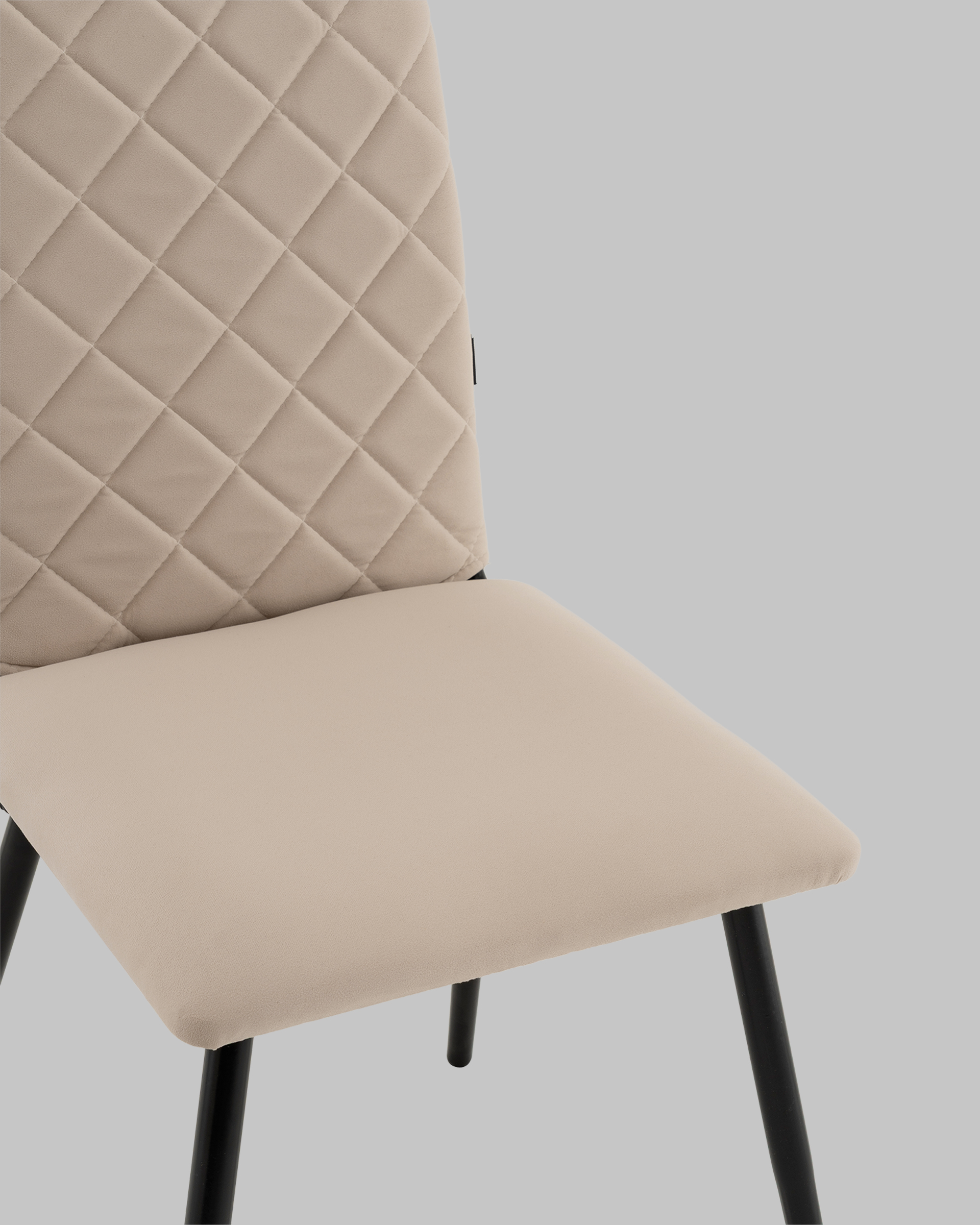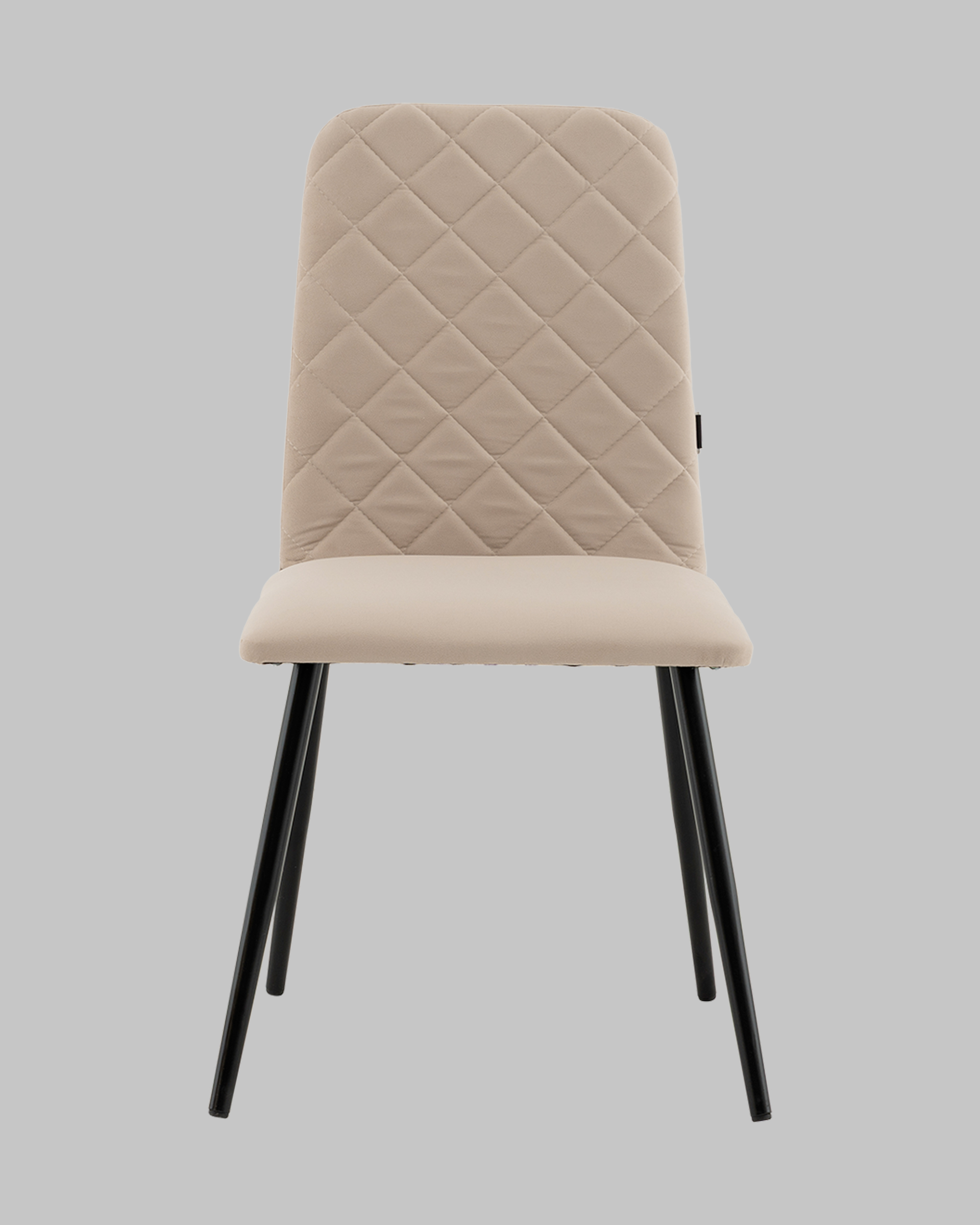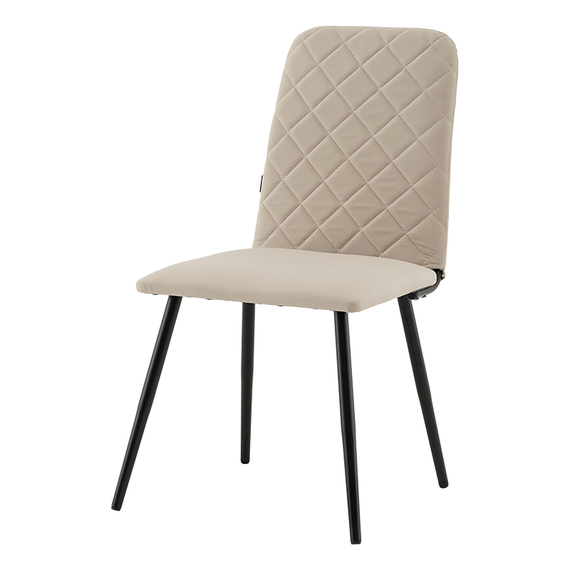Спинка стула украшена аккуратной стёжкой в виде ромбов, добавляющей визуальный интерес и подчёркивающей уютный характер. Прямое сиденье и слегка наклонённая спинка обеспечивают удобную посадку для повседневных трапез и бесед. Прочные металлические ножки в чёрном цвете гарантируют надёжность и устойчивость конструкции.