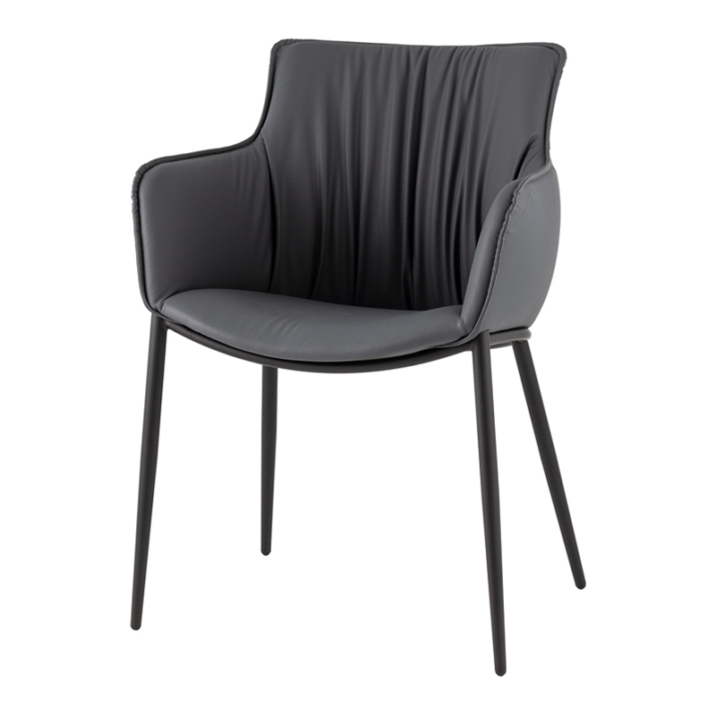 Стул выполнен в лаконичном современном стиле с мягкими линиями и элегантной формой. Широкая полукруглая спинка и просторное сиденье создают уютную атмосферу и обеспечивают комфорт даже при длительном использовании. Чёрные металлические ножки добавляют модели устойчивости и изящества, гармонично подчеркивая её стильный силуэт.