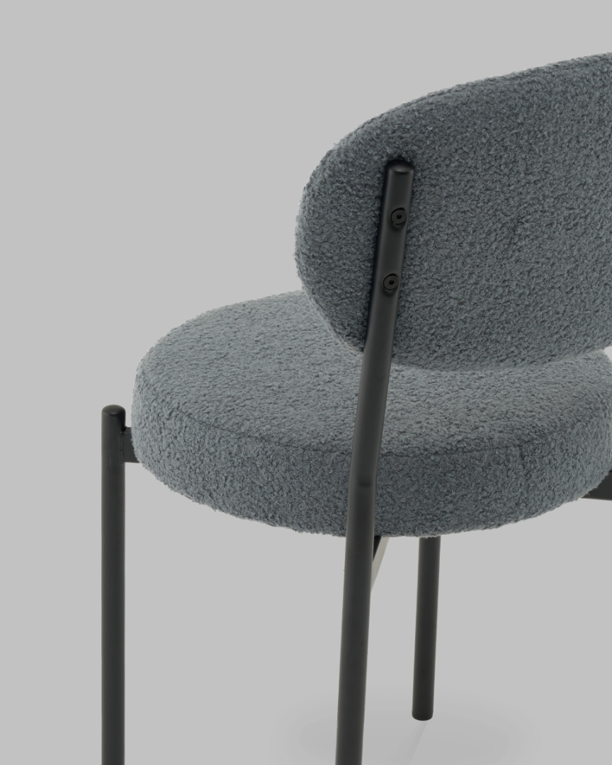 Обивка из плотного материала букле, которая обладает мягкостью и долговечностью, ножки изготовлены из металла в черном цвете. На ножках дополнительно предусмотрены специальные подпятники, которые предотвращают скольжение и повреждение напольного покрытия.