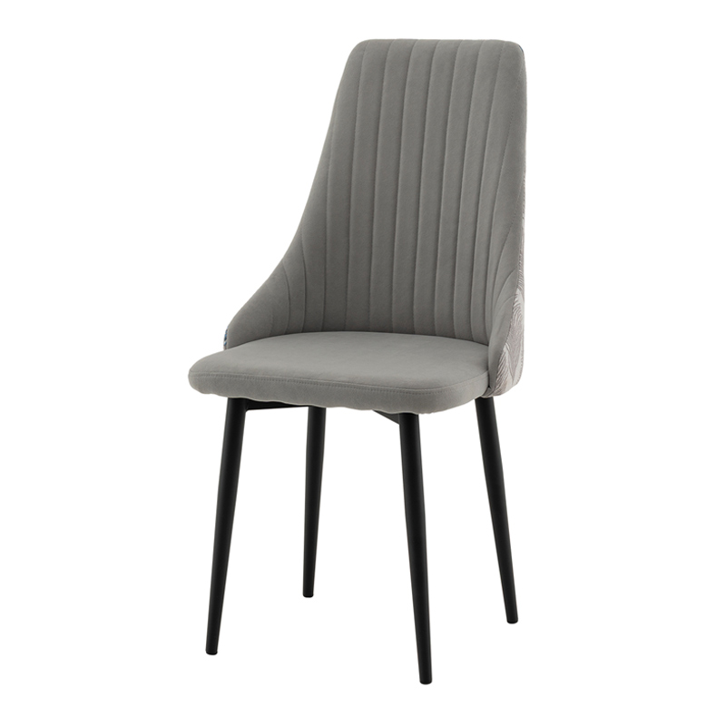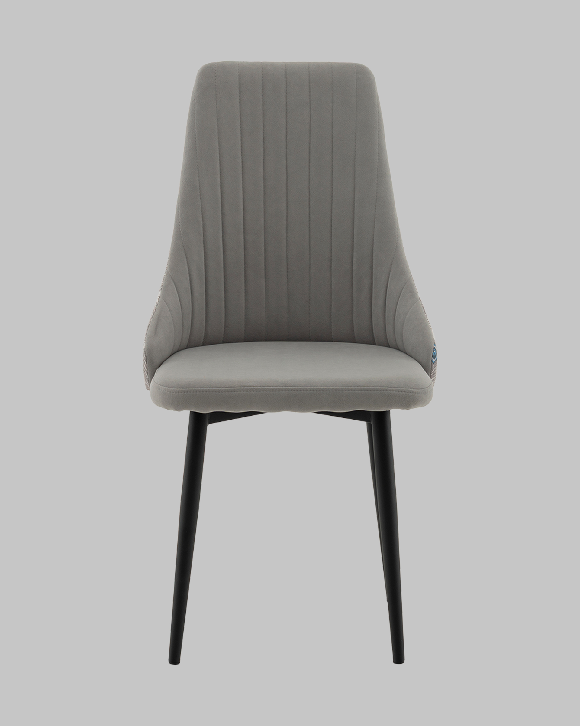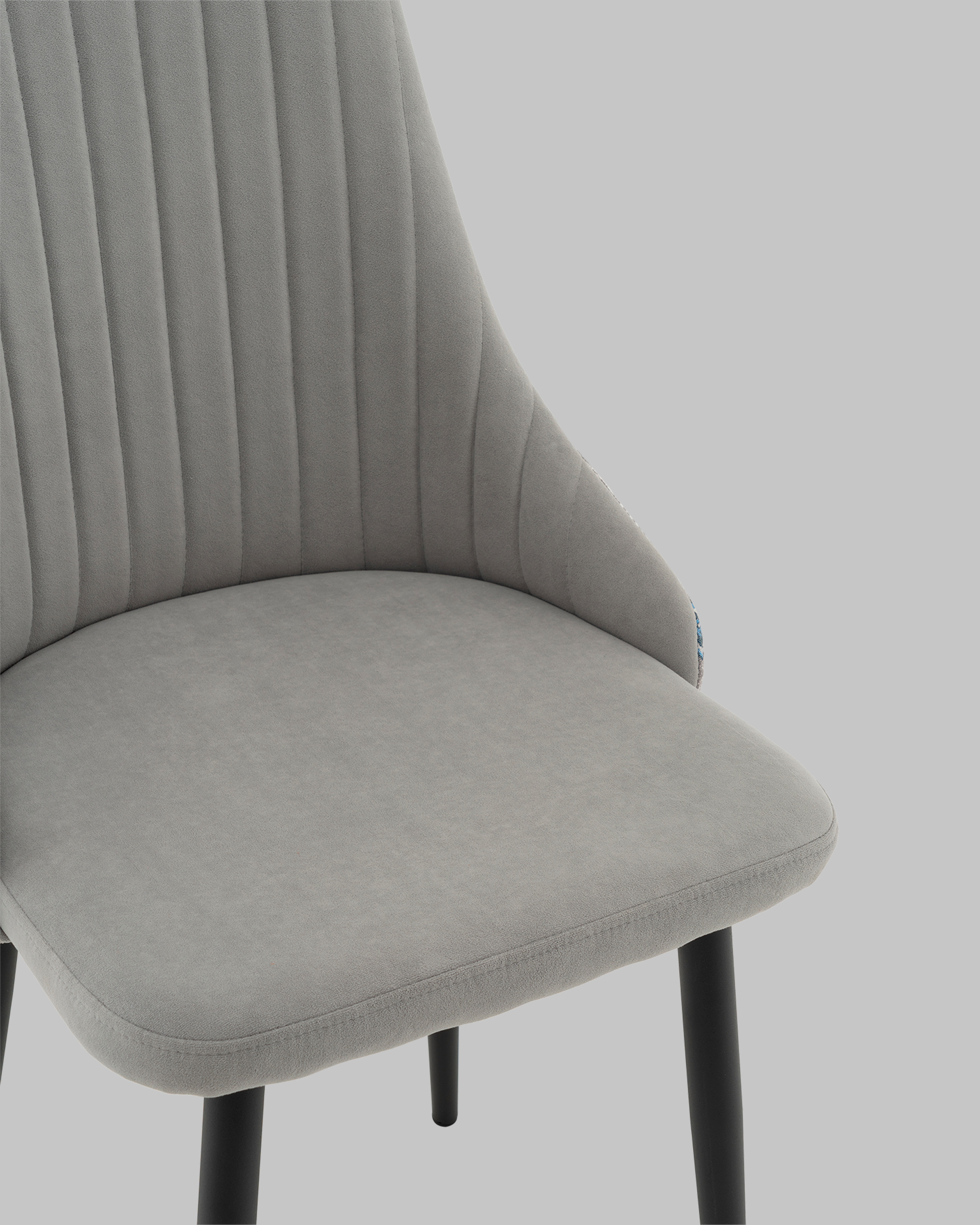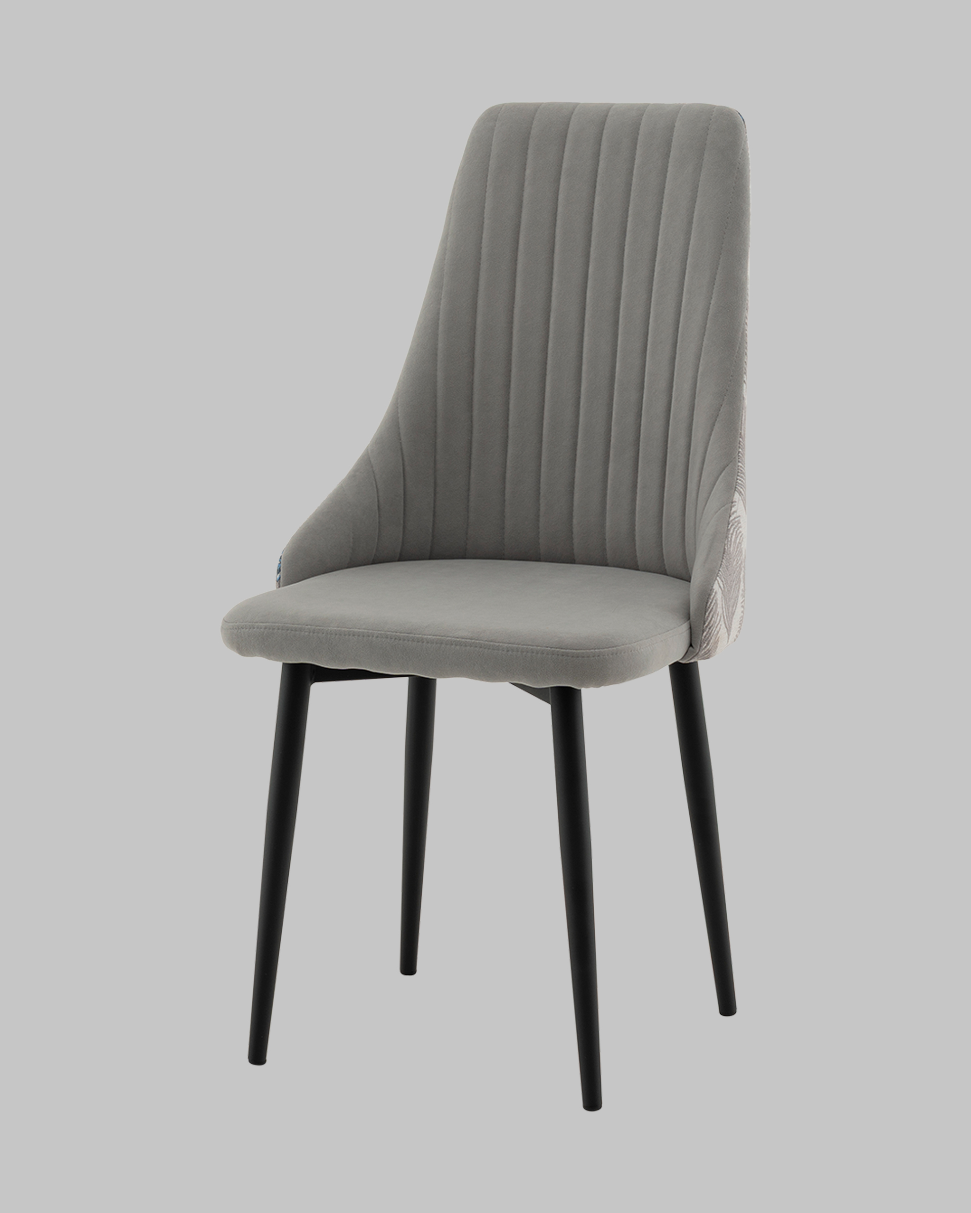 Стул Касаденика сочетает лаконичные формы и уютный велюр, придавая интерьеру спокойный и стильный характер. Обивка передней части выполнена из мягкого серого велюра с вертикальной простёжкой, визуально удлиняющей спинку и подчёркивающей элегантность силуэта.