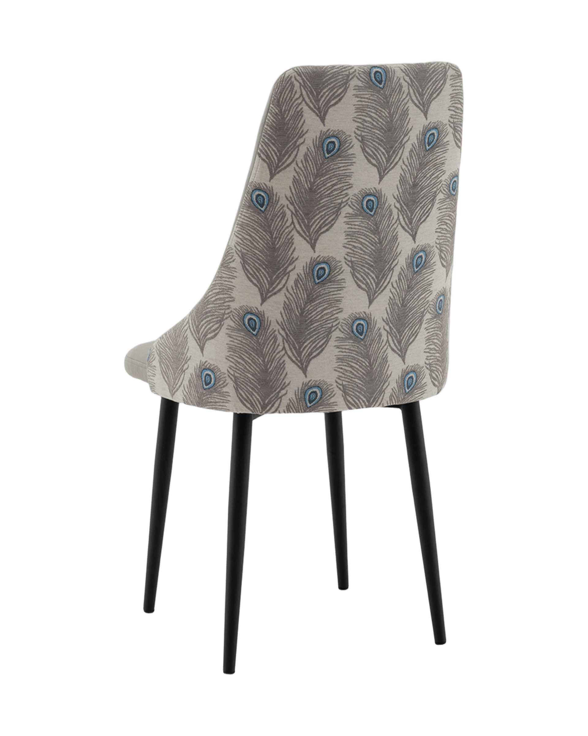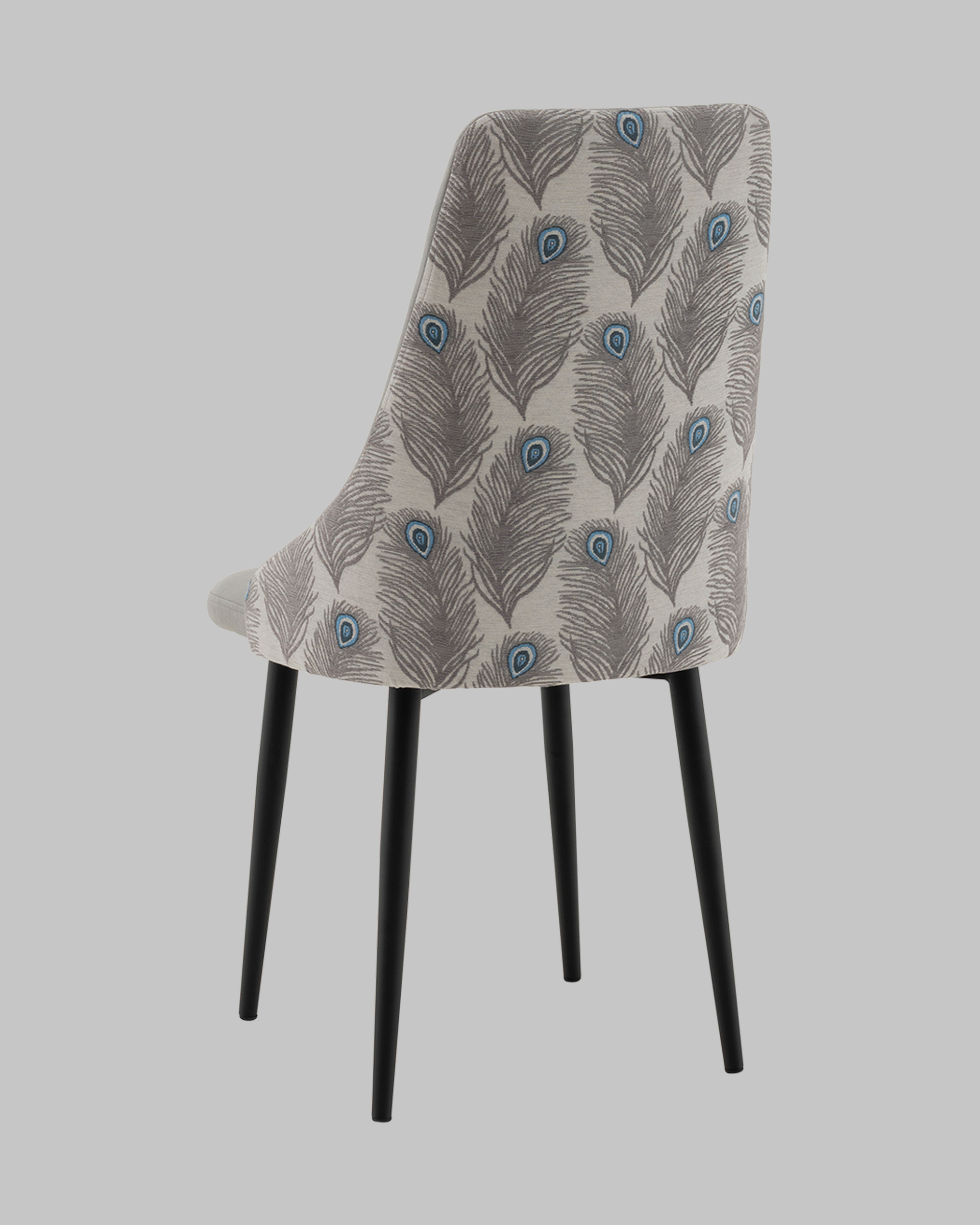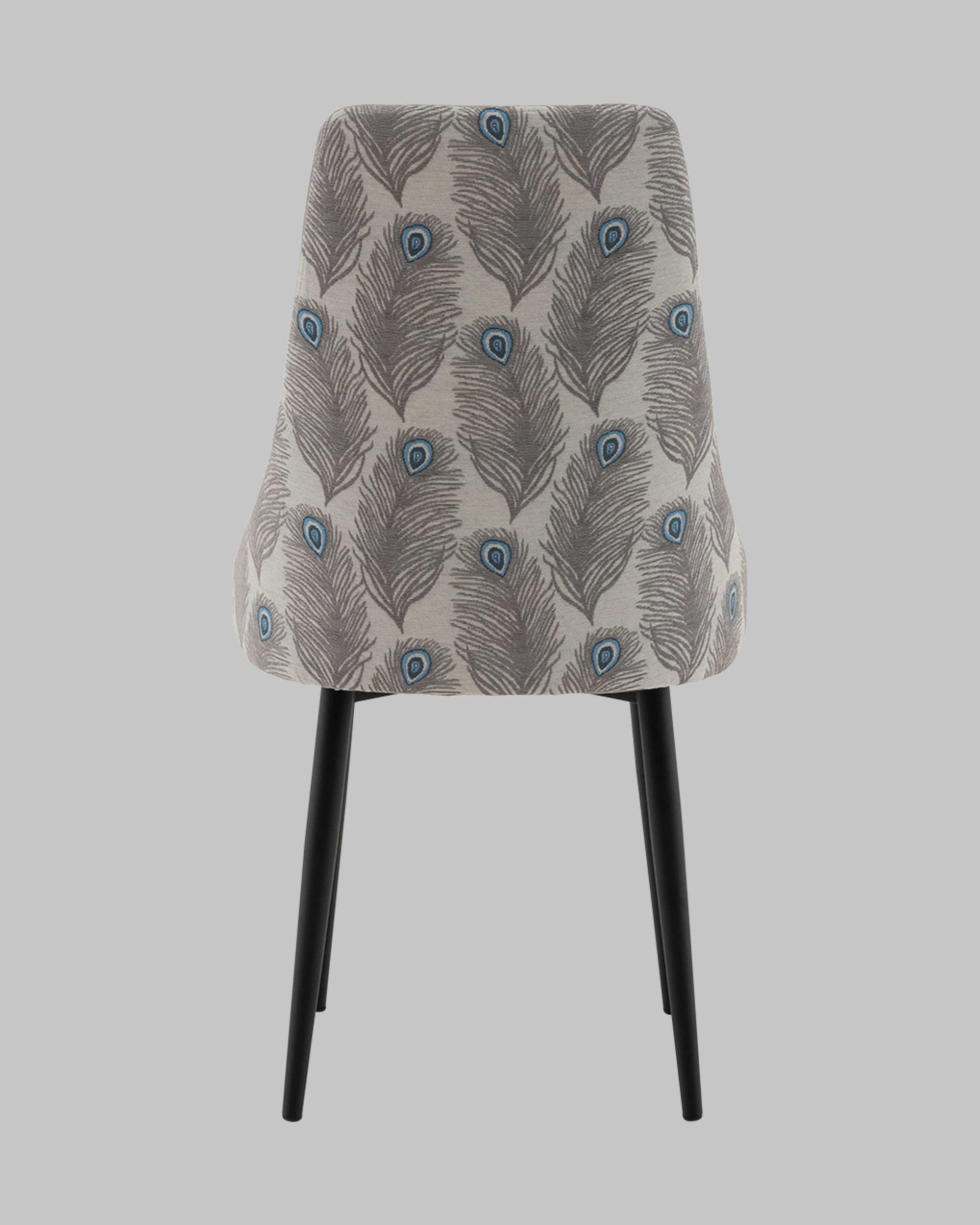 Задняя часть спинки украшена гобеленовой тканью с выразительным рисунком перьев — это изюминка модели, которая добавляет интерьеру индивидуальность и лёгкий этнический акцент. Удобное сиденье и высокая спинка обеспечивают комфортную посадку, а прочные металлические ножки в чёрном цвете гарантируют устойчивость и выдерживают нагрузку до 120 кг.