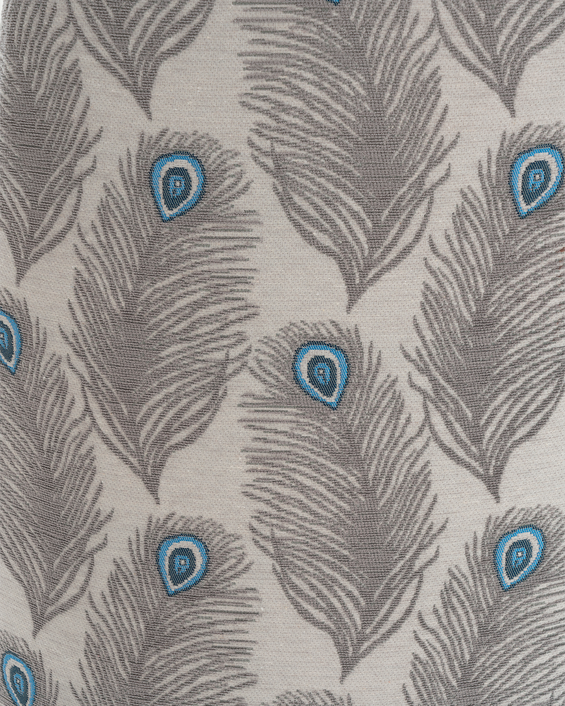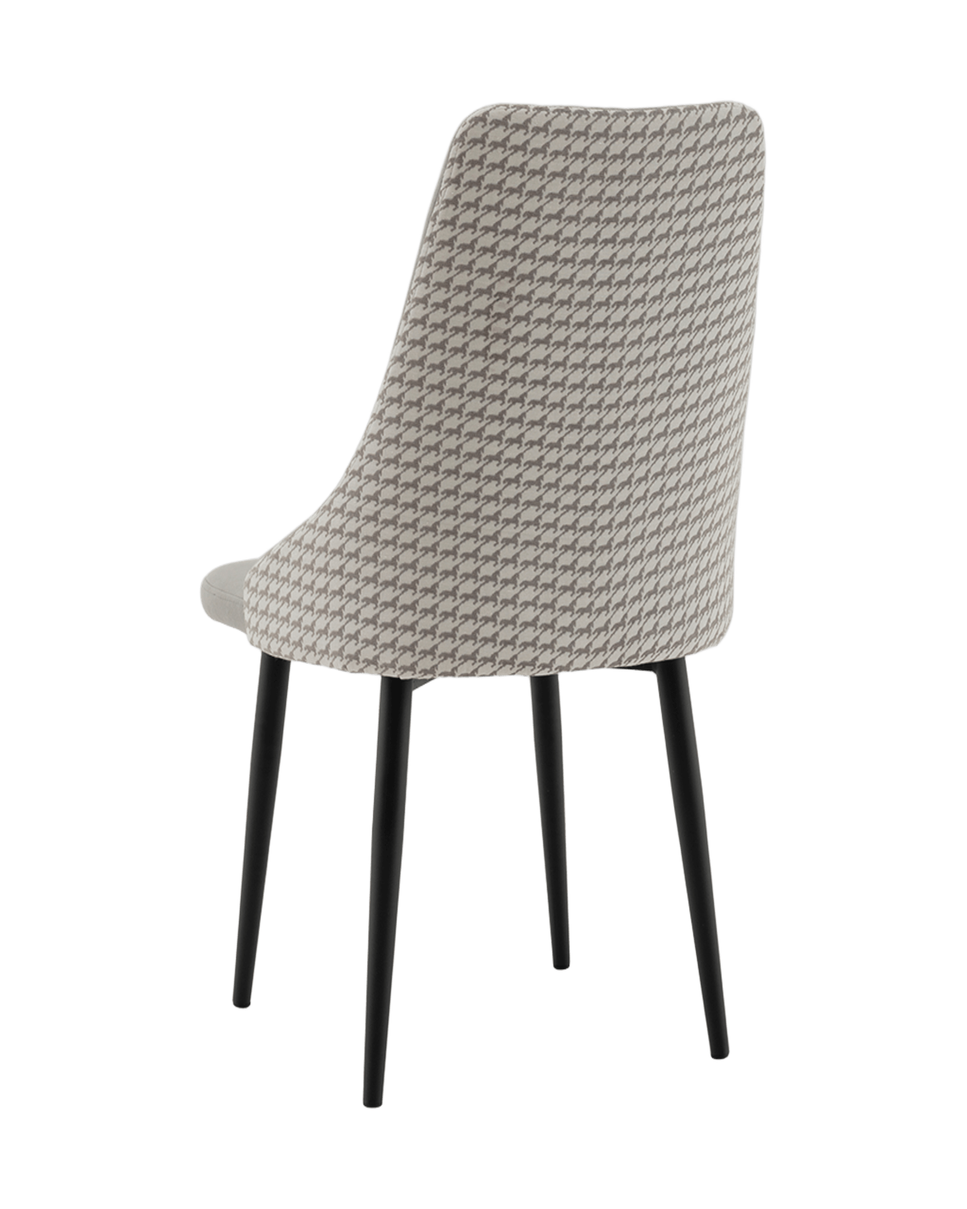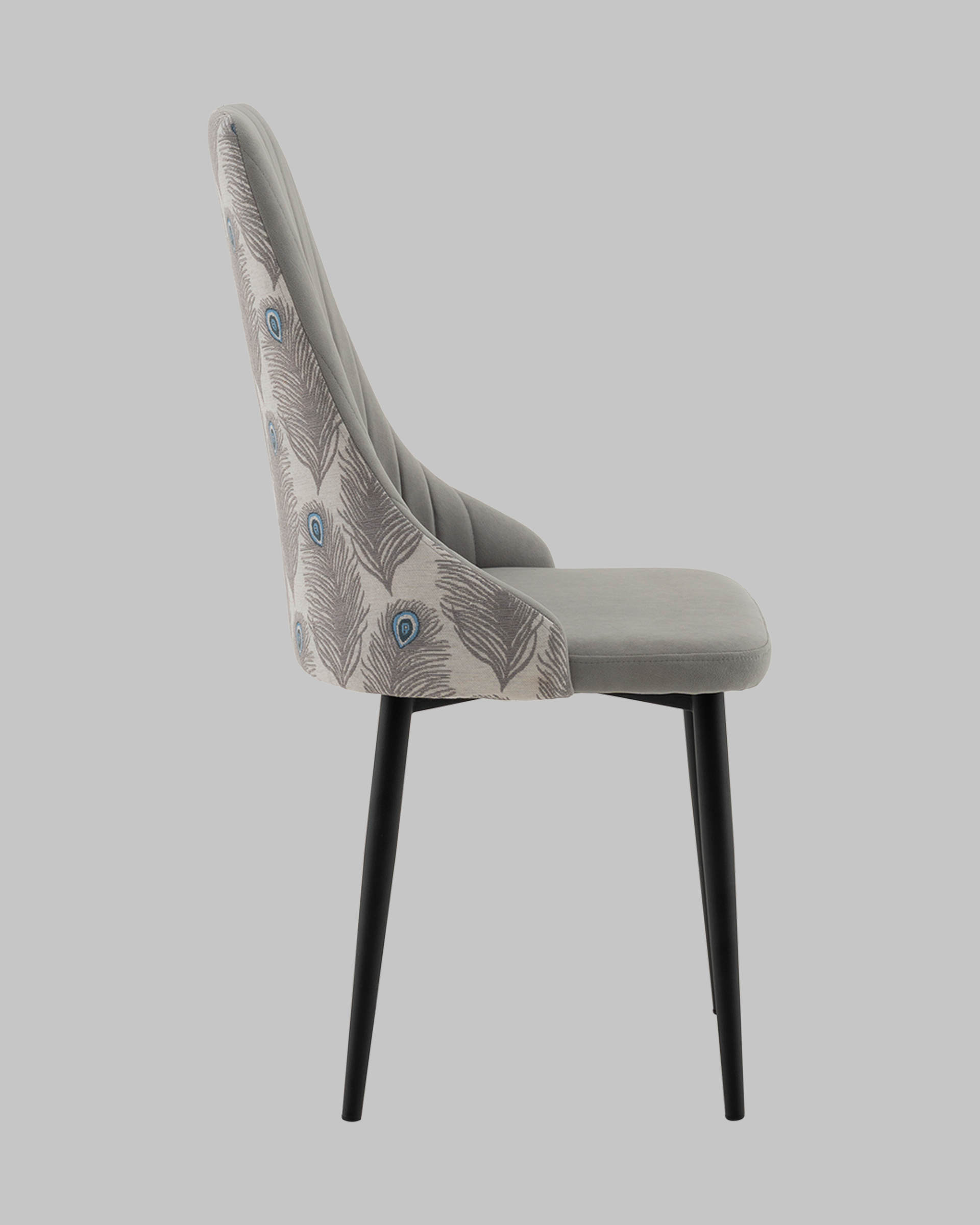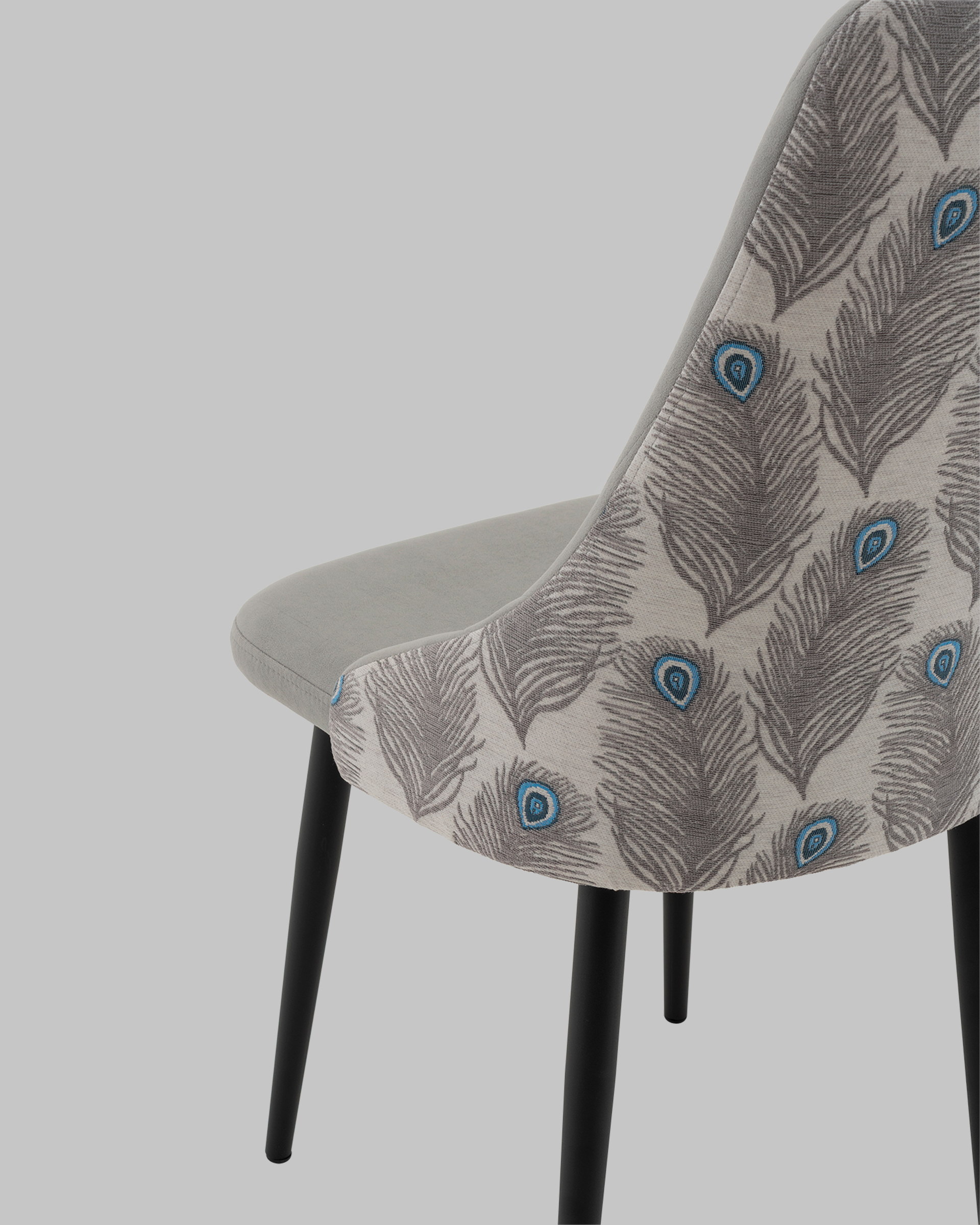 Задняя часть спинки украшена гобеленовой тканью с выразительным рисунком перьев — это изюминка модели, которая добавляет интерьеру индивидуальность и лёгкий этнический акцент. Удобное сиденье и высокая спинка обеспечивают комфортную посадку, а прочные металлические ножки в чёрном цвете гарантируют устойчивость и выдерживают нагрузку до 120 кг.