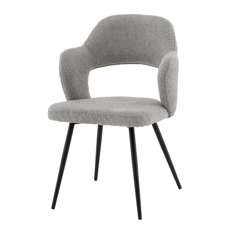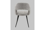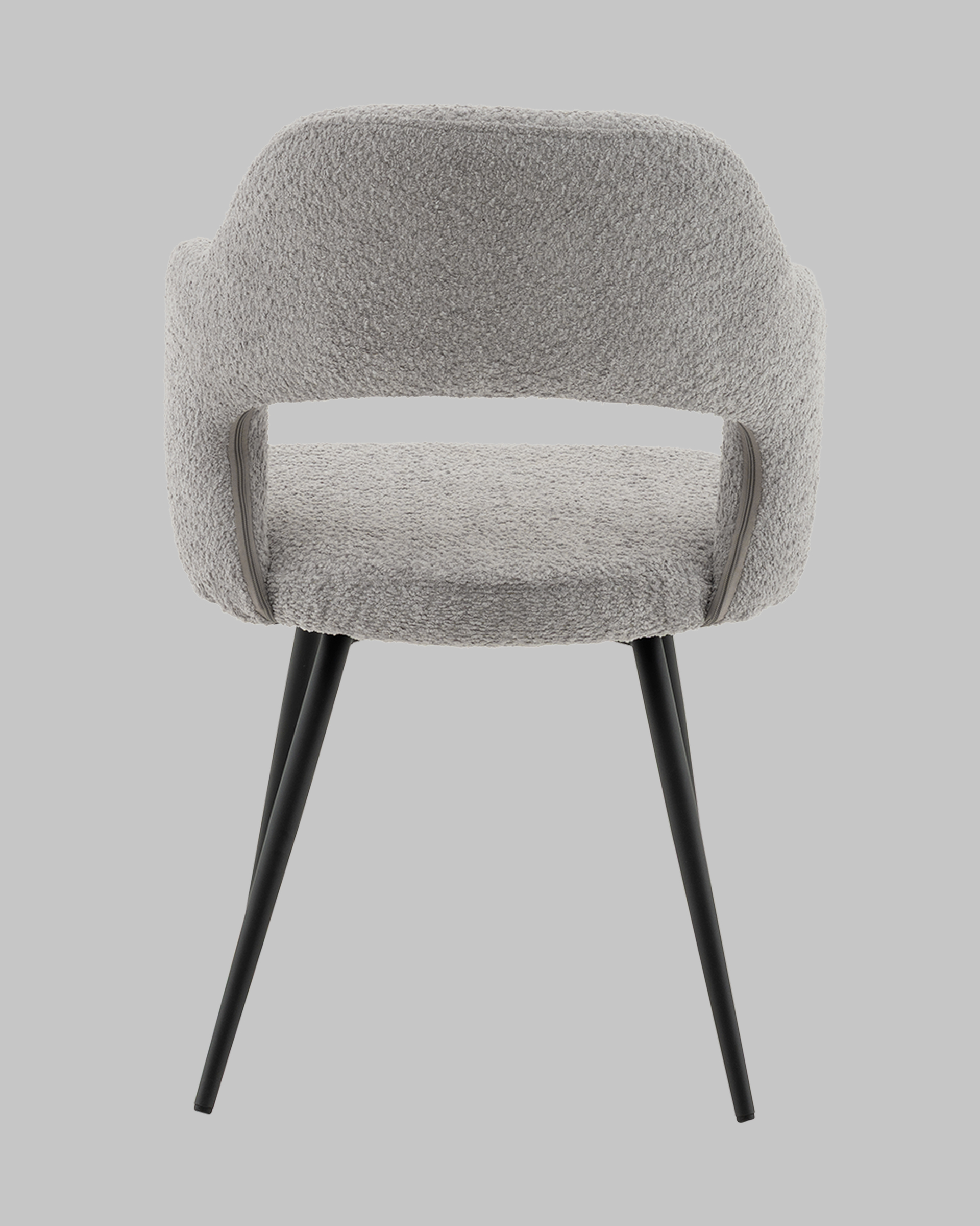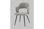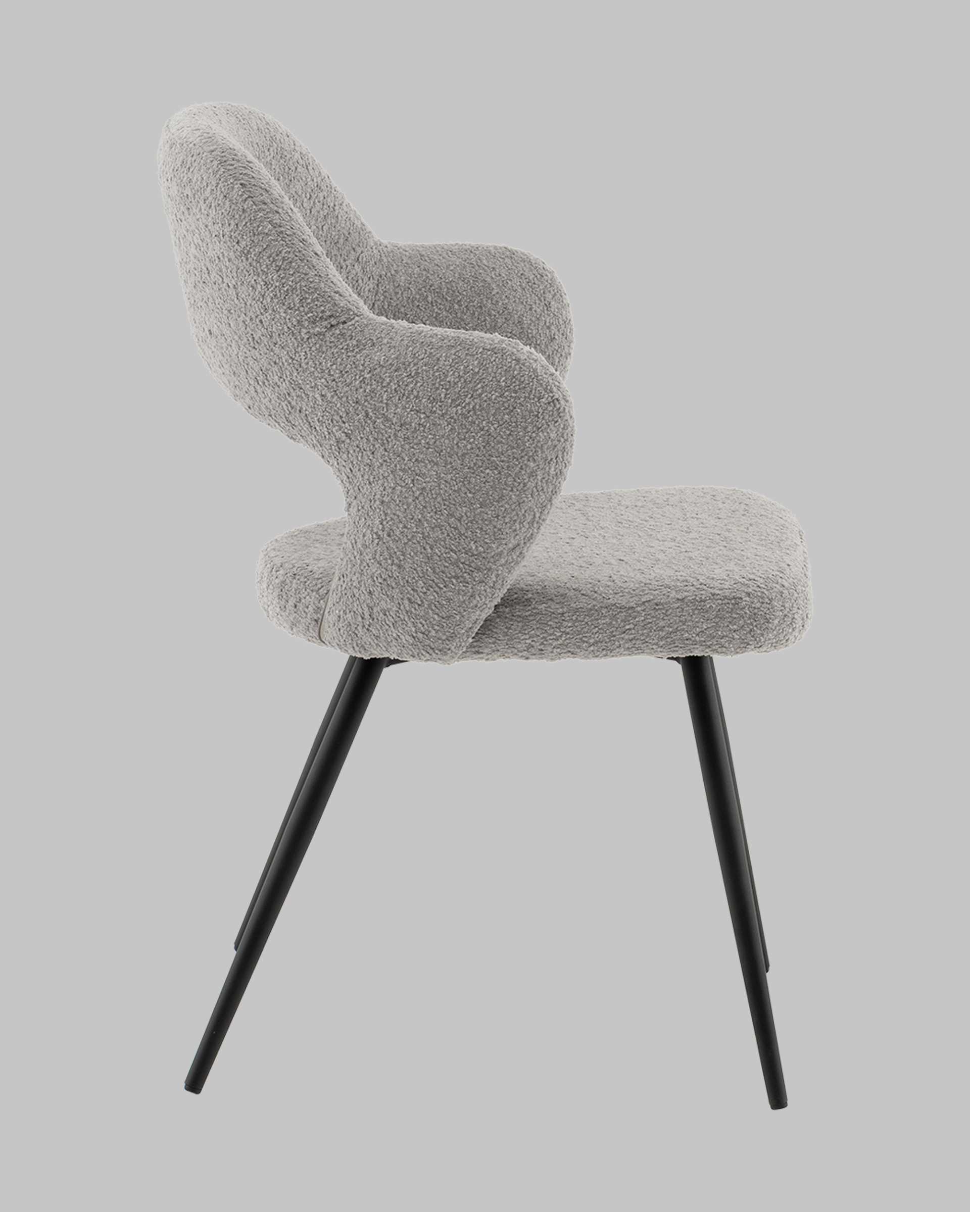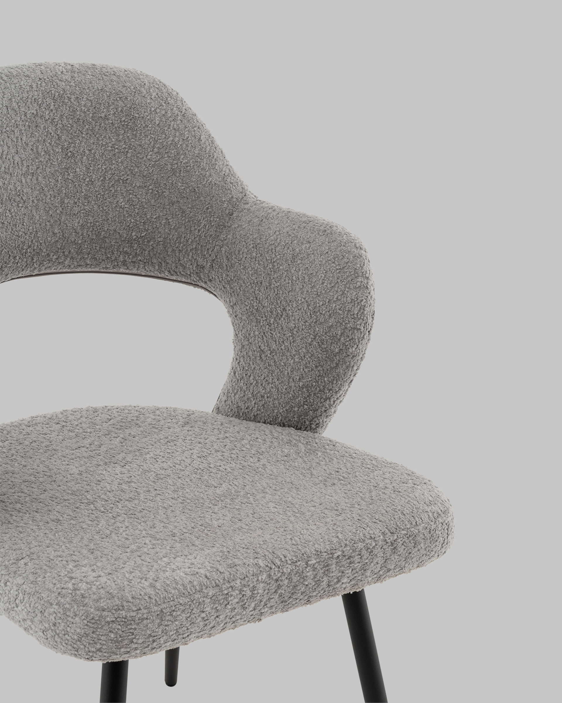 Стул для кухни Роккиана — это сочетание изысканных линий и домашнего тепла. Обивка из светло-серого букле придаёт модели мягкий, тактильный характер и визуальный уют. Эргономичная спинка с изящным вырезом и плавно изогнутые подлокотники подчёркивают современный стиль и делают силуэт лёгким и воздушным.
