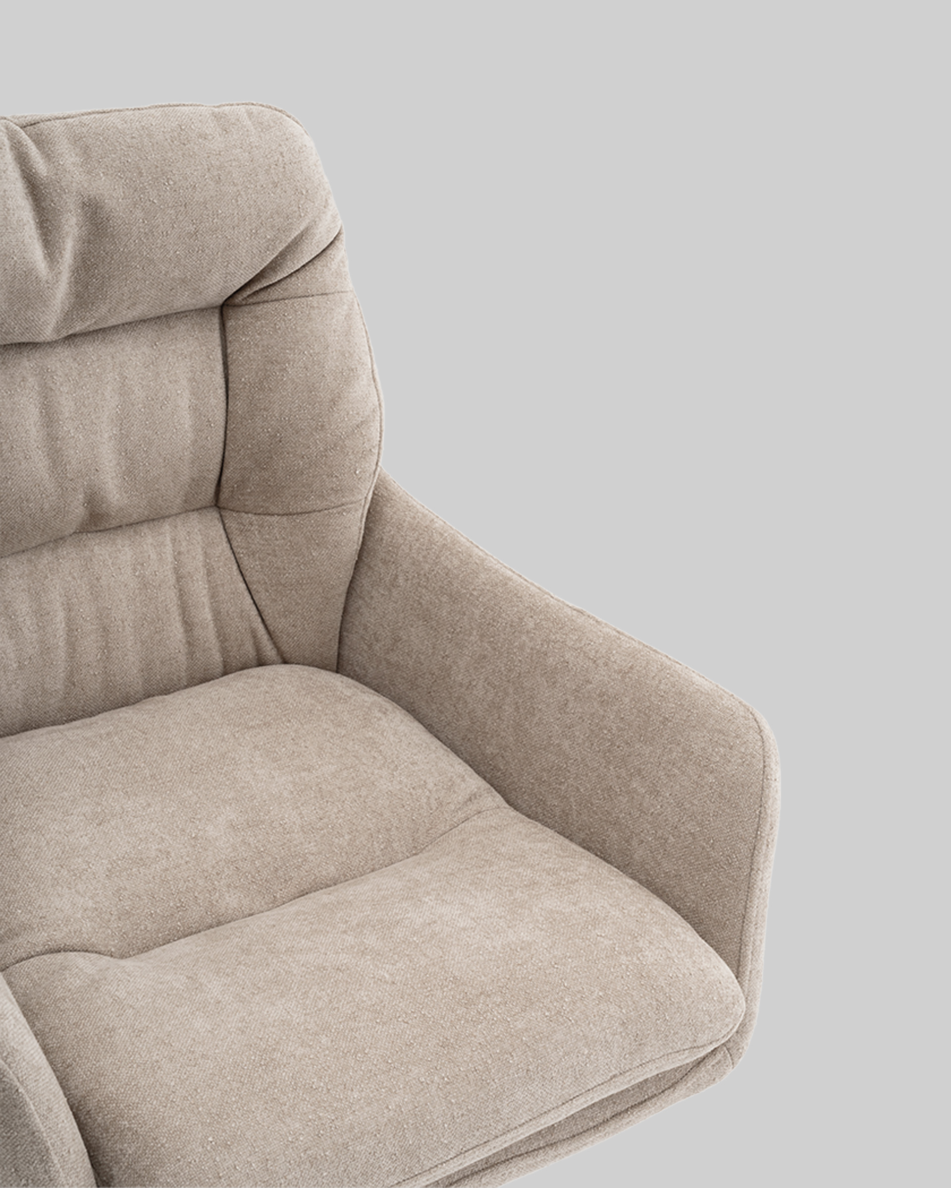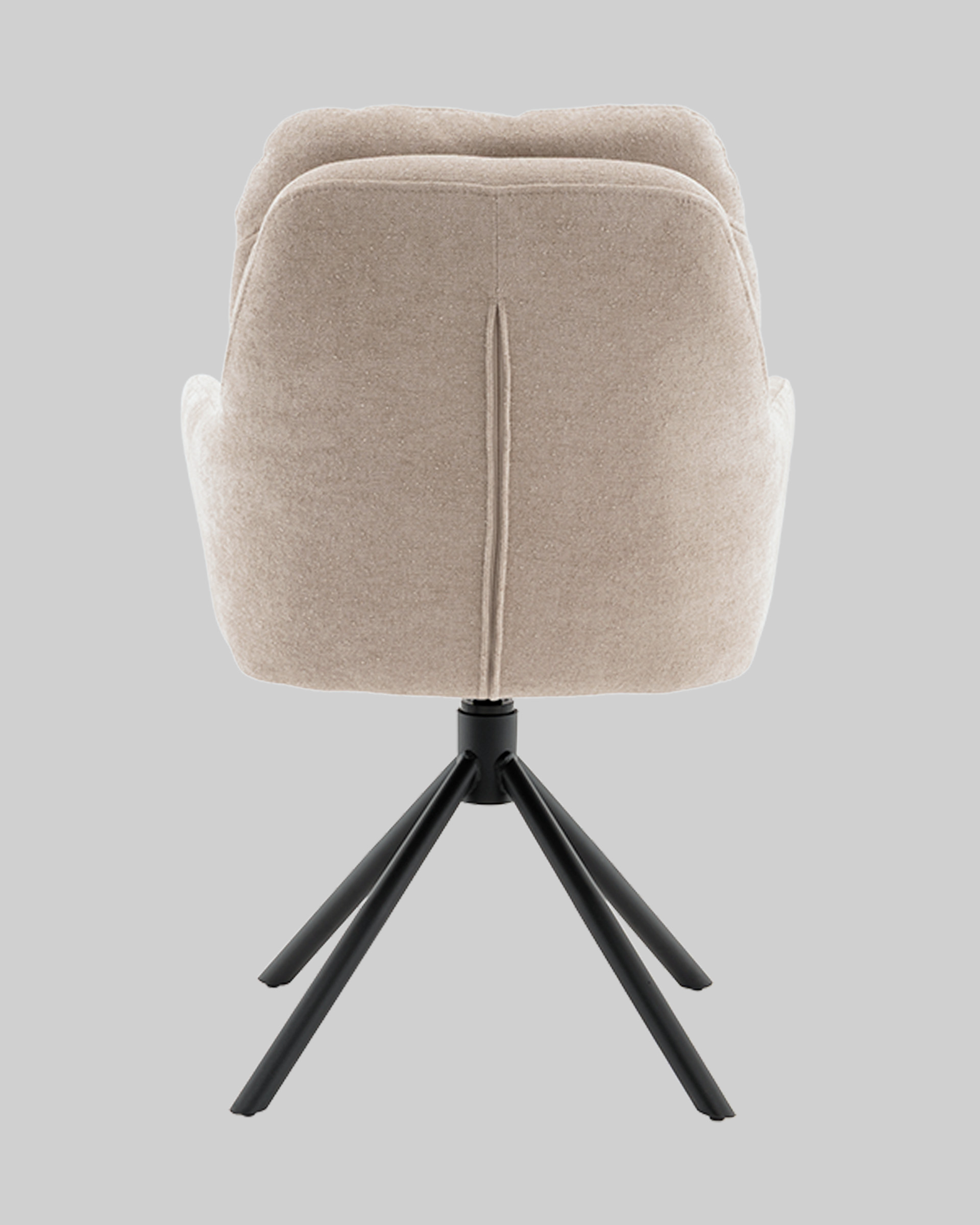 Высокая спинка с анатомическим изгибом и мягкие подлокотники обеспечивают комфортную поддержку во время отдыха или работы. Встроенный поворотный механизм с функцией возврата позволяет вращаться на 360° и автоматически возвращает сиденье в исходное положение, повышая удобство при общении и сохраняя аккуратный вид. Прочная металлическая база с четырьмя ногами гарантирует устойчивость и выдерживает нагрузку до 100 кг.
