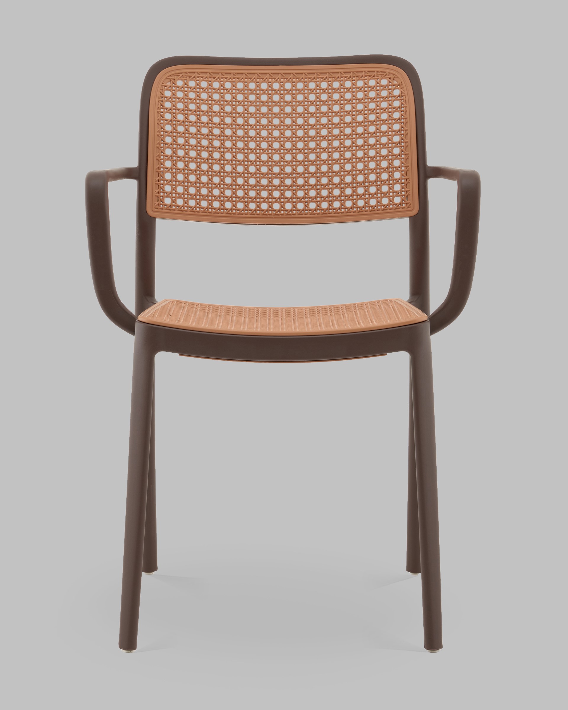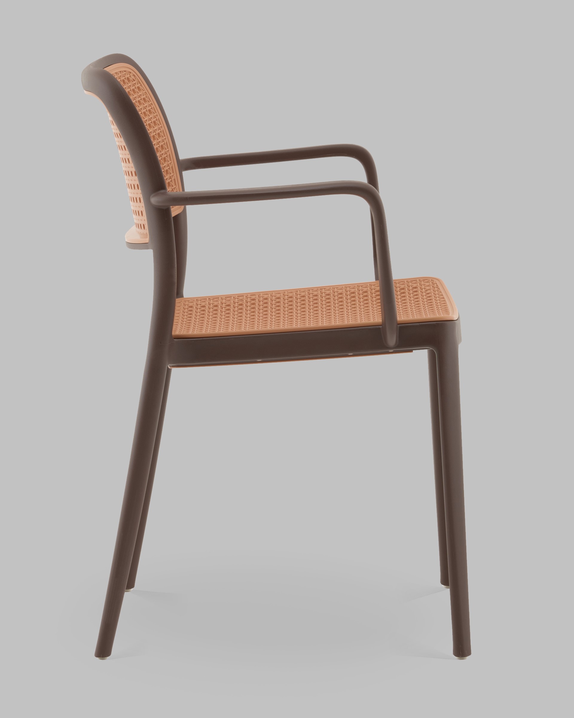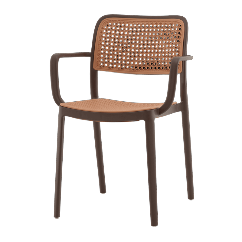 Yona с подлокотниками — это удачное сочетание современного минимализма и винтажного шика. Характерный плетёный узор сиденья и спинки в бежевом оттенке отсылает к традиционным ротанговым стульям, но выполнен полностью из прочного пластика. Коричневый каркас подчёркивает тёплую, натуральную эстетику, делая стул уютным акцентом в любом интерьере.