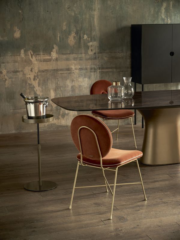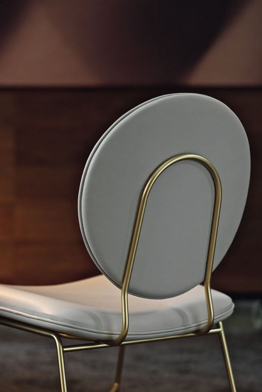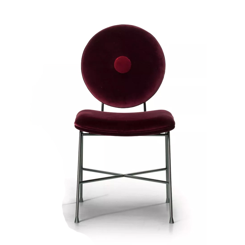 Запросить индивидуальное предложениеСтул с ножками из лакированной стали, в обивке из кожи, ткани, бархата или нубука на выбор. Ткань для пуговицы, задней части спинки и нижней части сидения также можно выбрать.