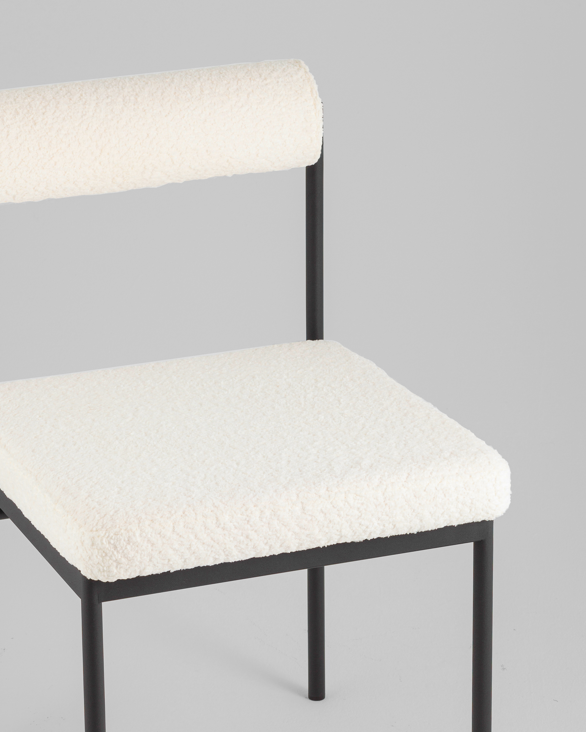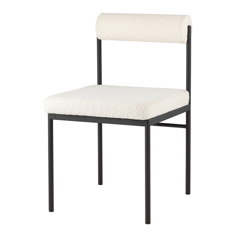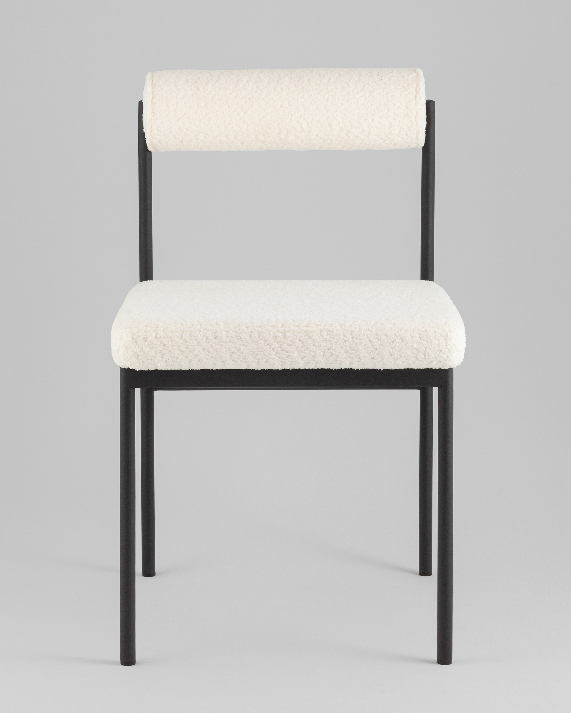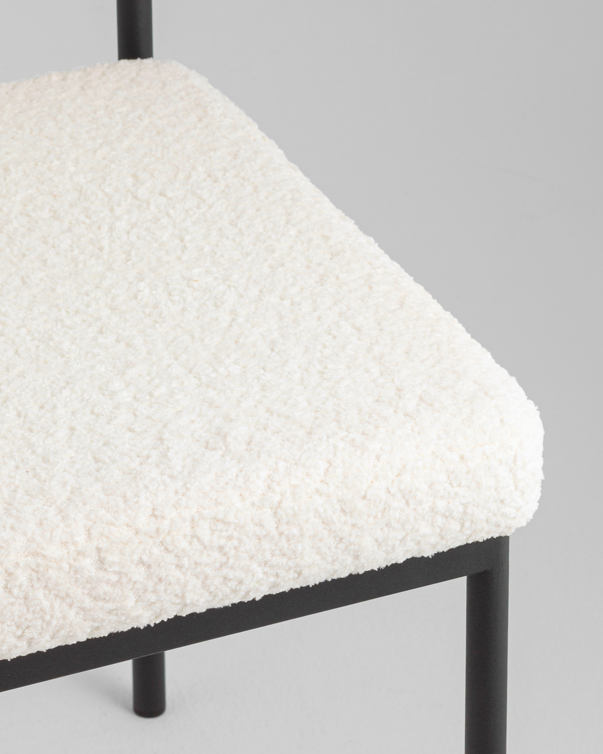 Мягкое сиденье и спинка выполнены из ткани букле — плотного и приятного на ощупь материала, который отличается устойчивостью к износу и эффектной фактурой. Обивка выдерживает активную эксплуатацию, оставаясь уютной и презентабельной. Каркас выполнен из металла и ДСП, обеспечивая надежную конструкцию. Металлические ножки окрашены в черный цвет и дополнены подпятниками, защищающими пол от царапин и предотвращающими скольжение.