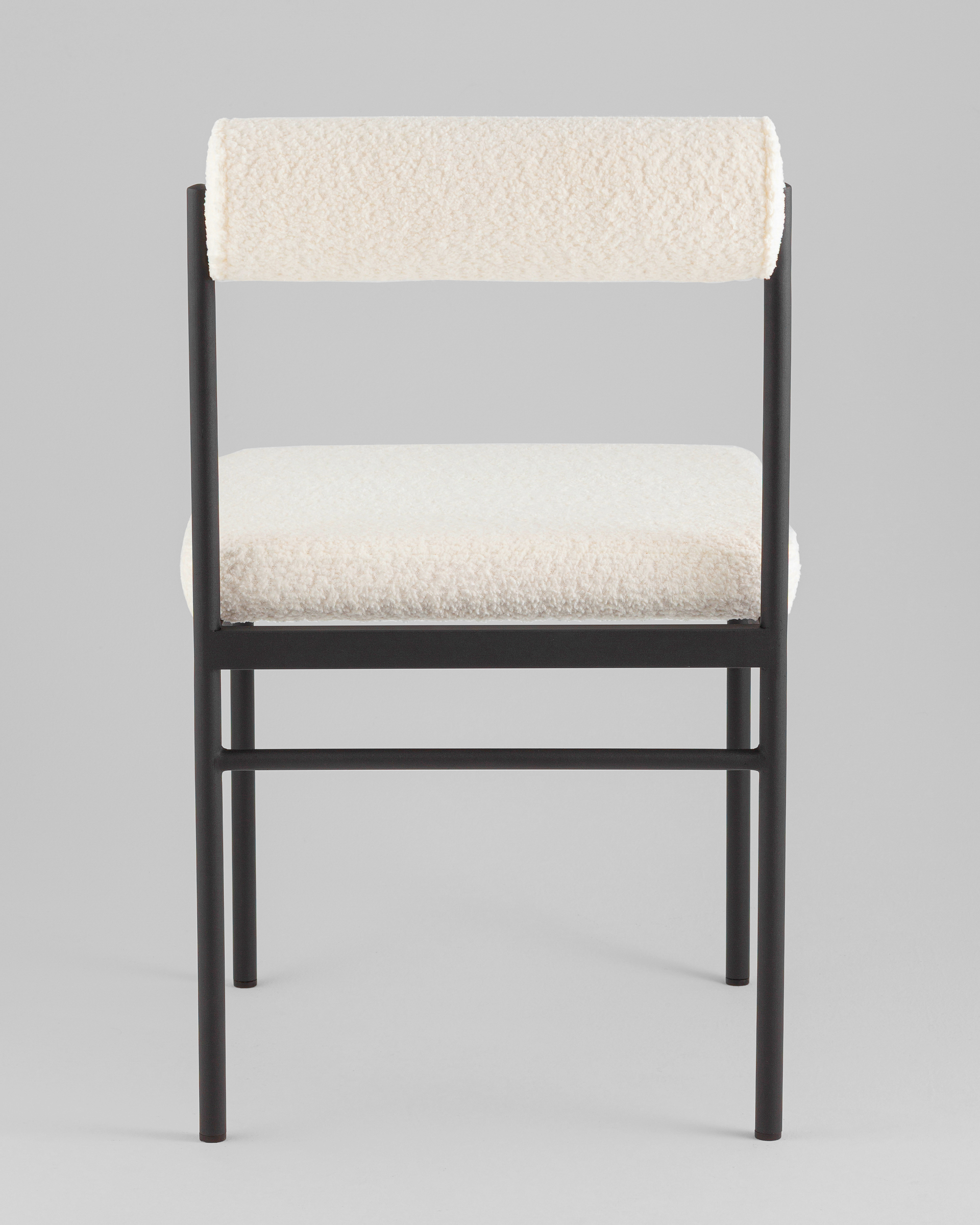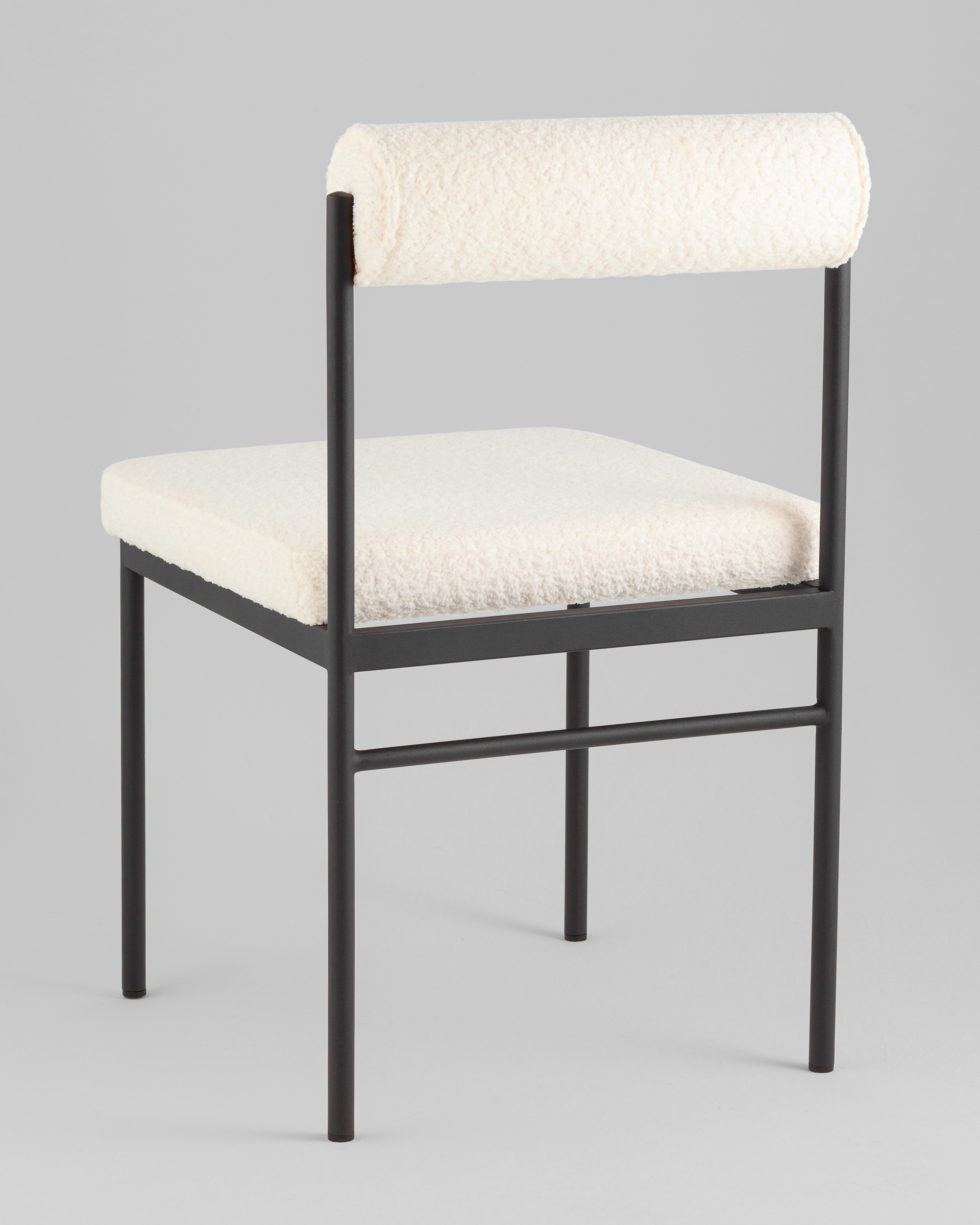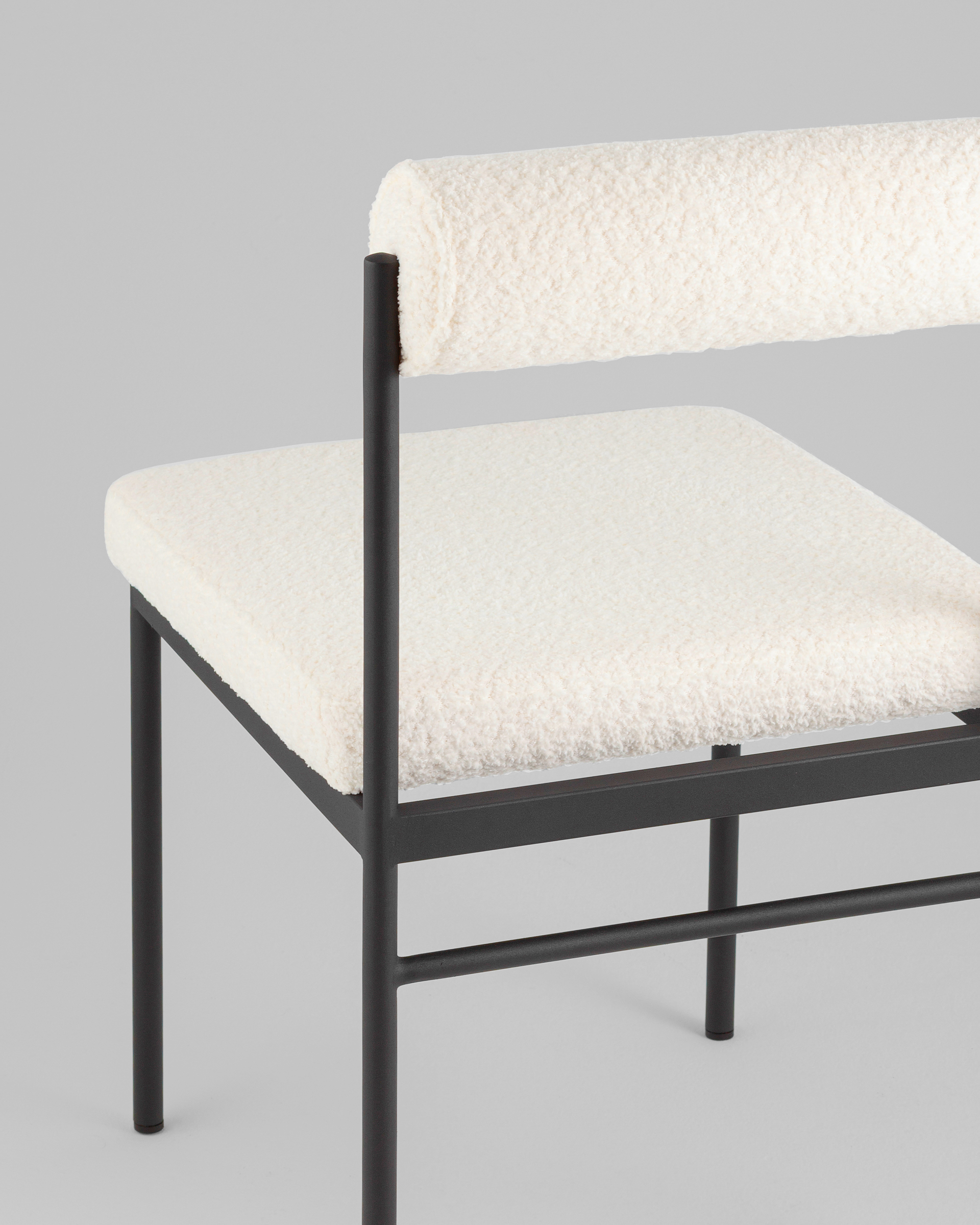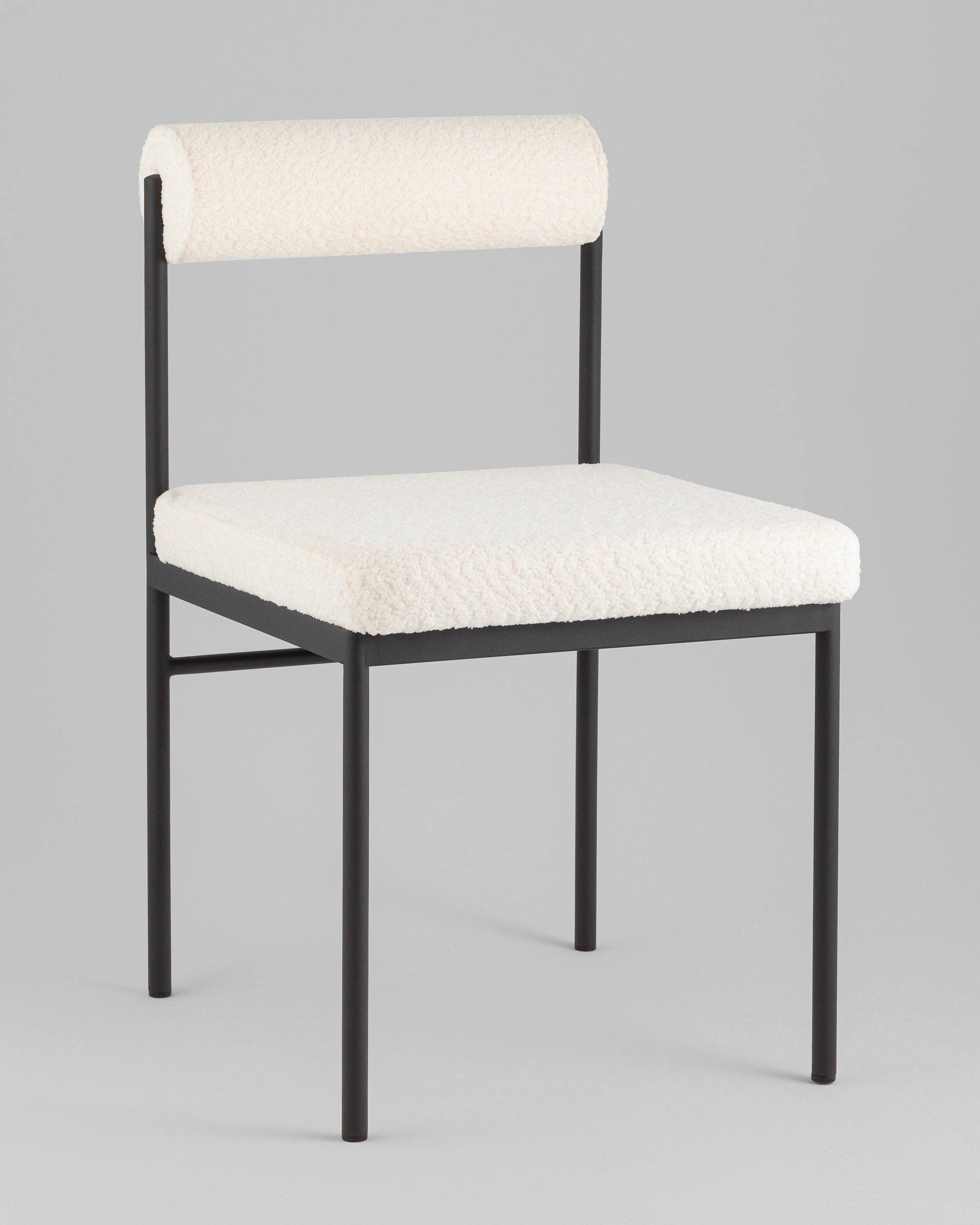 Мягкое сиденье и спинка выполнены из ткани букле — плотного и приятного на ощупь материала, который отличается устойчивостью к износу и эффектной фактурой. Обивка выдерживает активную эксплуатацию, оставаясь уютной и презентабельной. Каркас выполнен из металла и ДСП, обеспечивая надежную конструкцию. Металлические ножки окрашены в черный цвет и дополнены подпятниками, защищающими пол от царапин и предотвращающими скольжение.