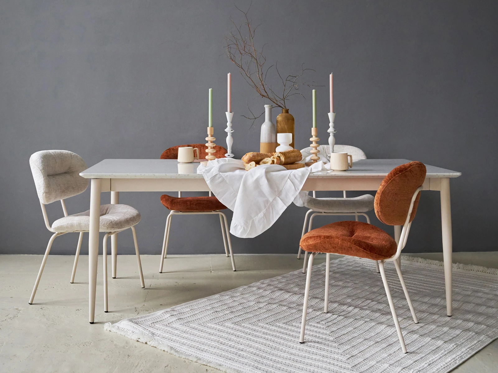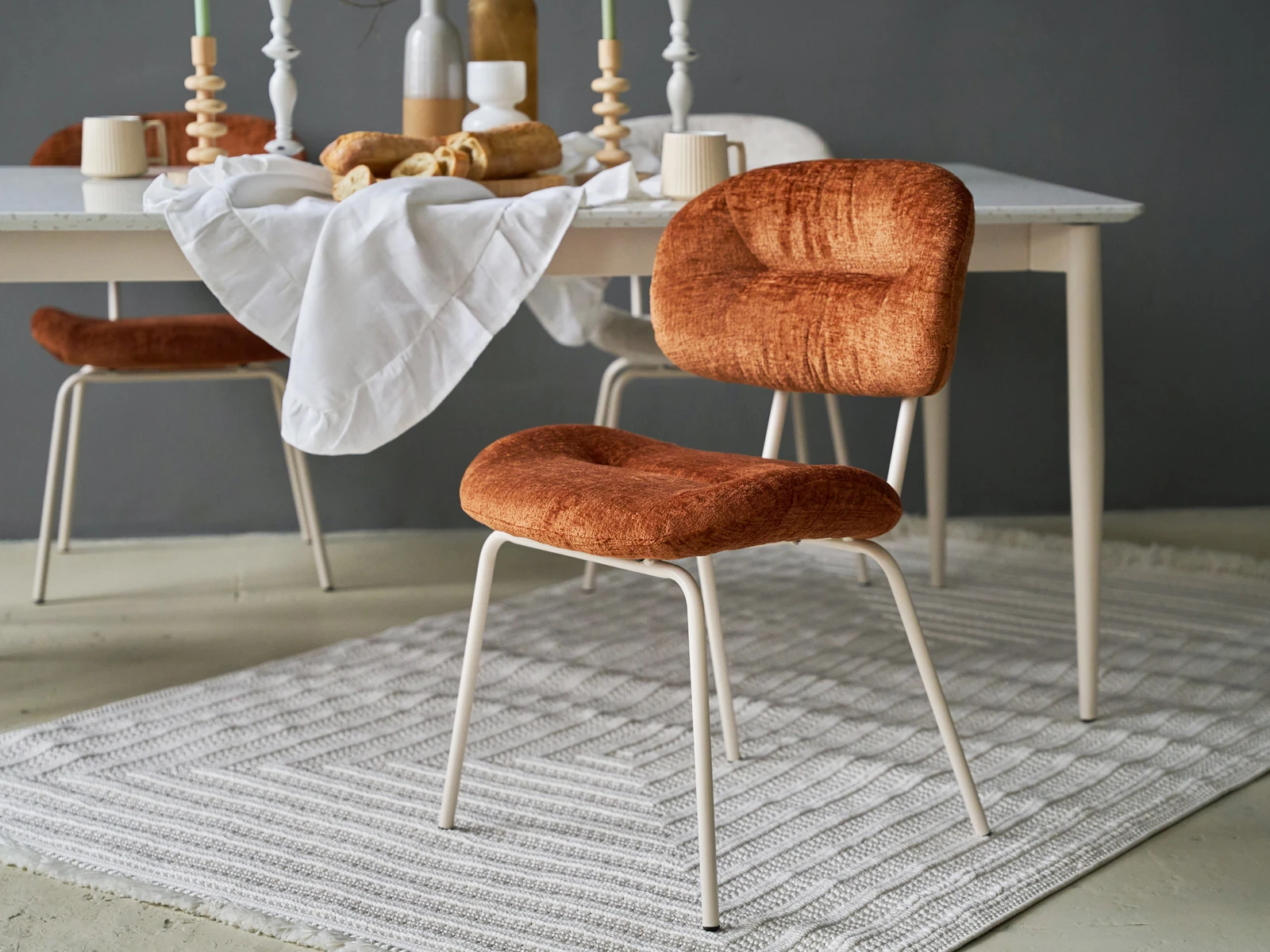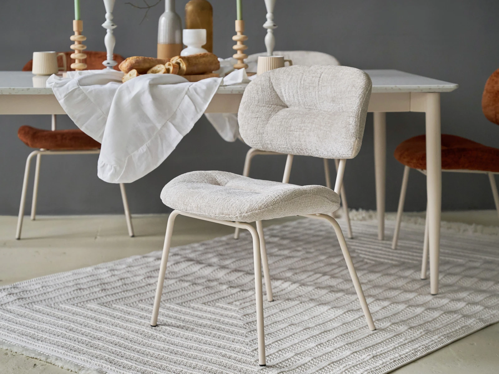 Материал обивки - шенилл, материал ножек - металл с кремовым порошковым покрытием.