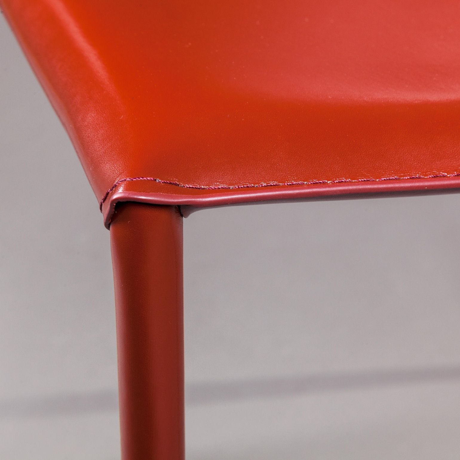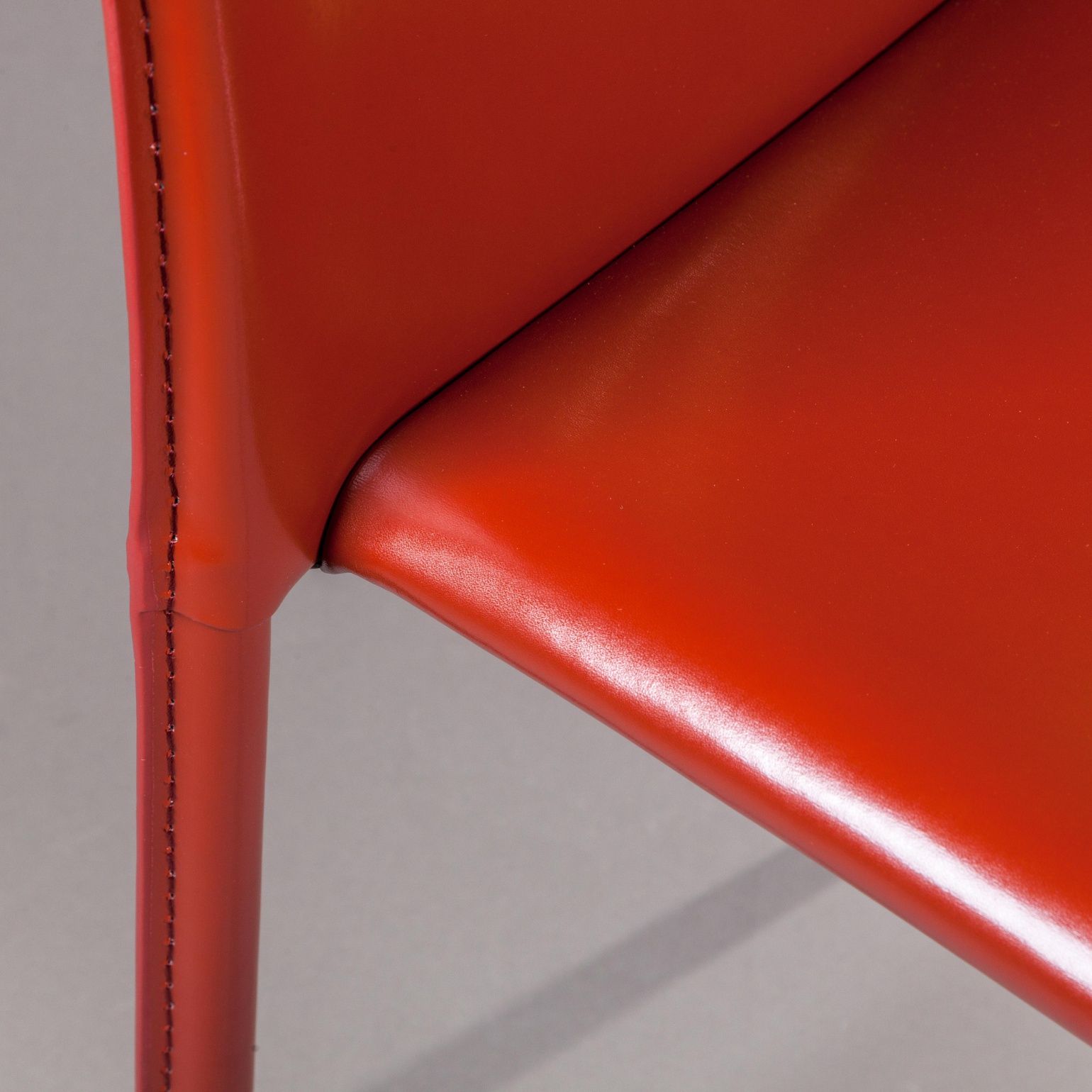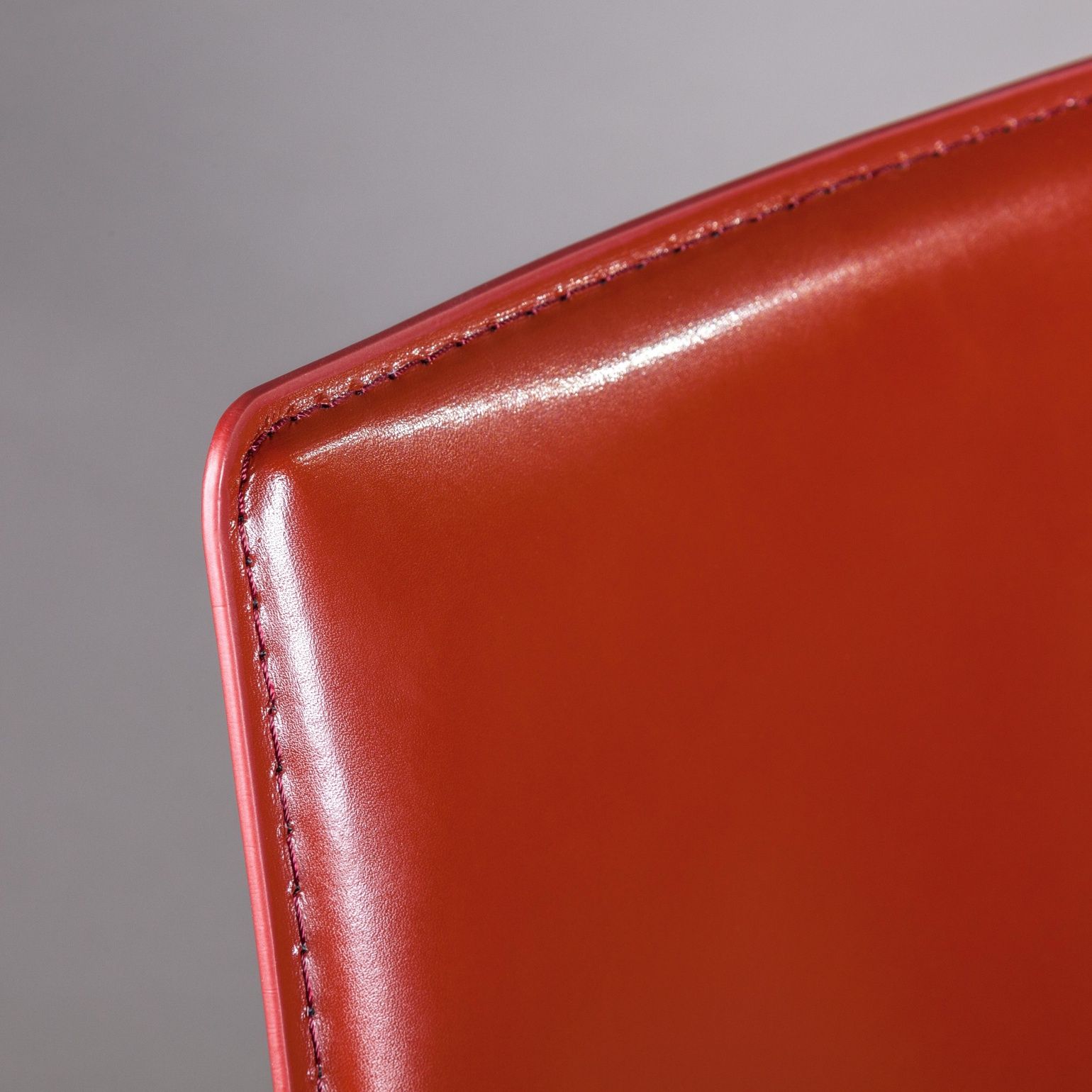 Крепкие металлические ножки скрыты под натуральной кожей такого же цвета, как и сам стул, благодаря этому создается лаконичный образ единого целого. На ножках предусмотрены специальные пластиковые накладки, которые придают стулу дополнительную устойчивость и защищают пол от царапин.