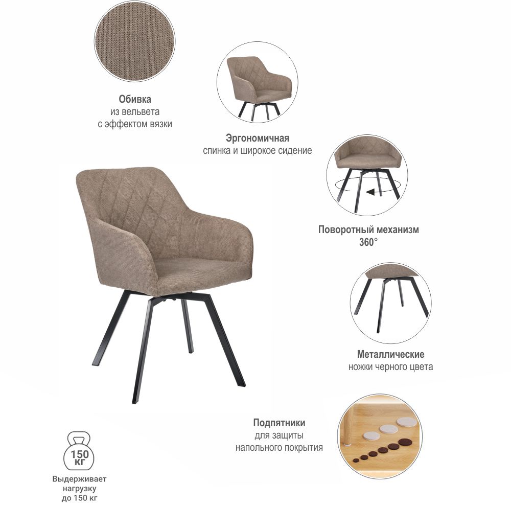 Стул Tomas c поворотным механизмом в мягком и уютном вельвете с эффектом "вязки" отлично впишется в любой интерьер – от модерна до классики. И все это благодаря своим плавным и утонченным формам в спинке, подлокотниках и сидении и современным металлическим ножкам черного цвета. Самые трендовые цвета обивки позволят органично вписать стул в интерьер с любой современной отделкой. Отличительной особенностью стула Томас является наличие поворотного механизма, который гарантированно позволит удобно расположиться и по-настоящему расслабиться. Благодаря широкому сидению и удобной посадке эта модель может использоваться не только в зоне кухни либо столовой, но и в гостиной, рабочем кабинете, спальне. Модель также актуальна для общественных интерьеров - офис, кафе, зоны ресепшен.