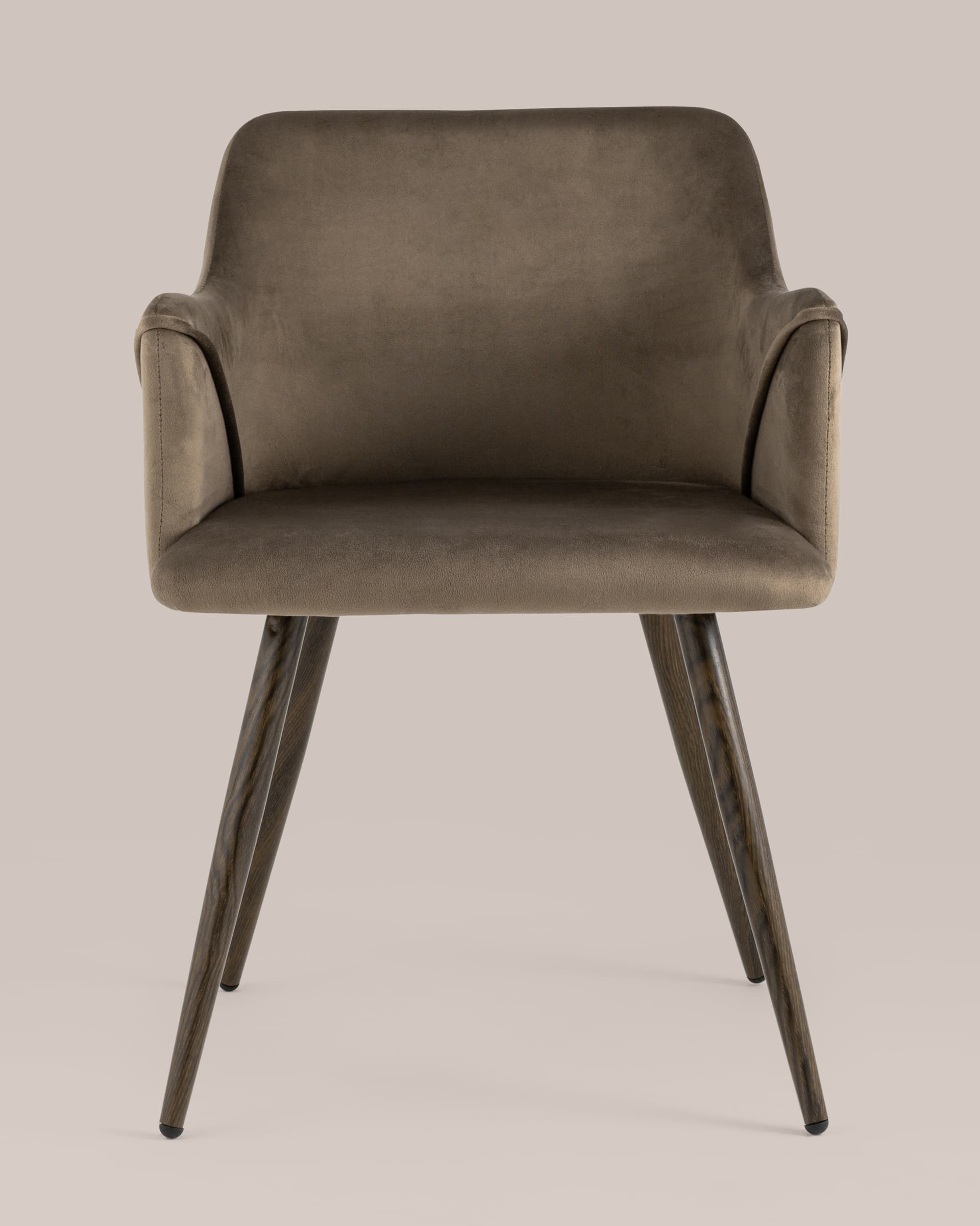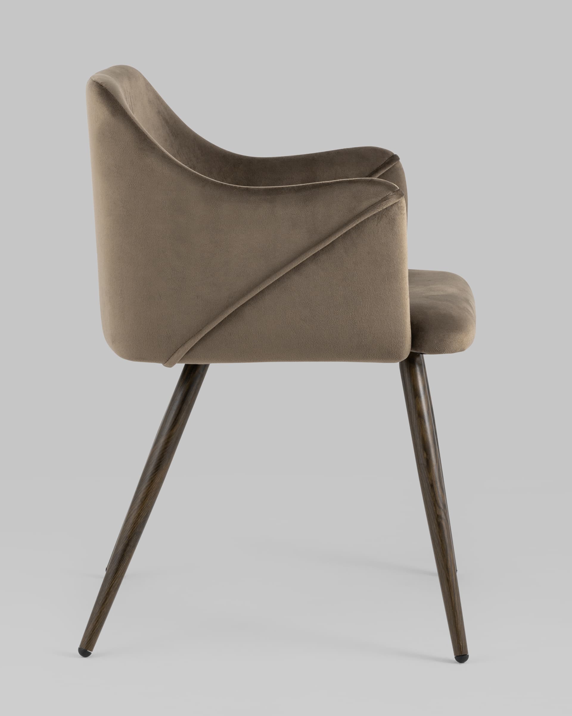 Запросить индивидуальное предложениеСтильный и мягкий кухонный стул имеет широкую эргономичную спинку и удобные подлокотники. Обивкой послужила высококачественная плотная ткань. Ножки металлические с принтом под дерево. Высота подлокотников от пола - 63,5 см.