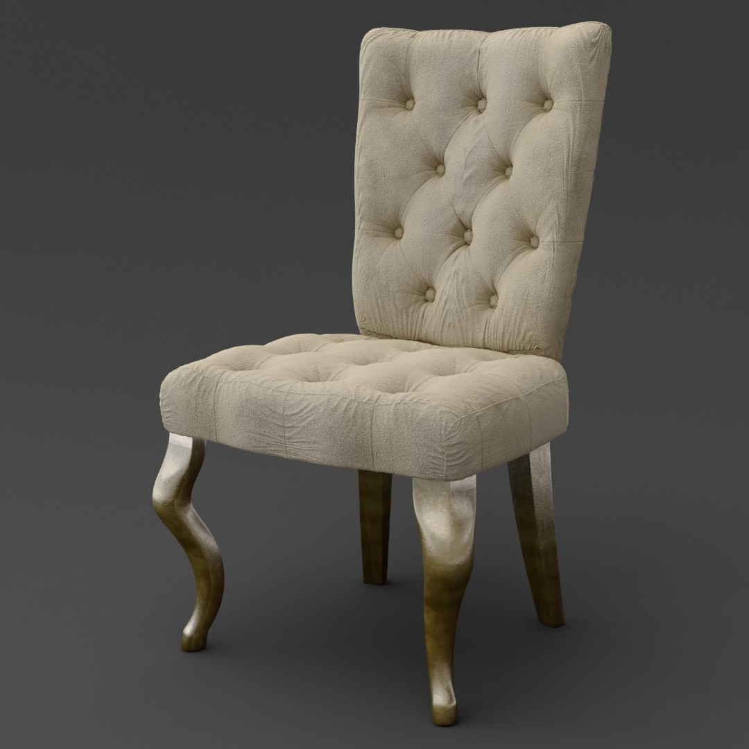 Стул с высокой спинкой выполнен в современном стиле. Гнутые ножки в отделке сусальное серебро, покрытое лаком шампань. Сиденье и спинка обиты бежевым велюром и декорированы стежкой капитоне с пуговицами в ткани. Сделан из массива дерева.