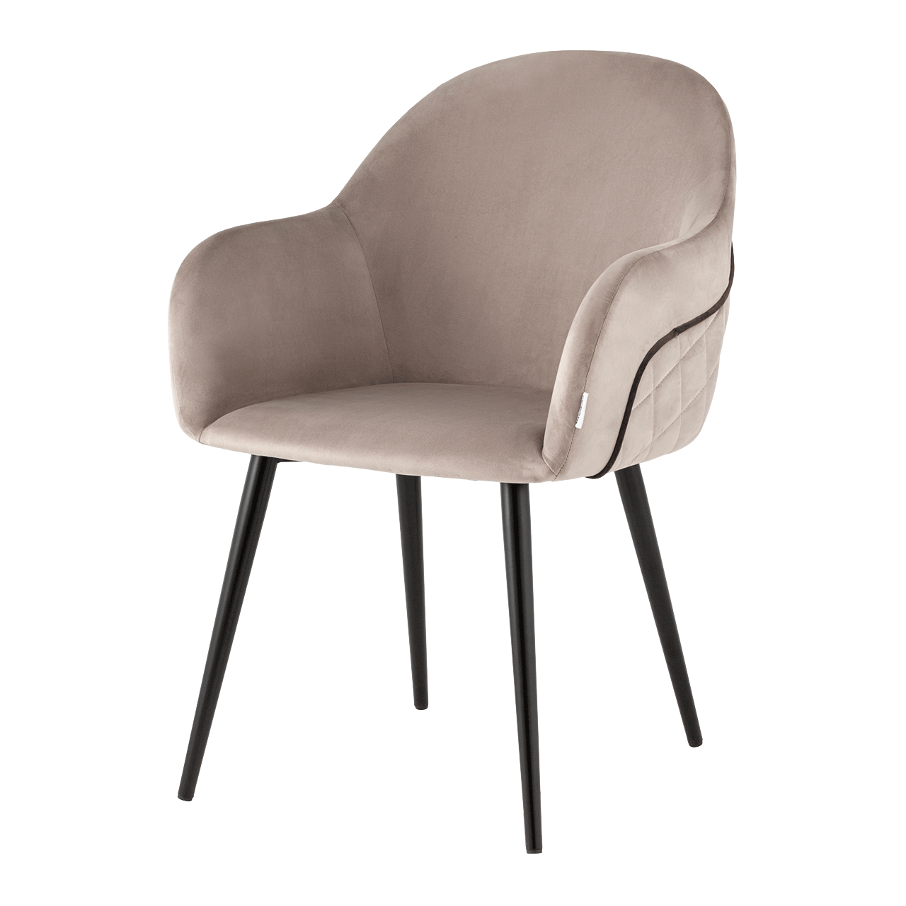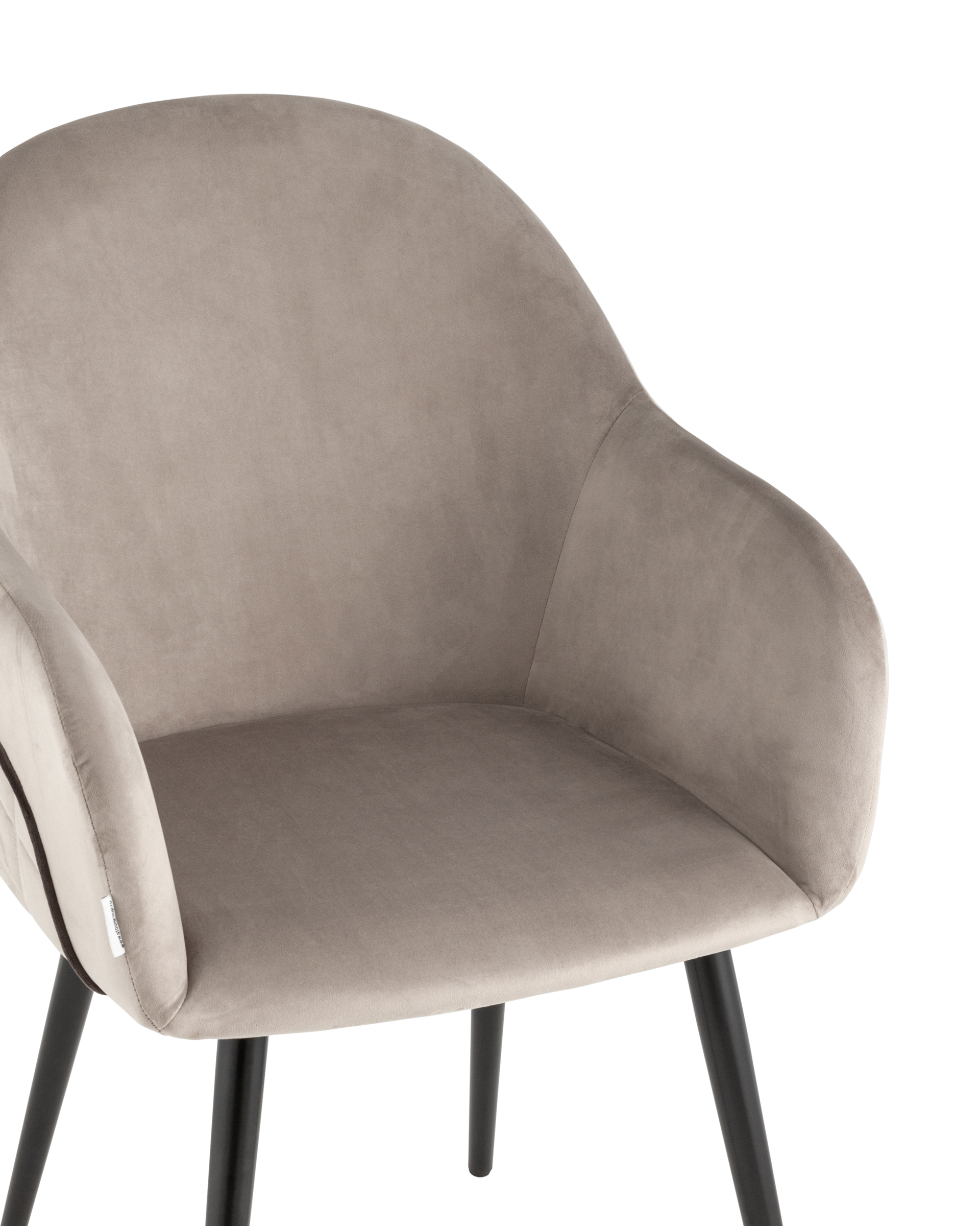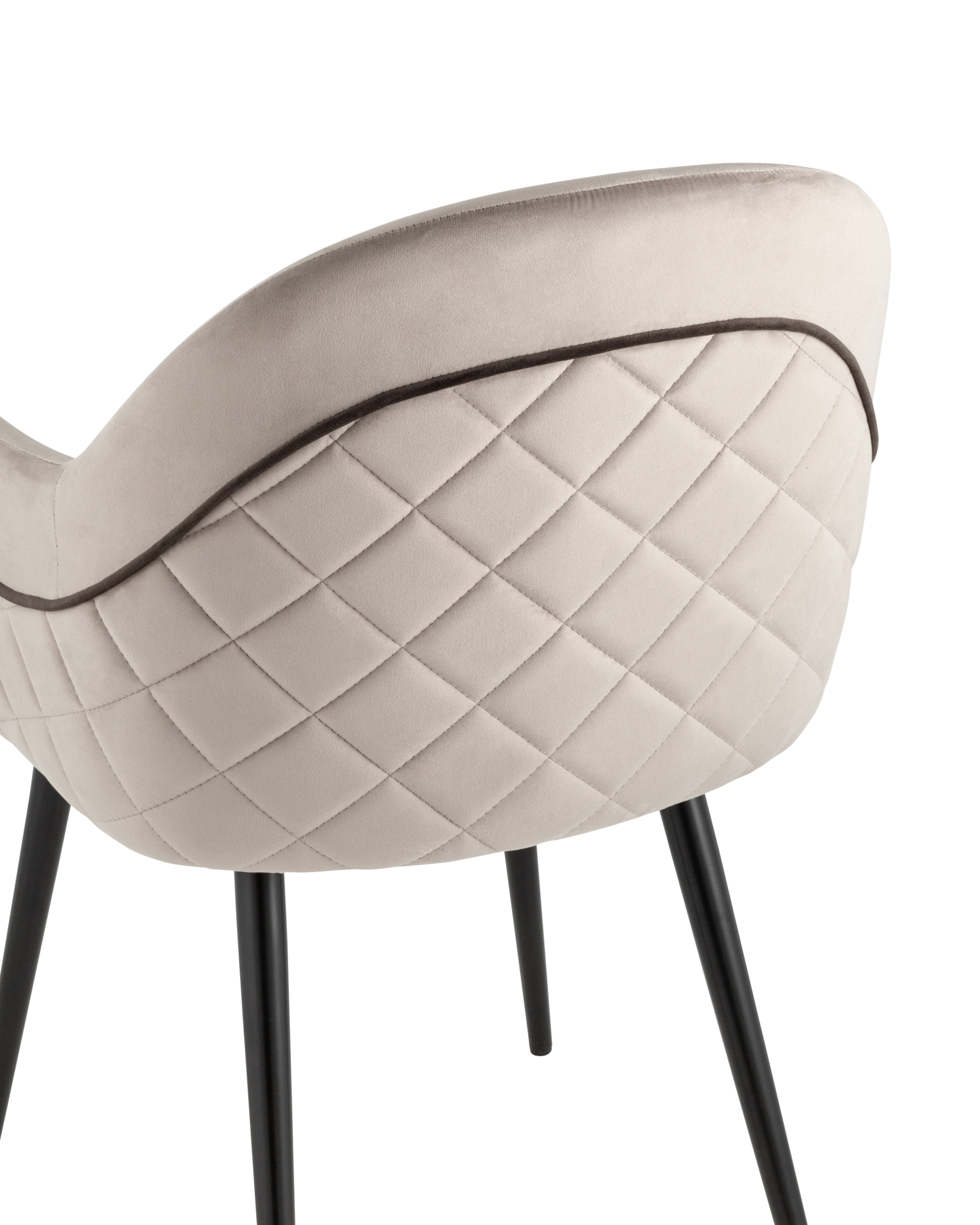 Обивка выполнена из велюра, прочного и износостойкого материала. Внешняя сторона спинки украшена ромбовидной стежкой. Подлокотники, высотой 20 см, обеспечат максимальный комфорт. Прочные металлические ножки в черном цвете выдерживают нагрузку до 120 кг. На ножках дополнительно предусмотрены специальные подпятники, которые предотвращают скольжение и повреждение напольного покрытия.