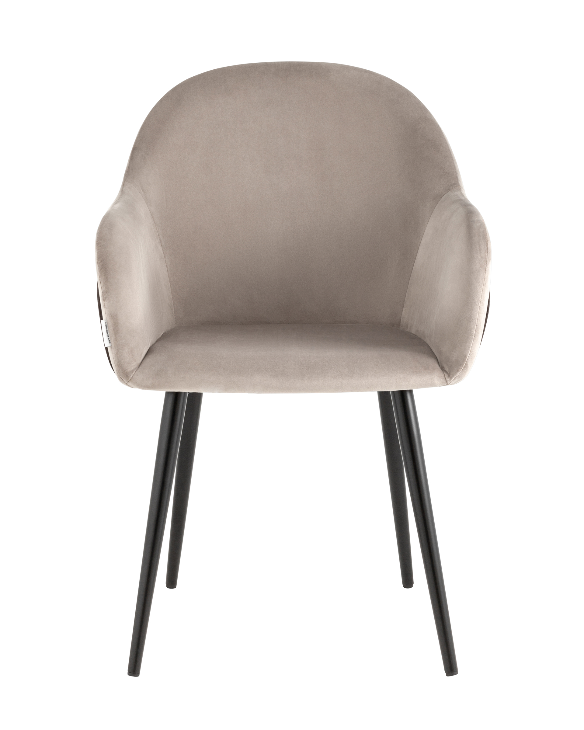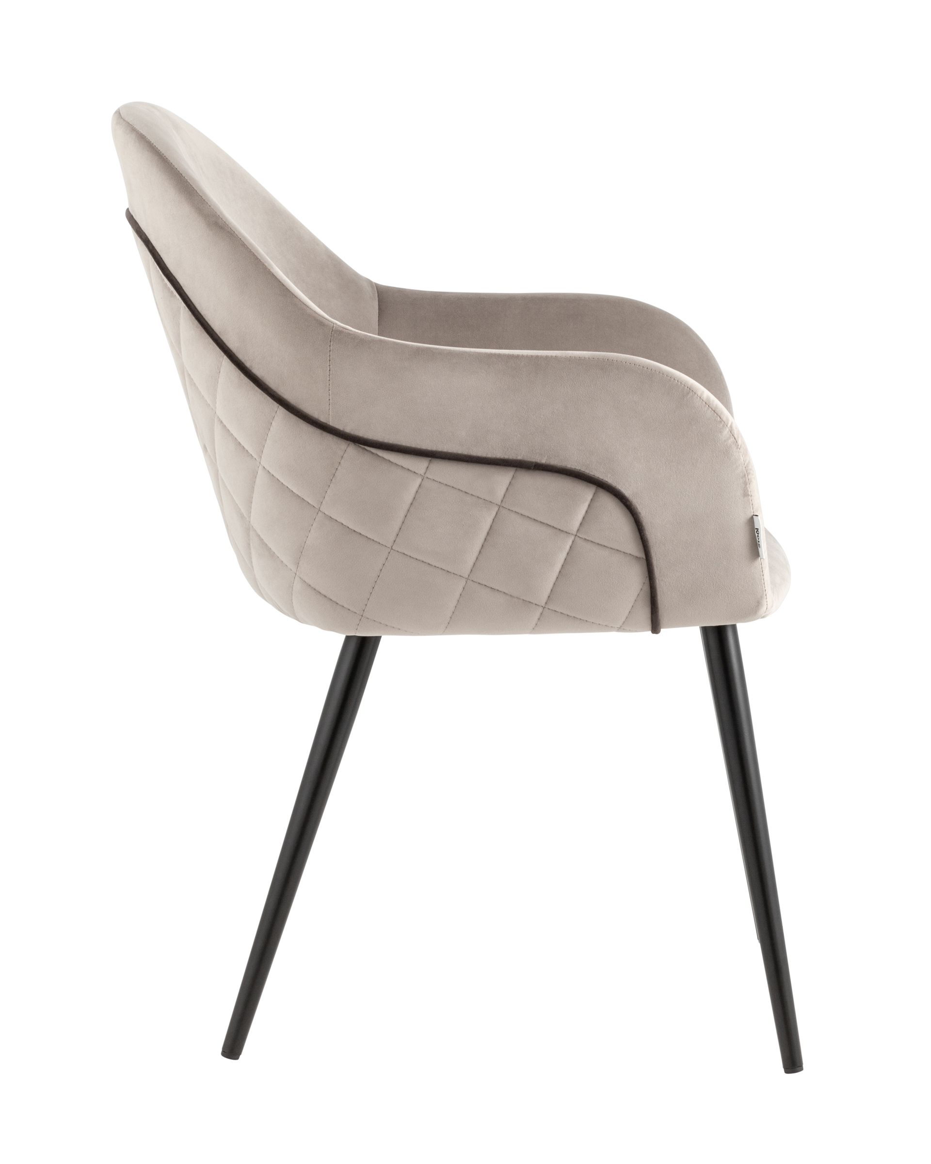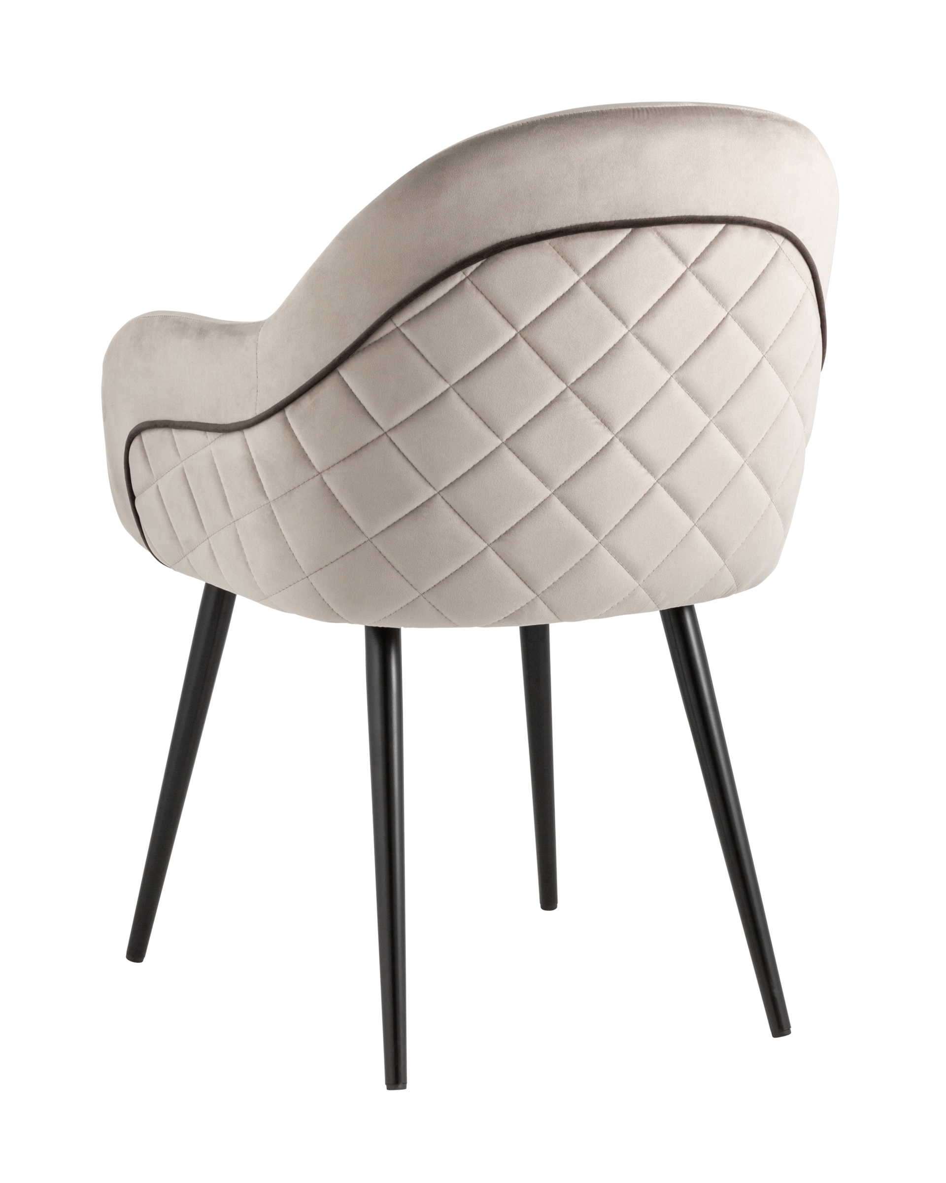 Обивка выполнена из велюра, прочного и износостойкого материала. Внешняя сторона спинки украшена ромбовидной стежкой. Подлокотники, высотой 20 см, обеспечат максимальный комфорт. Прочные металлические ножки в черном цвете выдерживают нагрузку до 120 кг. На ножках дополнительно предусмотрены специальные подпятники, которые предотвращают скольжение и повреждение напольного покрытия.
