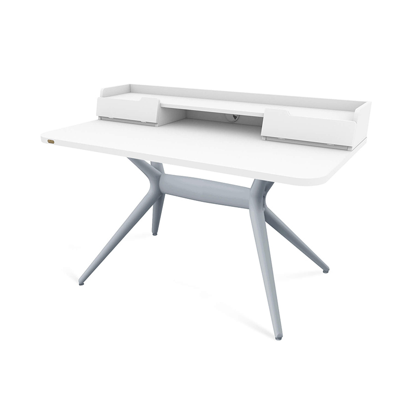 Сдержанный стиль столешницы идеально сочетается с мебелью в современном стиле. На рабочей поверхности расположены два вместительных выдвижных ящика высотой 165 мм и шириной 318 мм для хранения разных вещей. Удобная ниша между ящиками на столешнице подходит для ноутбука. Столешница оборудована системой кабель-менеджмента. В заднем бортике имеется отверстие для проводов, что позволяет удобно расположить зарядку для ноутбука или технические кабели компьютера.