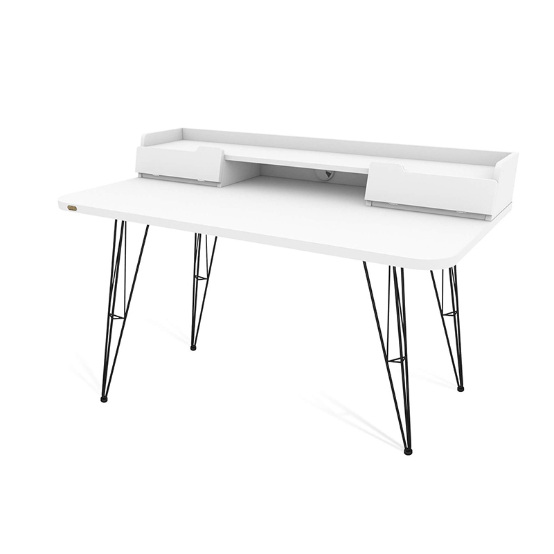 Сдержанный стиль столешницы идеально сочетается с мебелью в современном стиле. На рабочей поверхности расположены два вместительных выдвижных ящика высотой 165 мм и шириной 318 мм для хранения разных вещей. Удобная ниша между ящиками на столешнице подходит для ноутбука. Столешница оборудована системой кабель-менеджмента. В заднем бортике имеется отверстие для проводов, что позволяет удобно расположить зарядку для ноутбука или технические кабели компьютера.
