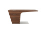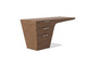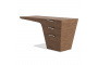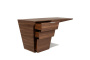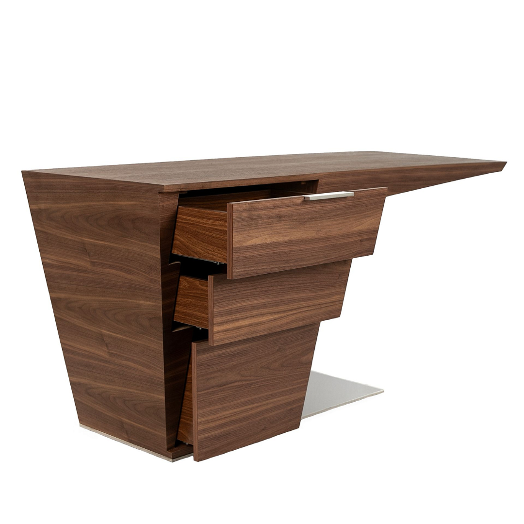 Стол выполнен в форме угла, где одна грань — это столешница, а вторая — трапецевидная тумба с ящиками. Прямоугольную столешницу подпирает нога, полностью повторяющая форму изделия.