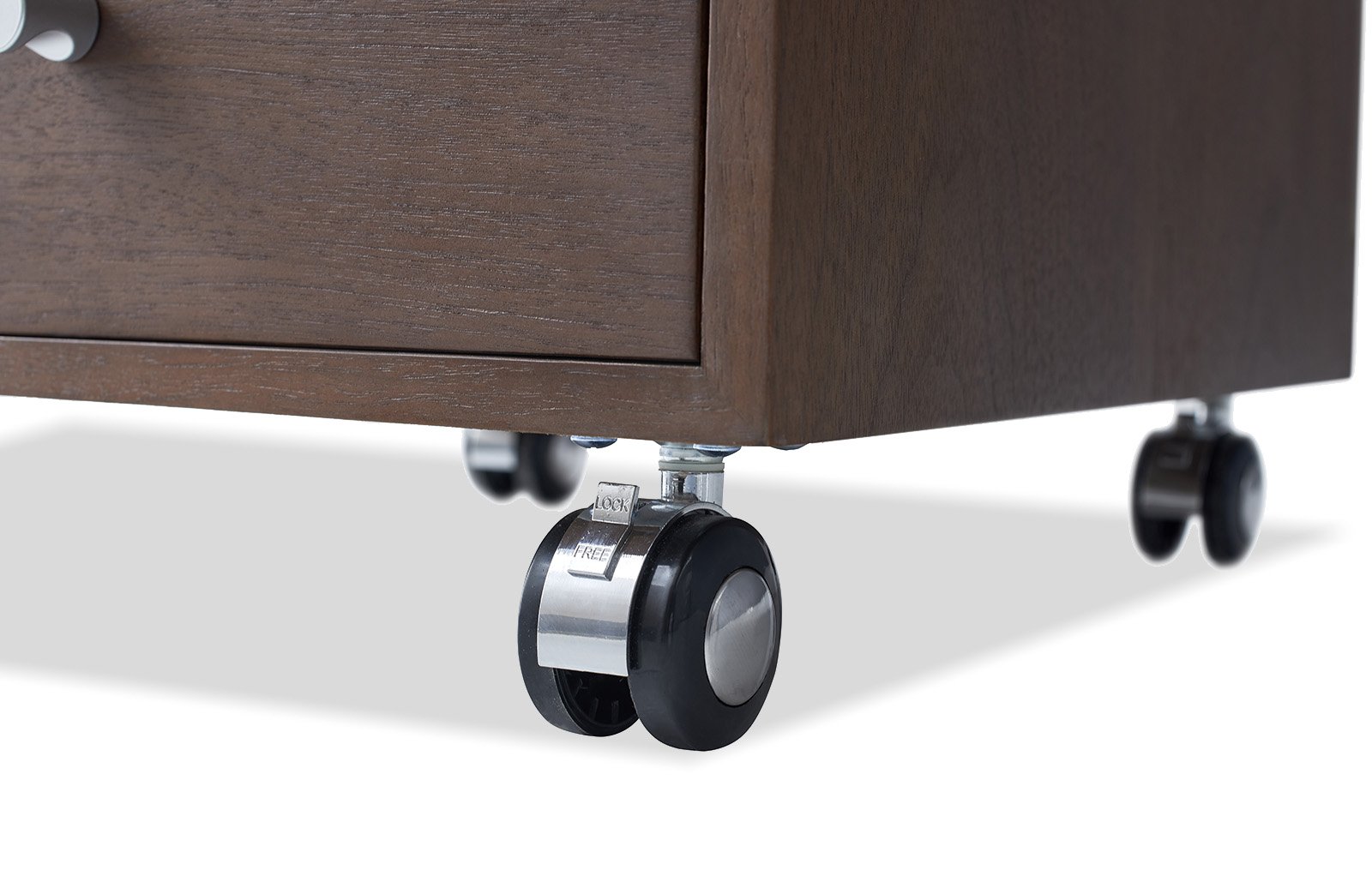 Высота двух частей - разная (75 см и 60 см). Тумба, шпонированная орехом - на колесах. Ее можно поставить так, как удобнее в данный момент. В трех выдвижных ящиках с минималистичными ручками разместится масса нужных вещей.