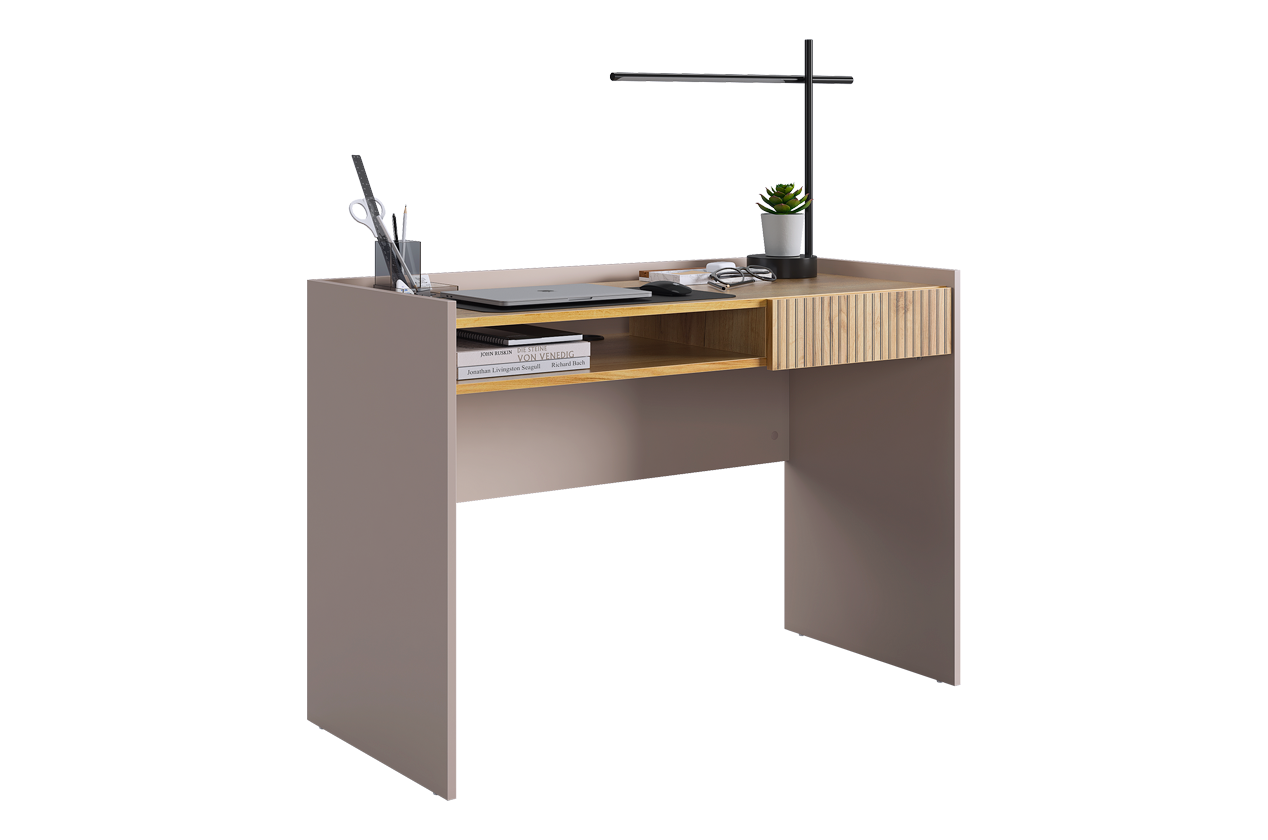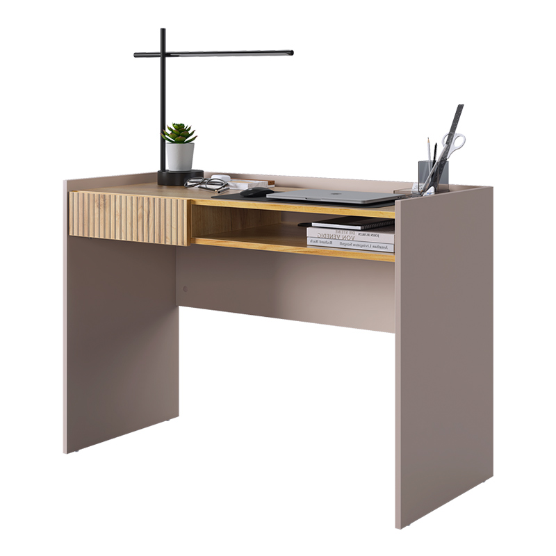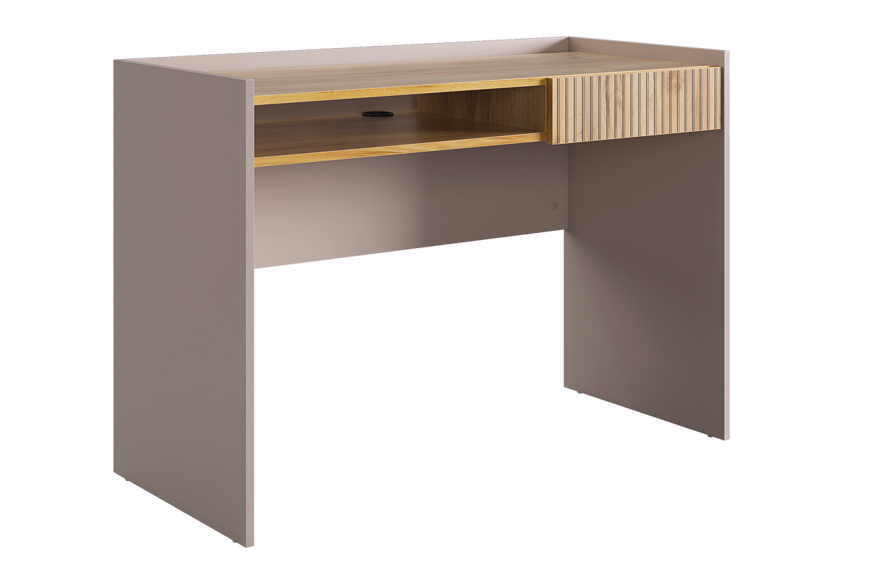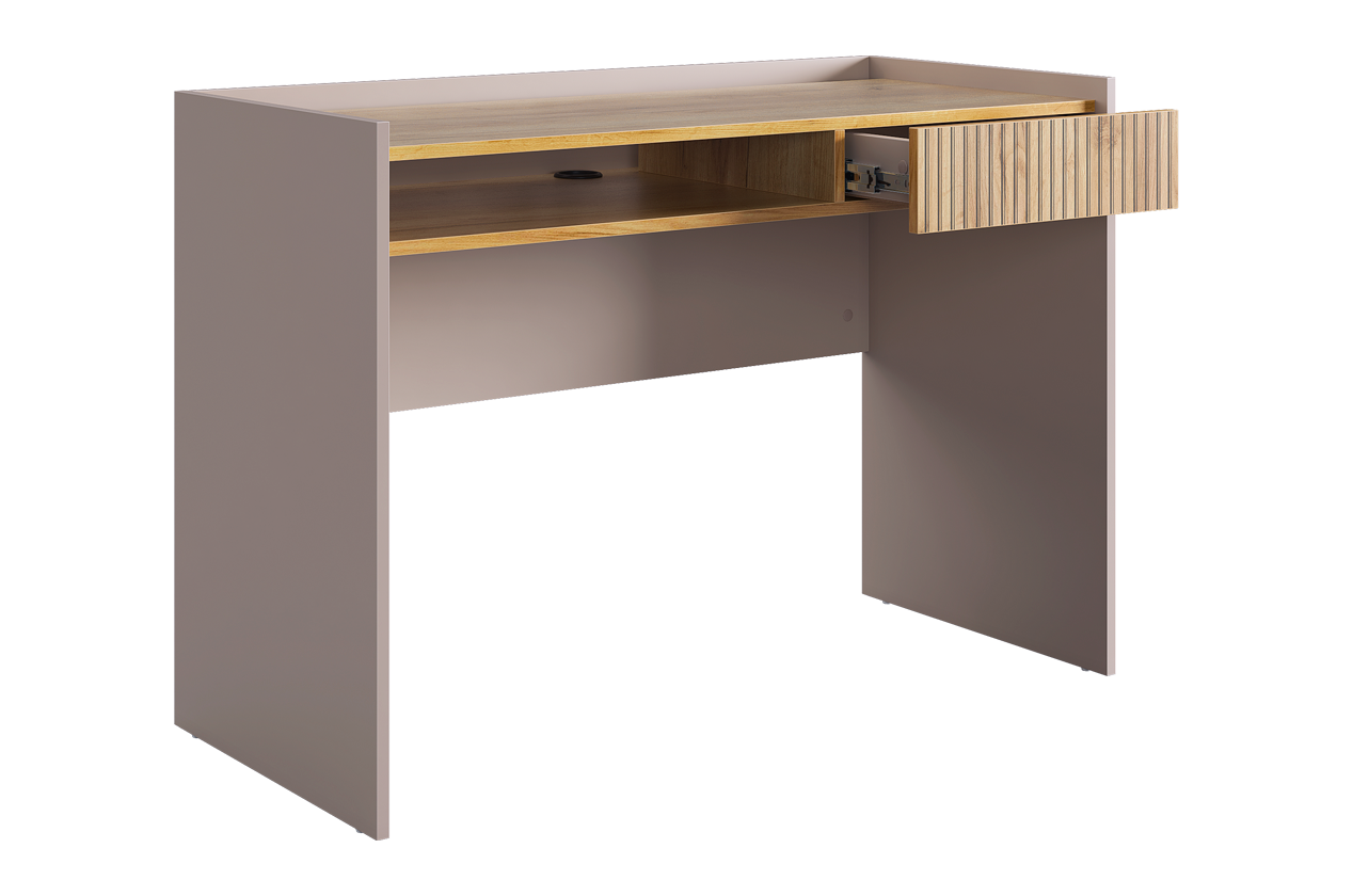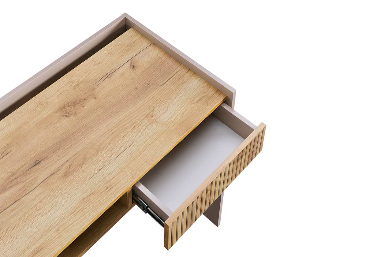 Корпус стола выполнен в цвете кашемир, что придает ему современный и спокойный вид, легко сочетающийся с любым интерьером. Выкатной ящик в цвете "дуб крафт золотой", декорирован принтом, имитирующим вертикальную фрезеровку, что добавляет столу уникальности и роскоши.