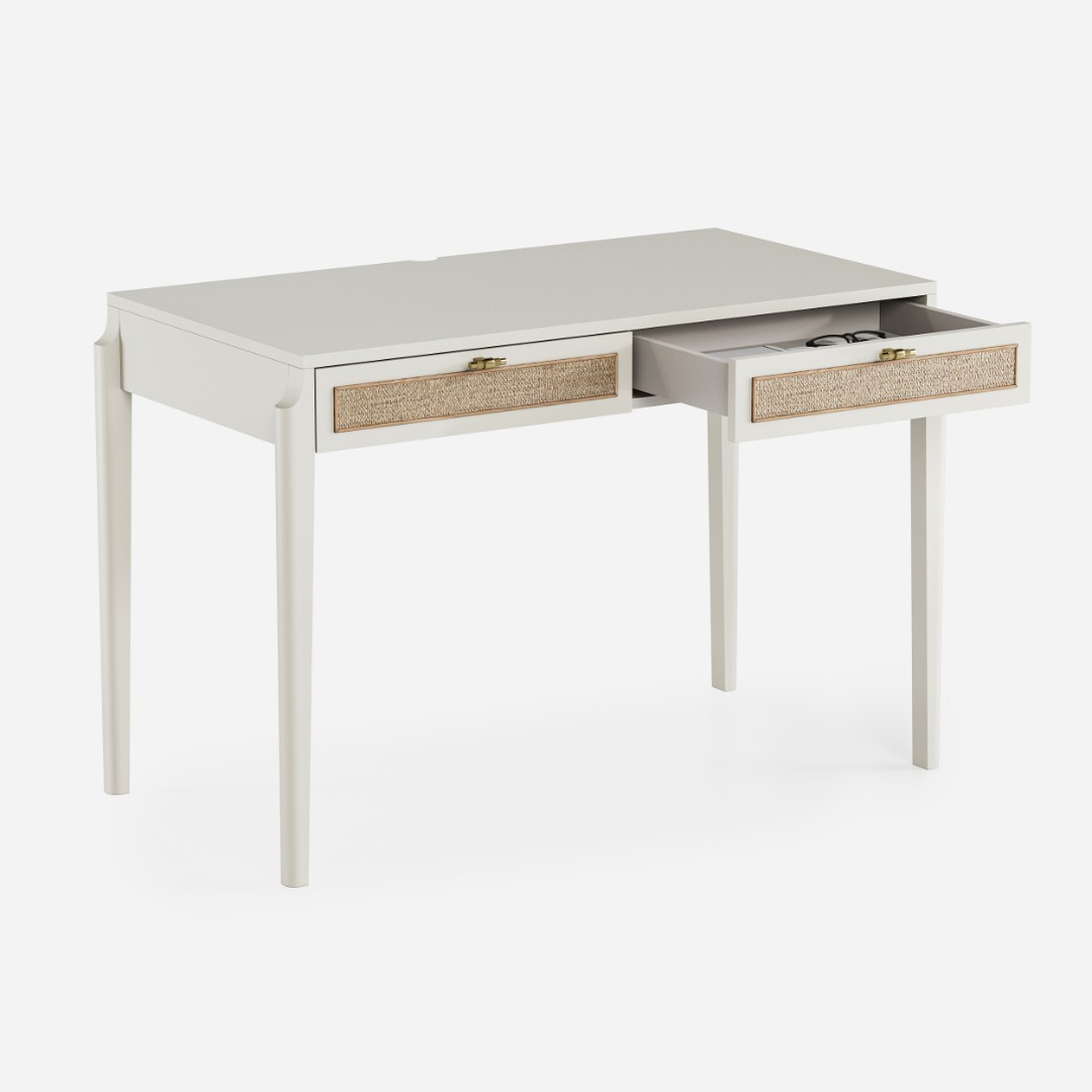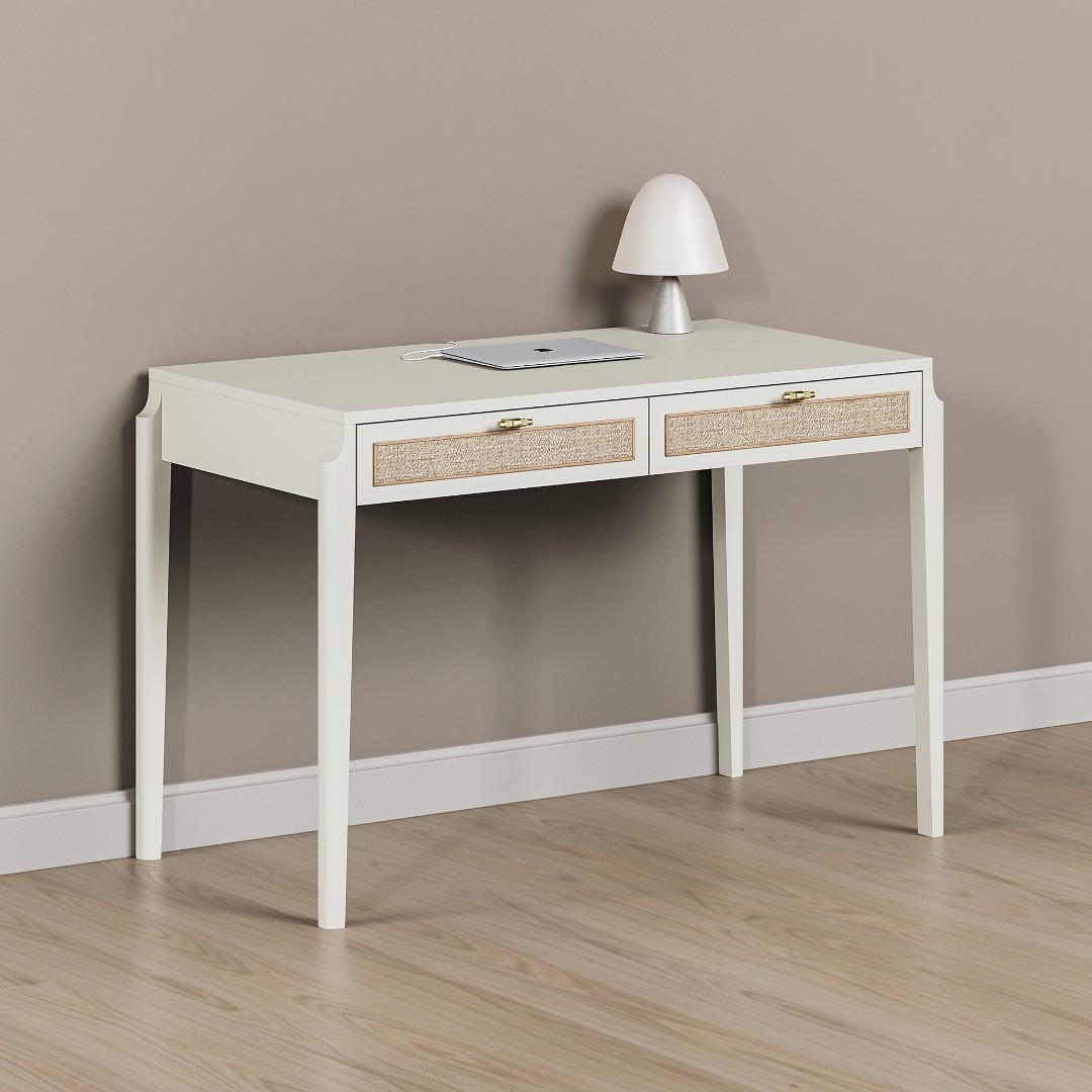 Запросить индивидуальное предложениеВ основе дизайна коллекции Vishera – оригинальный фасадный декор, выполненный из натурального ротангового полотна. Естественная плетеная фактура ротанга придает мебели легкое очарование, свойственное традиционным ремесленным техникам, а природные текстуры и натуральные оттенки отделки создают неповторимую гармонию, теплоту и уют. Коллекция Vishera - это гармония натуральных текстур, легкости и мягкого минимализма. Мебель из коллекции органично дополнит ваш интерьер, будь то скандинавский стиль, soft-minimal, japandi или даже бохо. Эргономика стола разработана таким образом, чтобы работать за ним было максимально комфортно. Пространство для ног позволяет комфортно сидеть даже человеку с ростом до 195см.Два неглубоких, но вместительных ящика позволят разместить в них книги, ноутбук, планшет, альбом для рисования, канцелярские принадлежности, оставив таким образом рабочую поверхность стола свободной и удобной для работы.